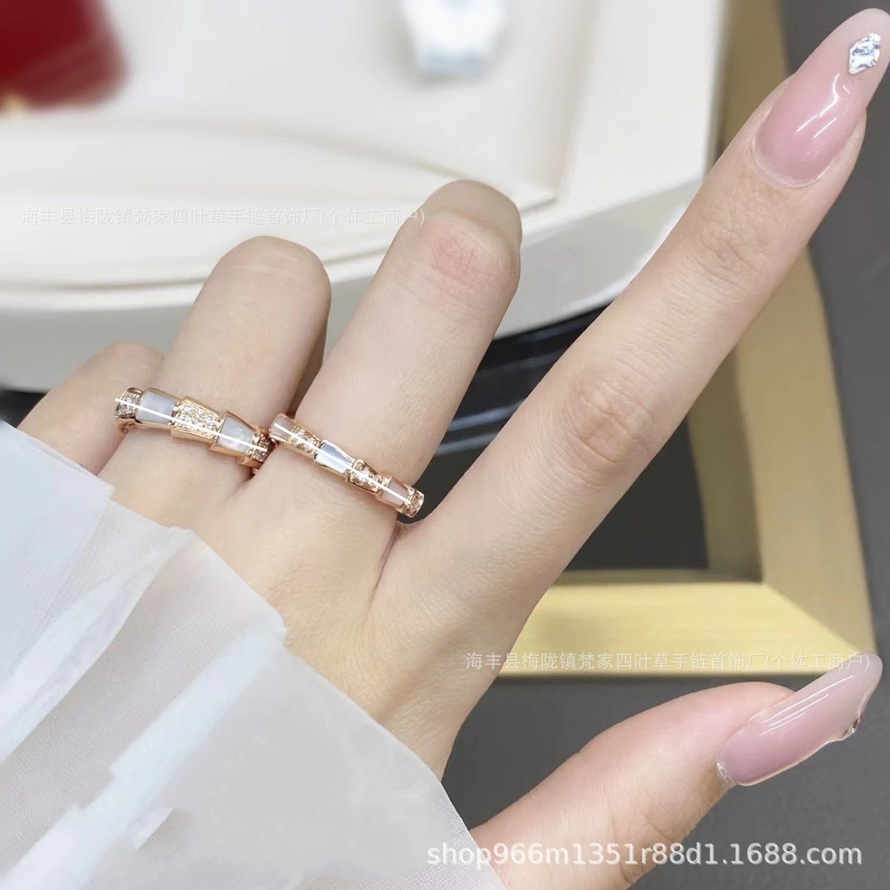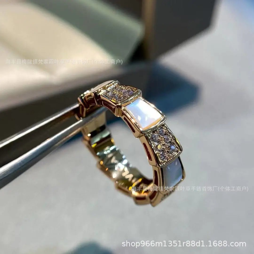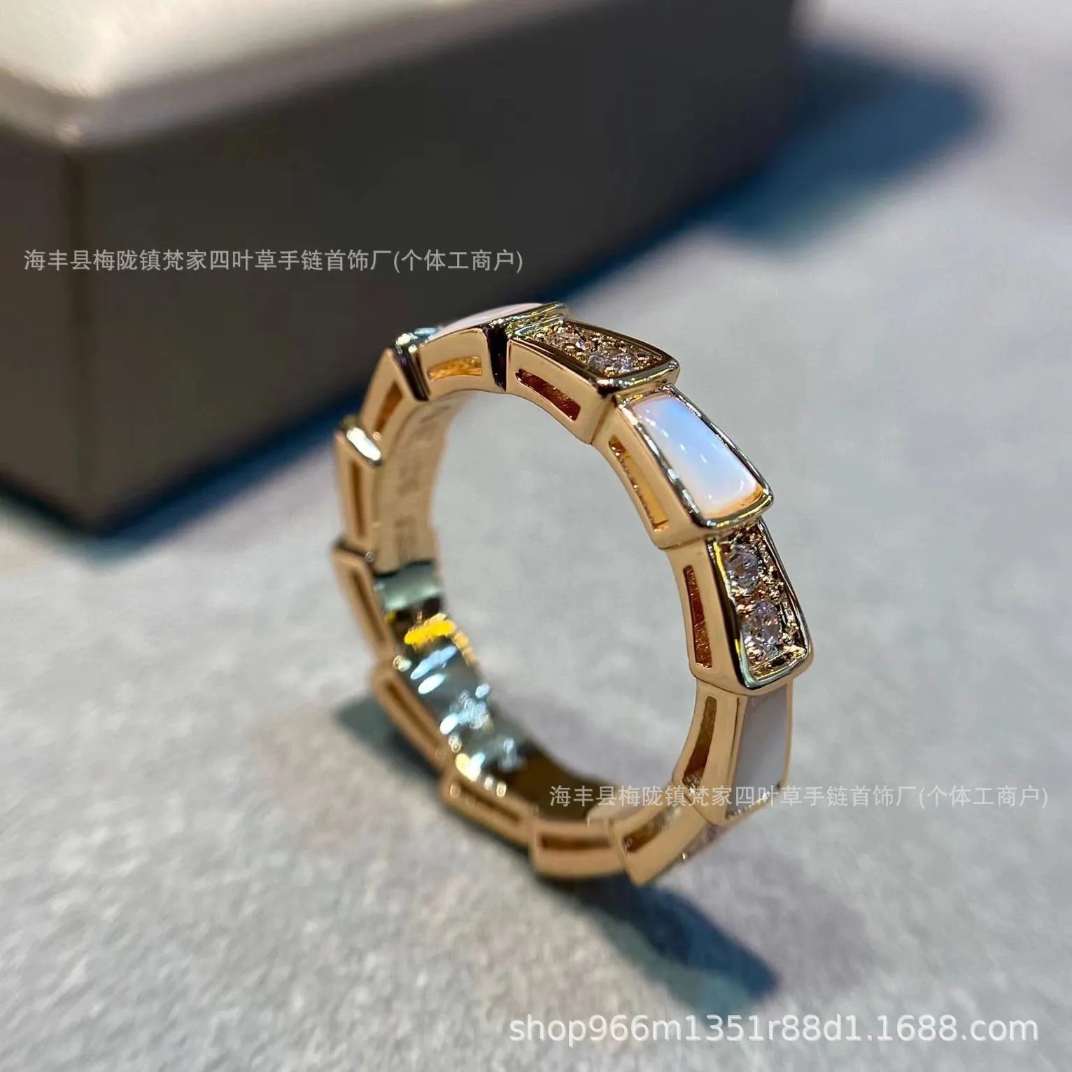 宝家白贝母戒指女设计18K玫瑰金高级感镶钻网红时尚蛇骨指环