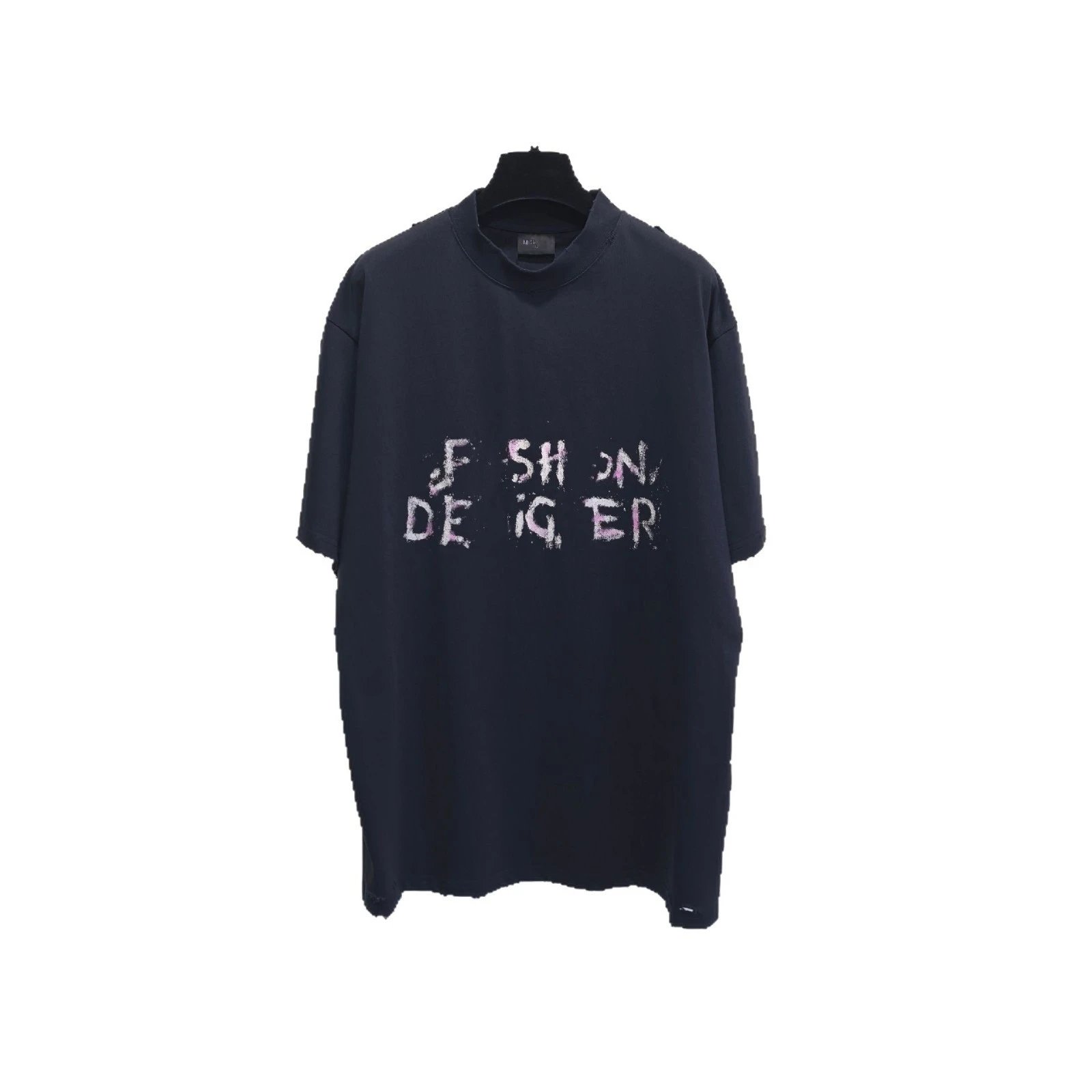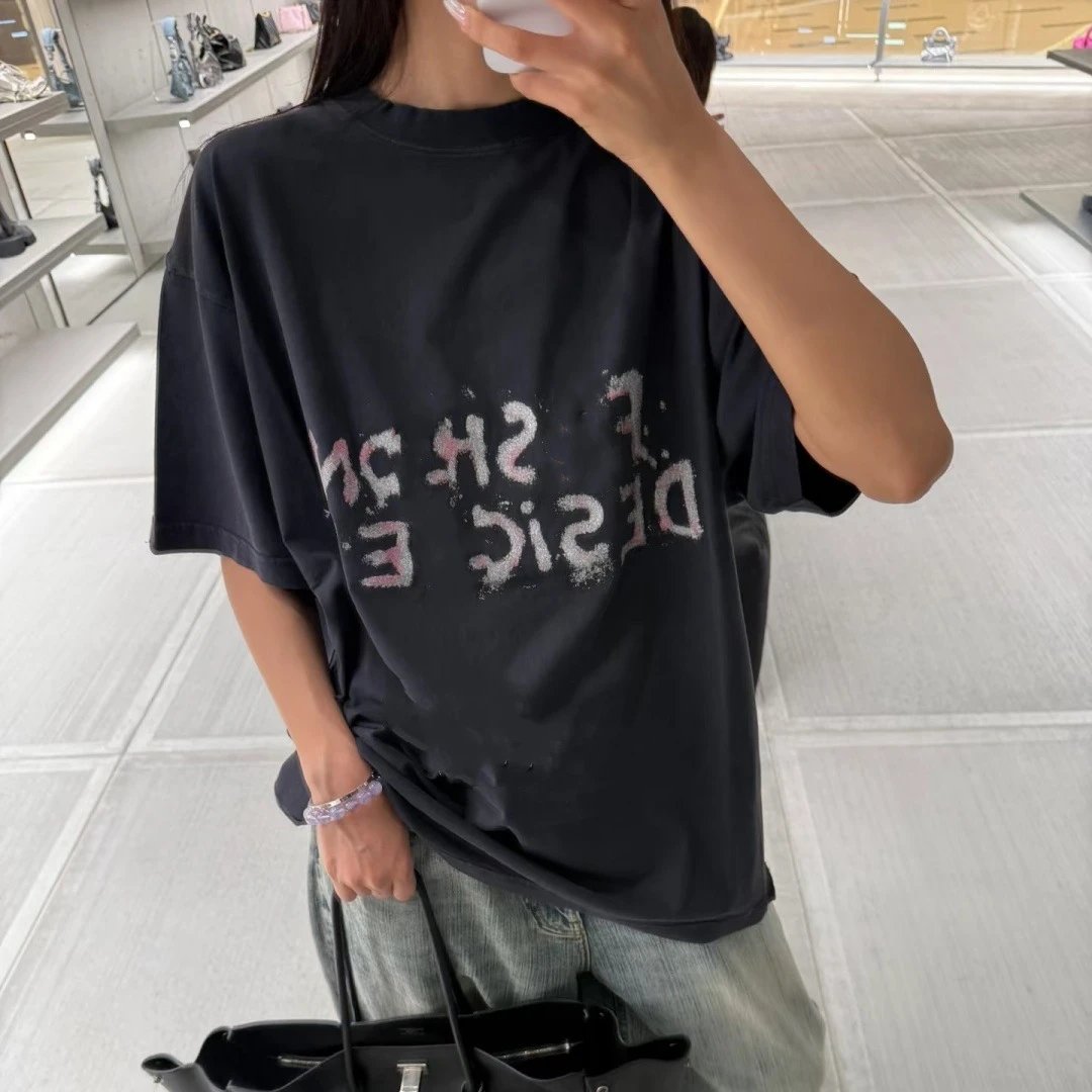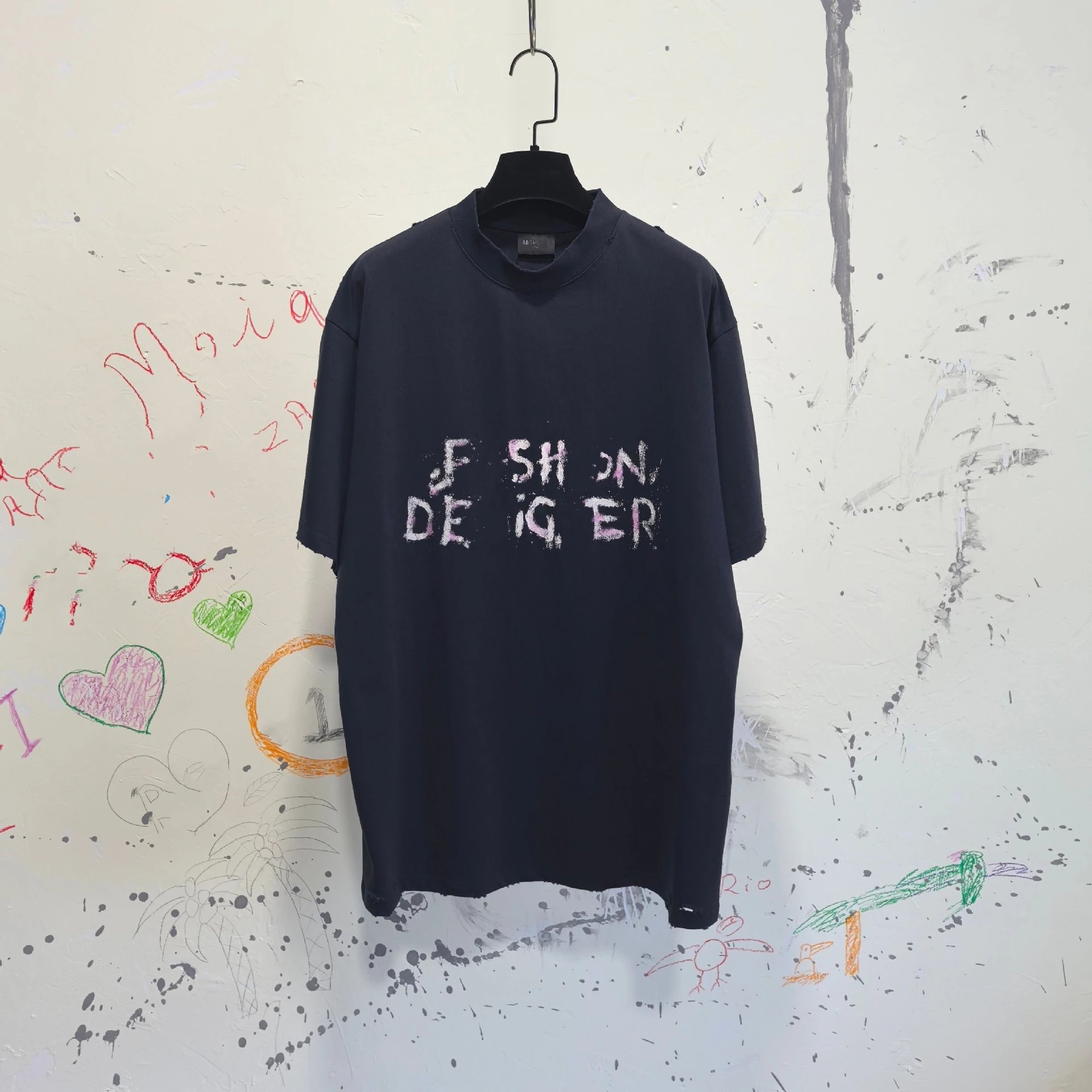 2025夏季新款巴黎B家字母涂鸦廓形T恤磨破小领口短袖男女