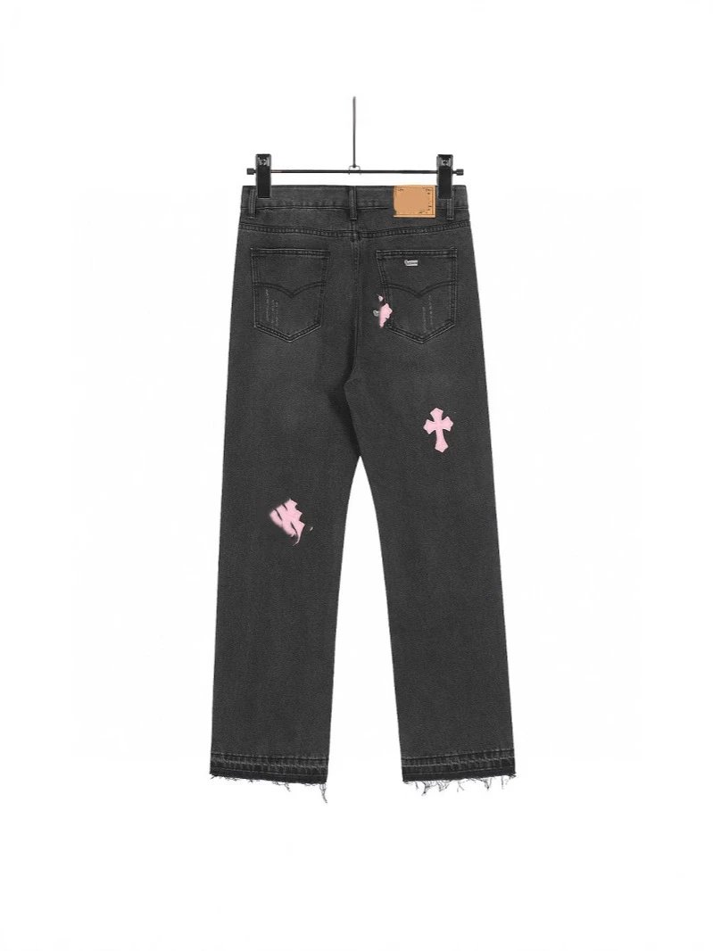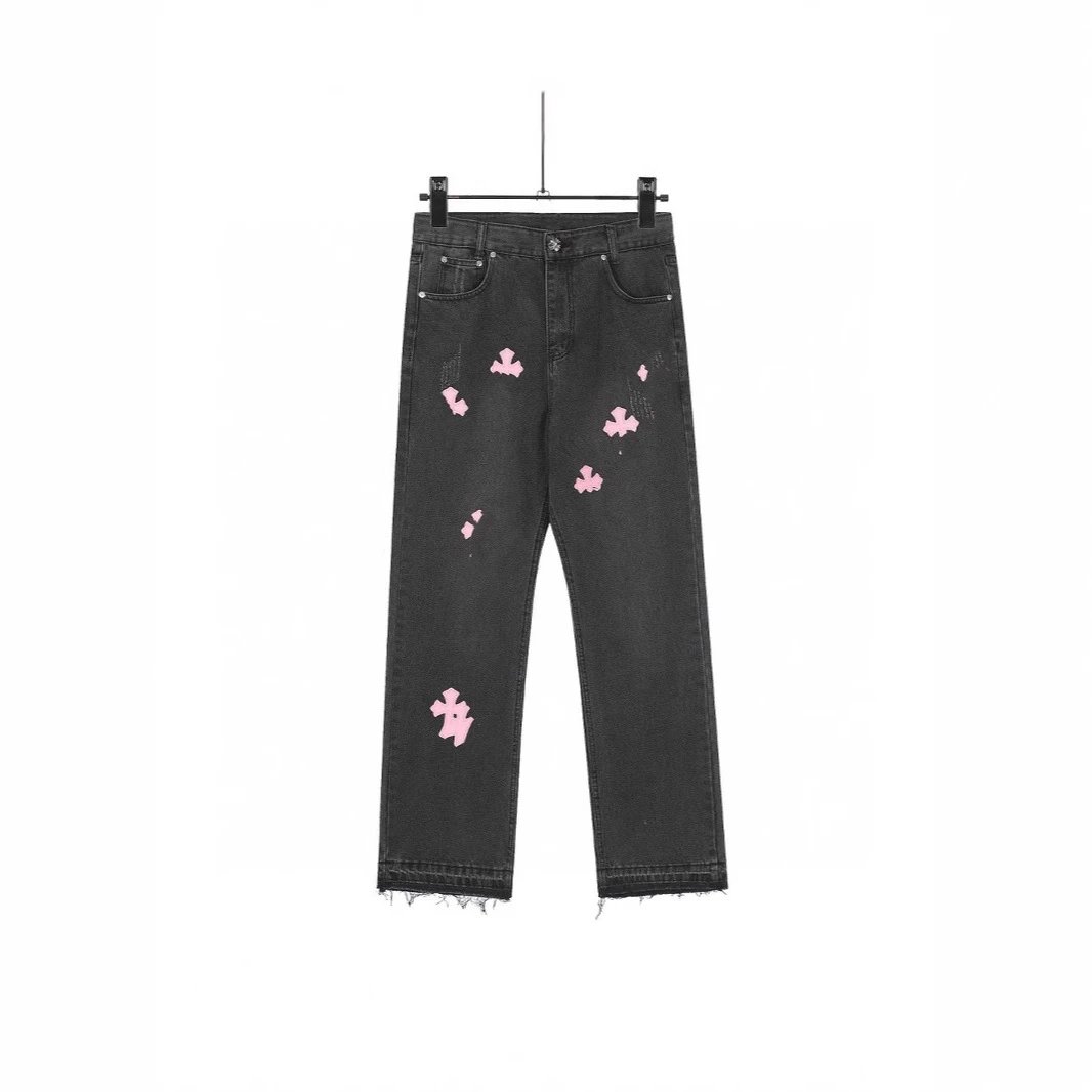 24SS新款CH经典黑裤粉十字贴皮牛仔裤宽松 休闲百搭潮流男女款潮