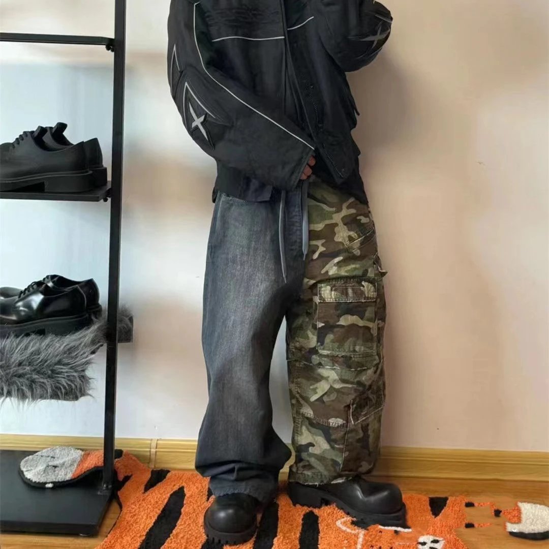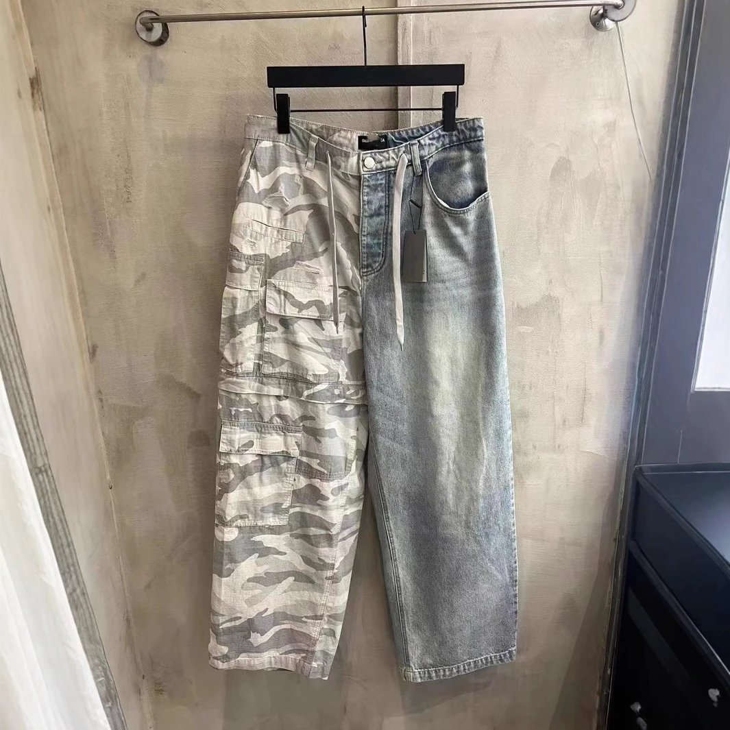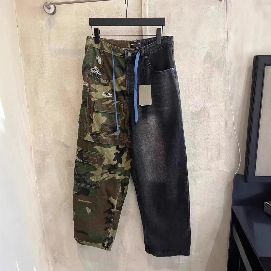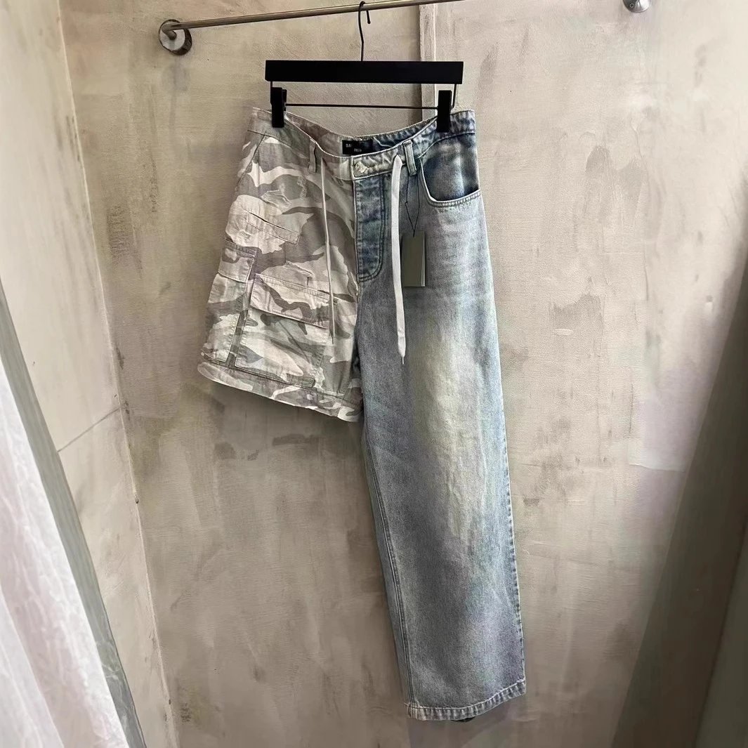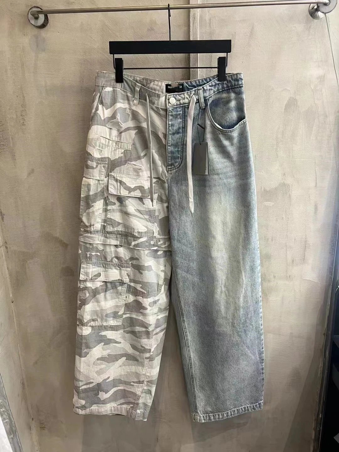 巴黎B家迷彩色织格子布工装裤拼接牛仔面料宽松可拆卸长裤