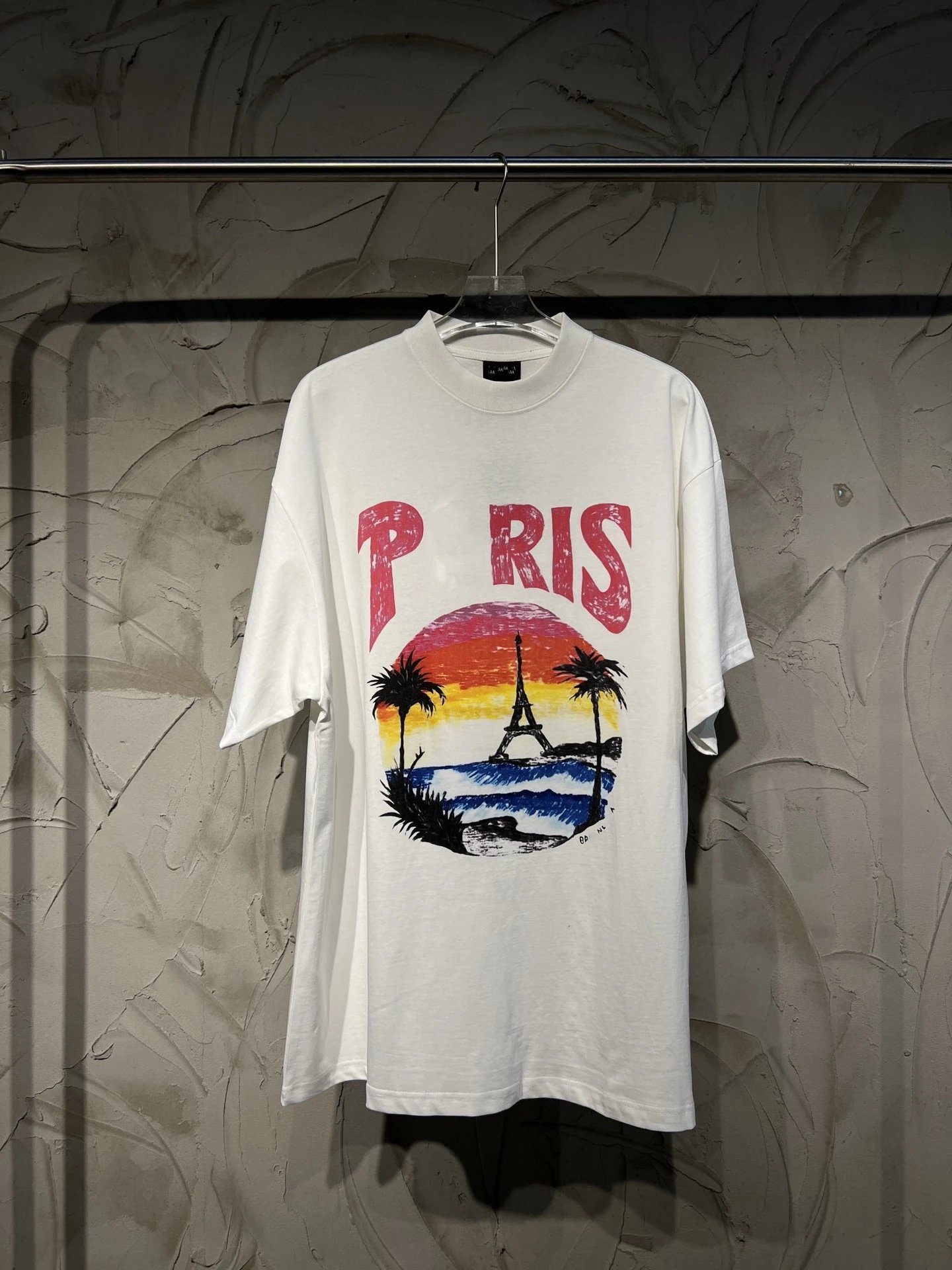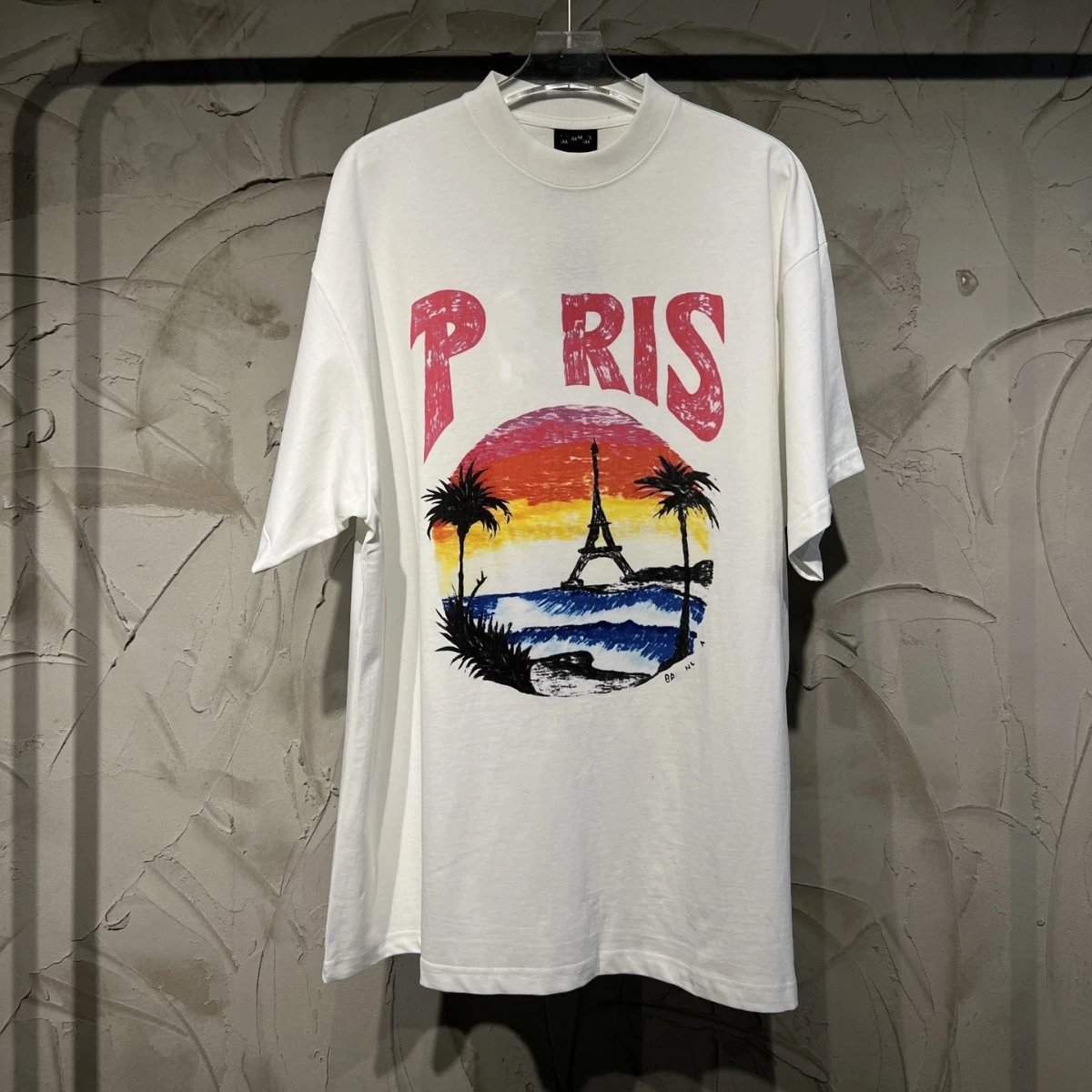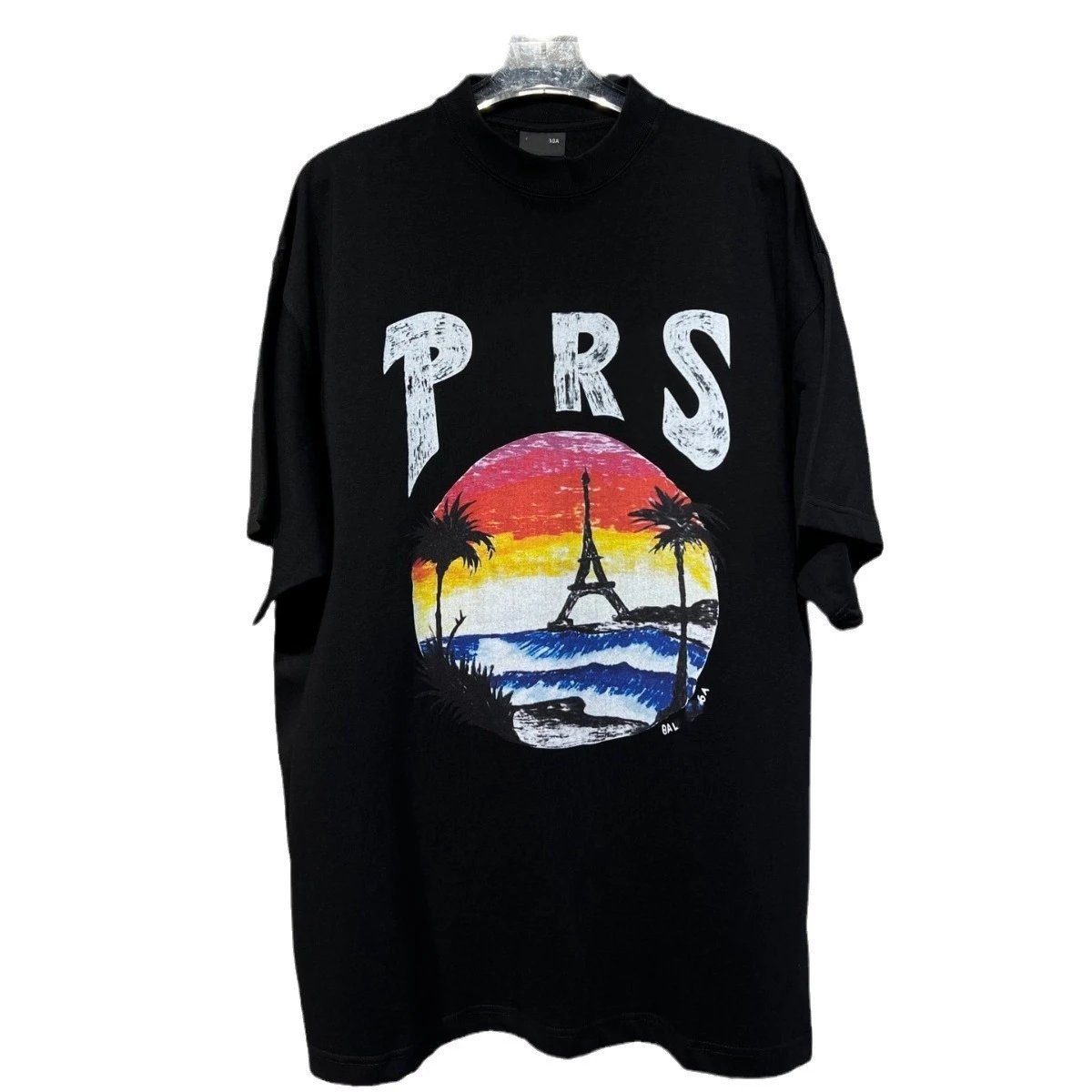 新款巴黎B家夏威夷椰树铁塔手绘字母印花小领口短袖