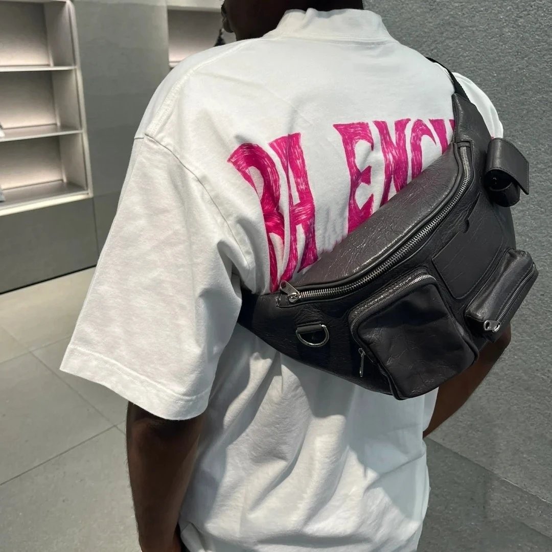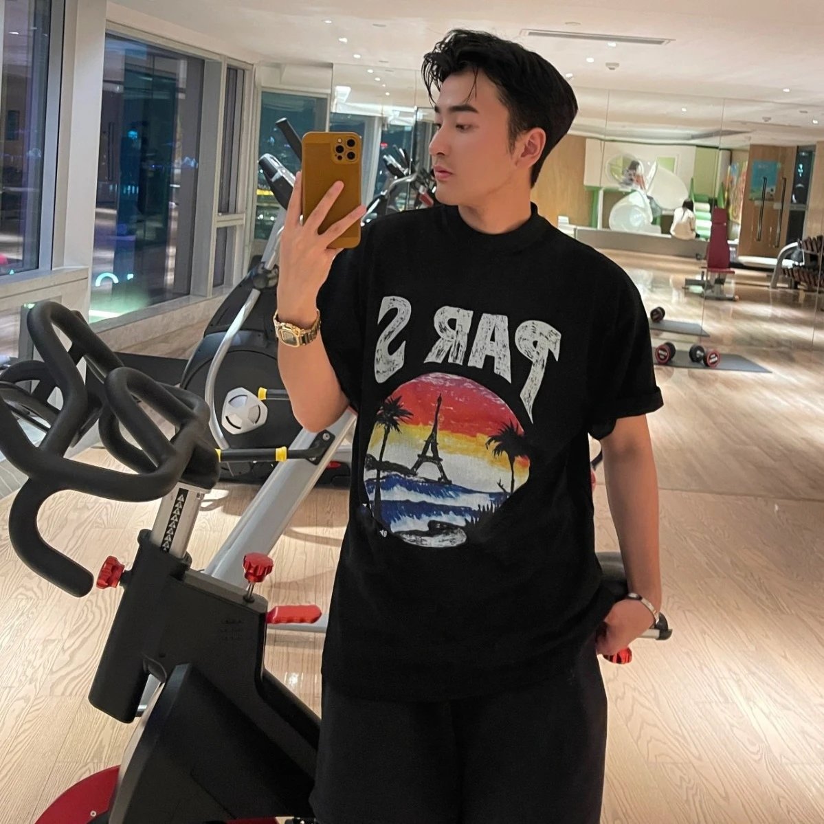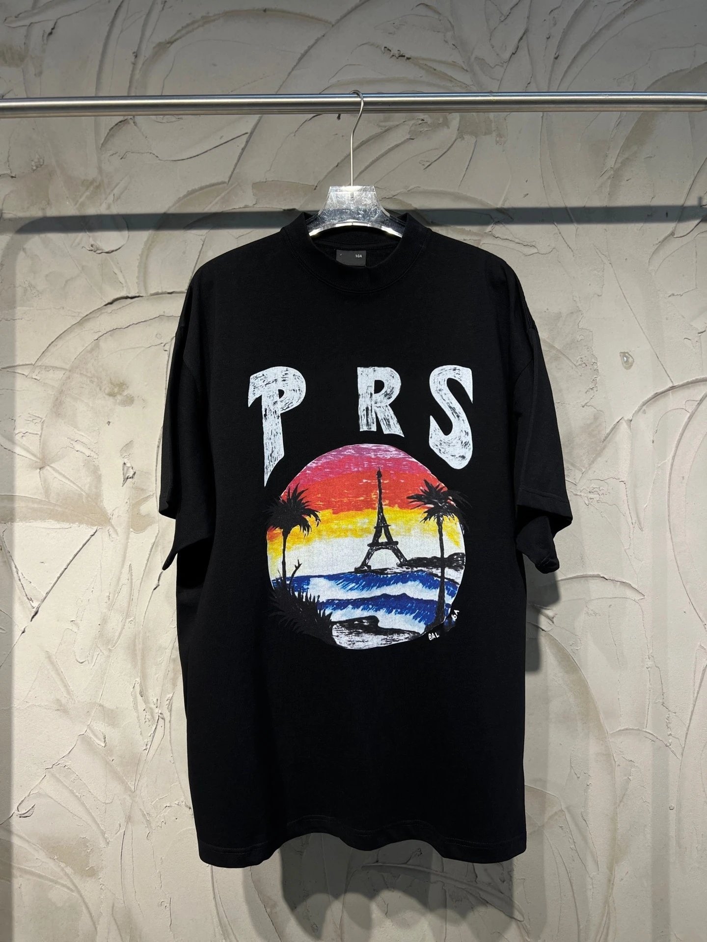 新款巴黎B家夏威夷椰树铁塔手绘字母印花小领口短袖
