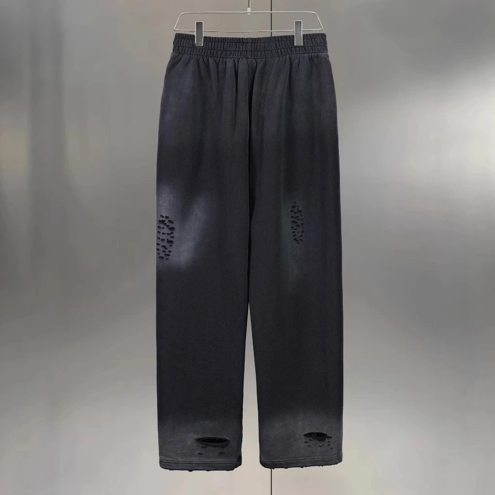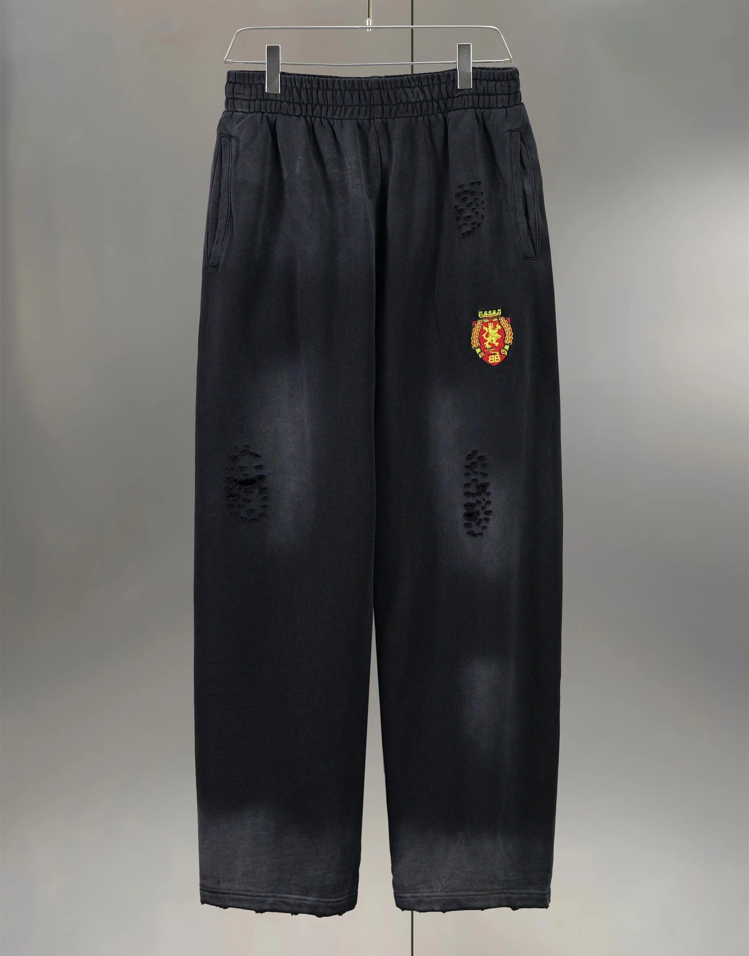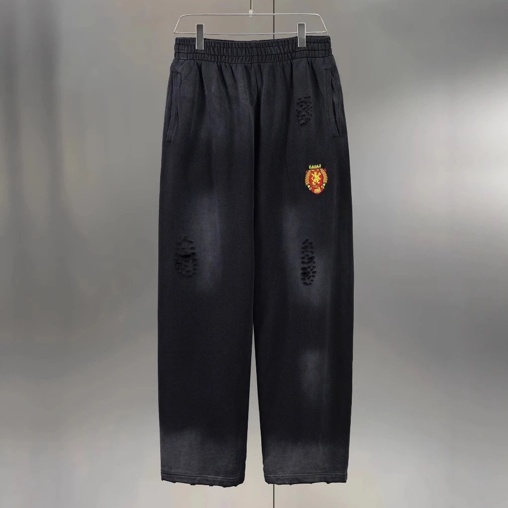 巴黎B家曼联盾牌刺绣网红款水洗做旧破洞破坏直筒长裤卫裤