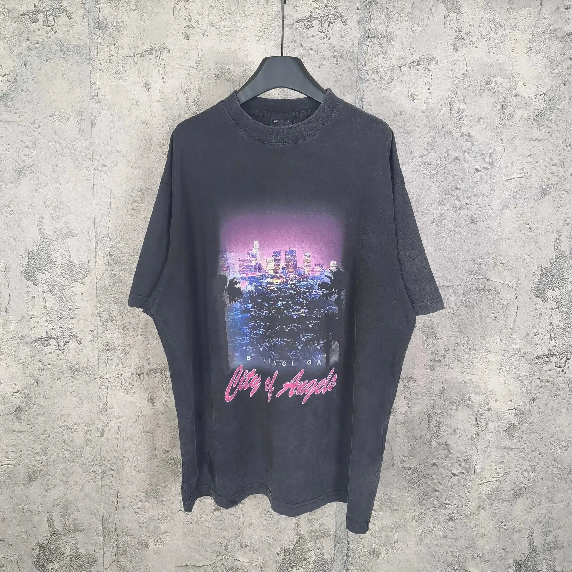 巴黎B家天使之城洛杉矶夜景直喷印花圆领短袖T恤