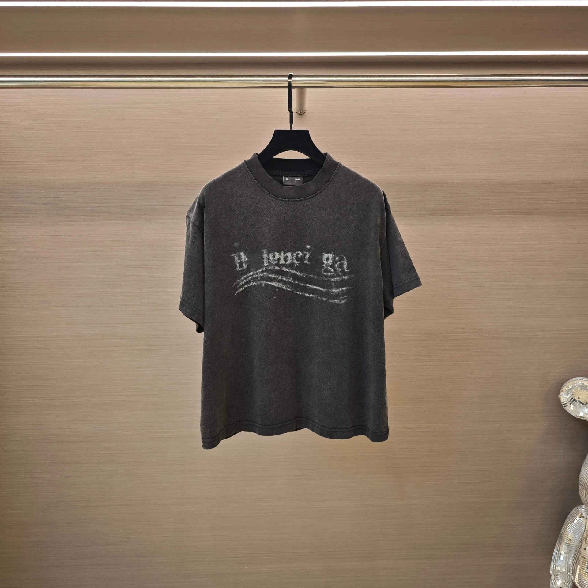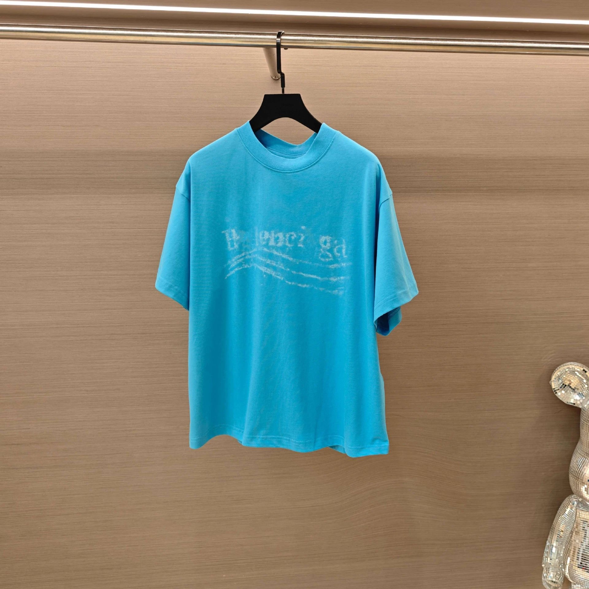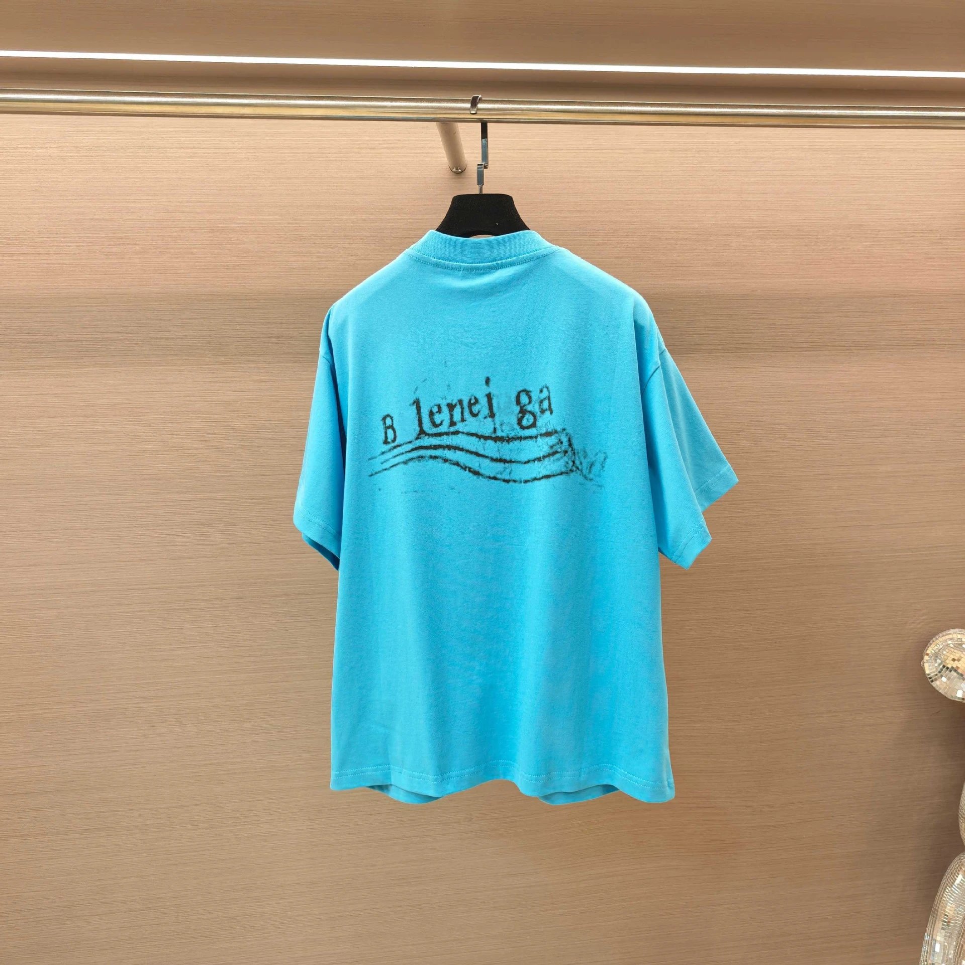 巴黎B家喷墨水印可乐海浪新款洗水短款短袖T恤男女