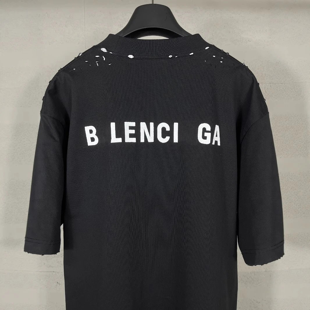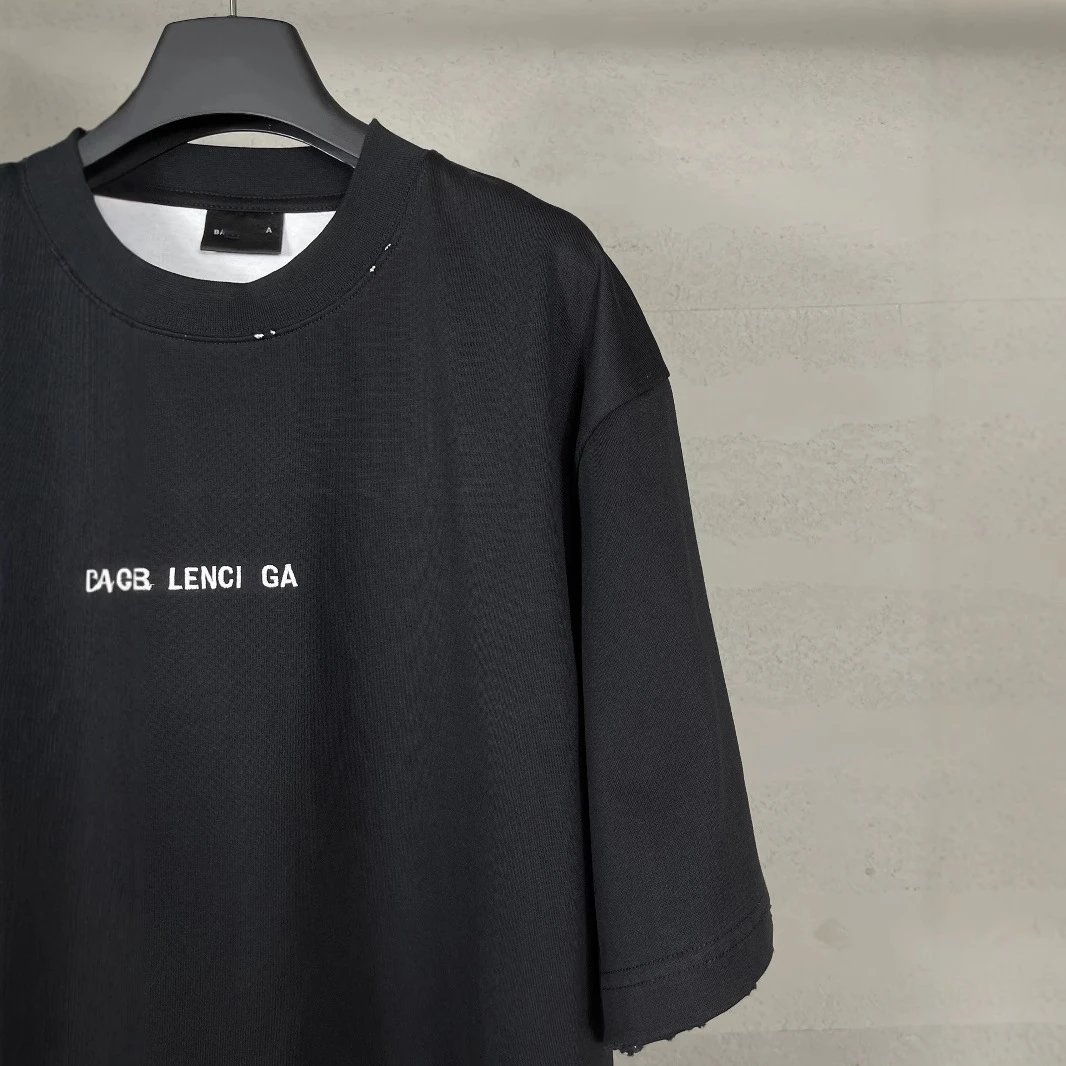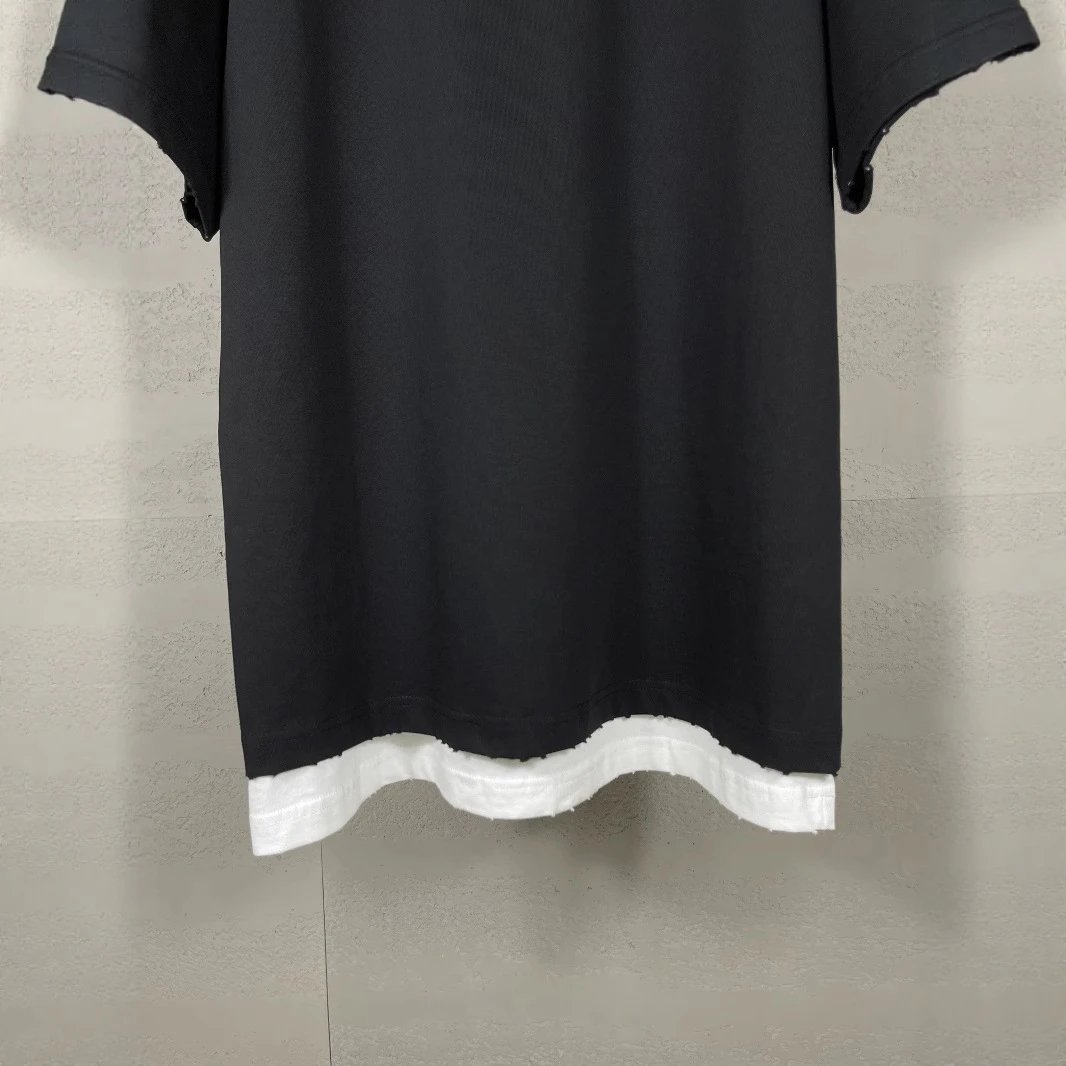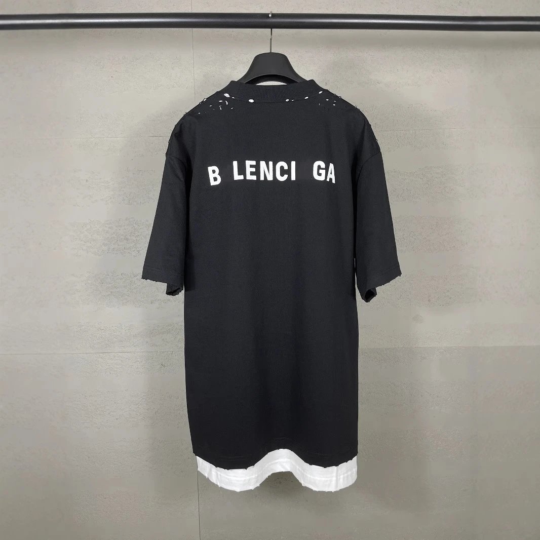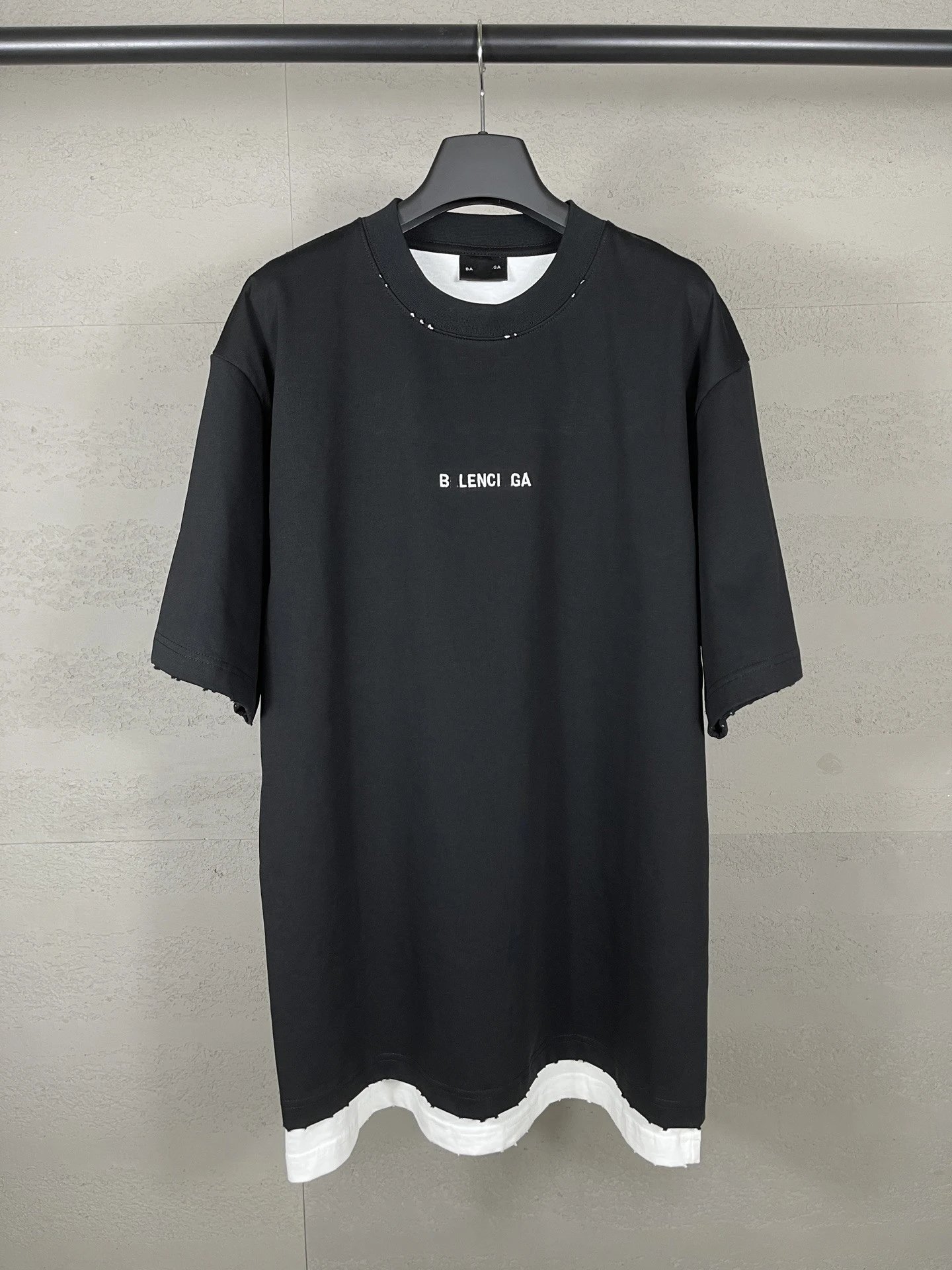 巴黎B家刺绣字母双层两件套洗水磨烂做旧短袖T恤男女