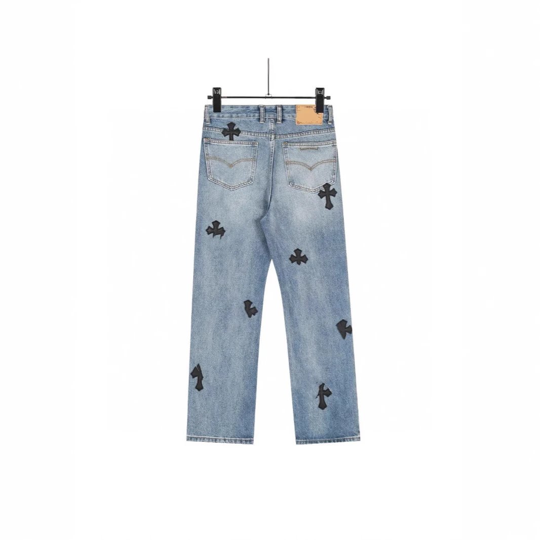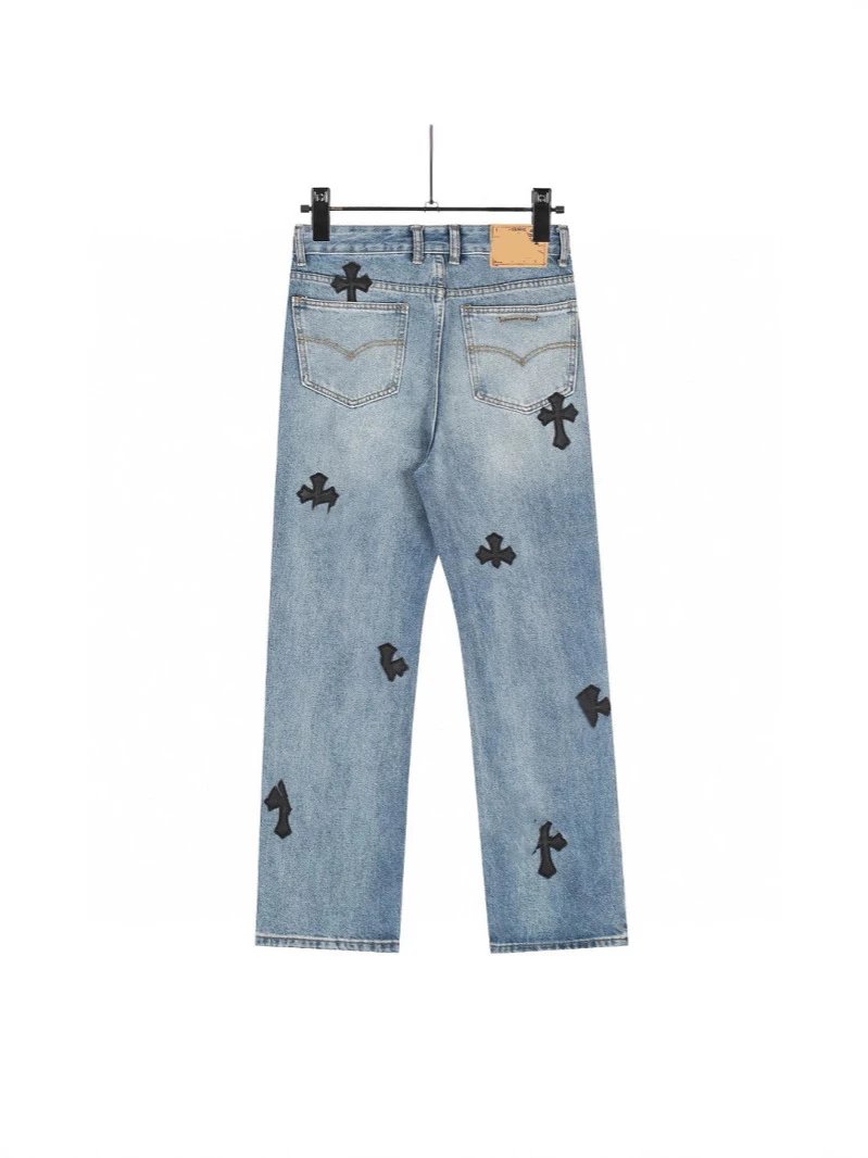 CH经典蓝裤黑十字贴皮牛仔裤休闲宽松百搭潮流贴皮水洗长裤
