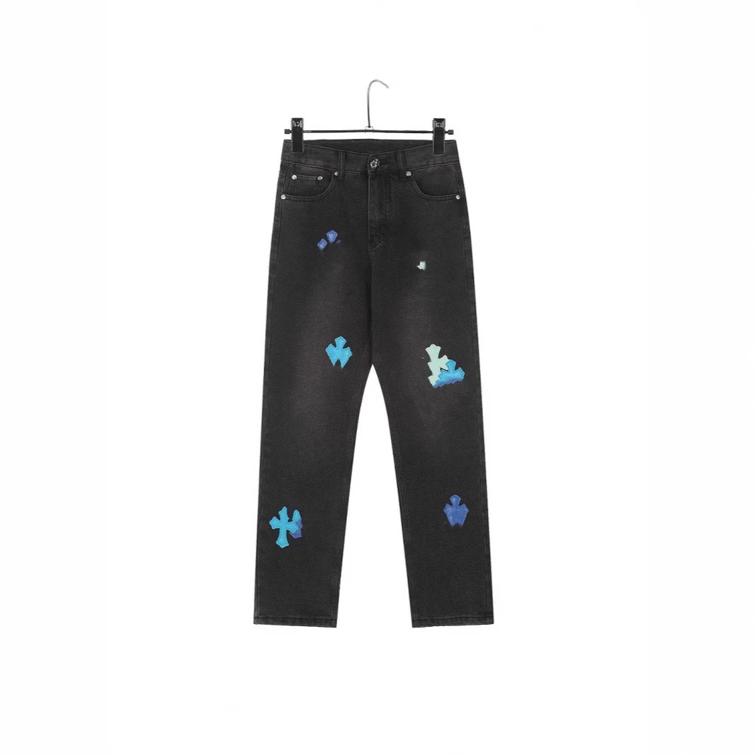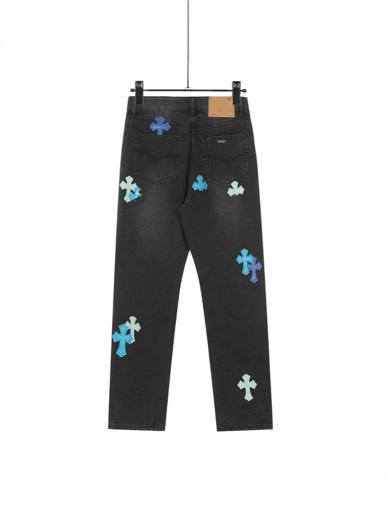 秋冬CH伦敦蓝色拼皮十字架同款牛仔裤男女款情侣款潮流宽松休闲