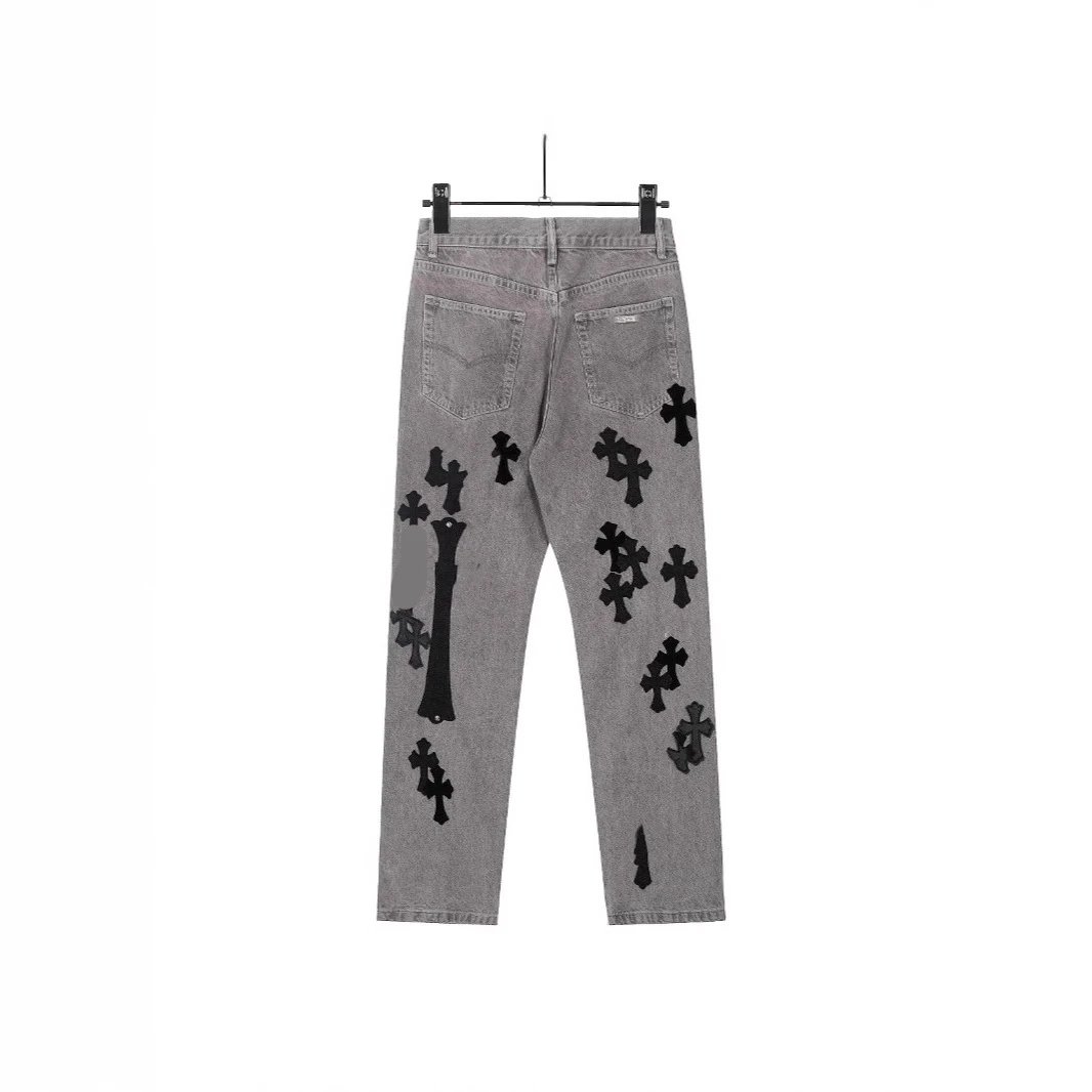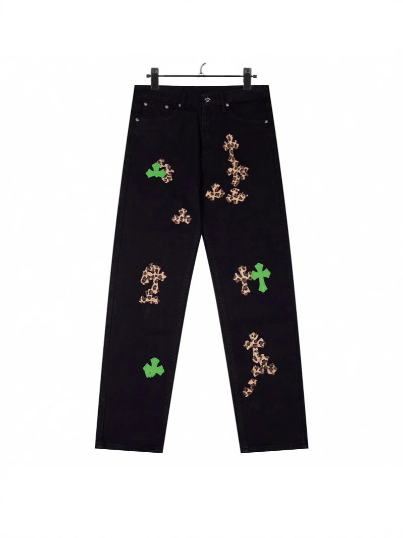 秋冬高街CH限定拼皮豹纹高街工装牛仔裤男女款潮流情侣款长裤