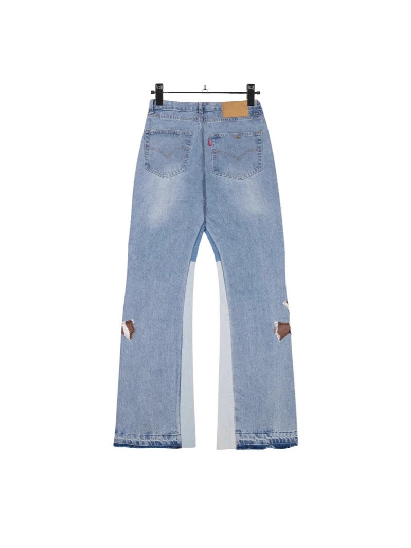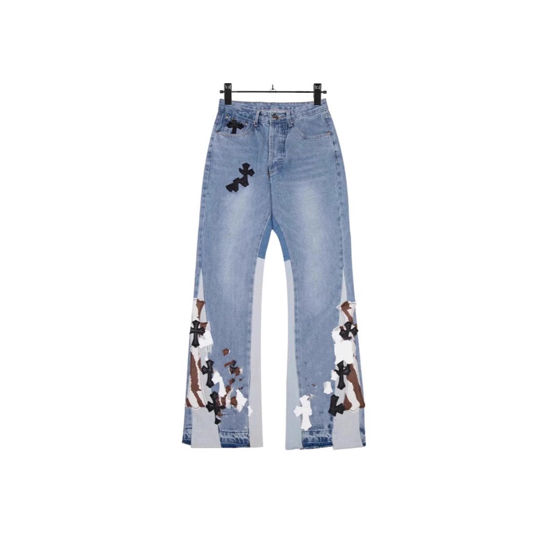 CH重工大马毛拼接喇叭贴皮牛仔裤潮牌皮标喇叭牛仔长裤男女款