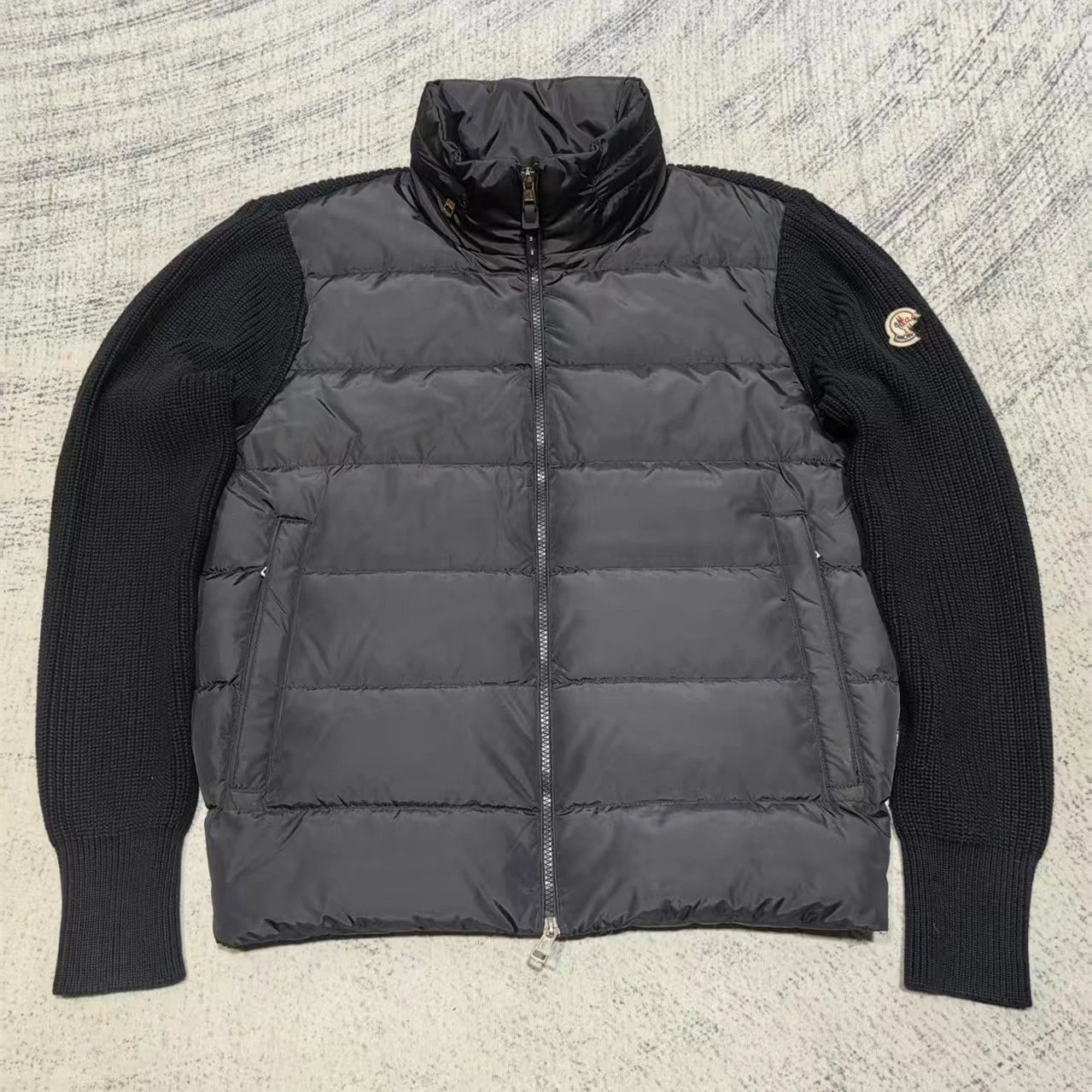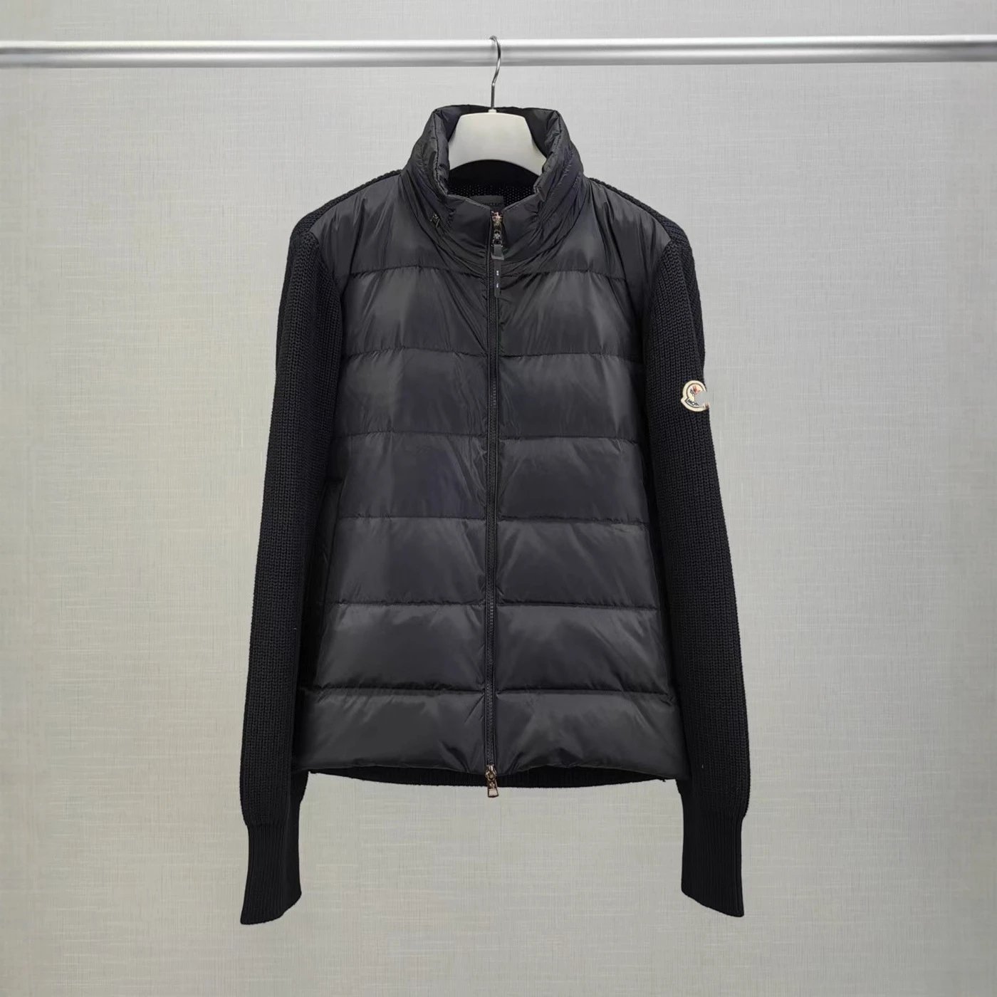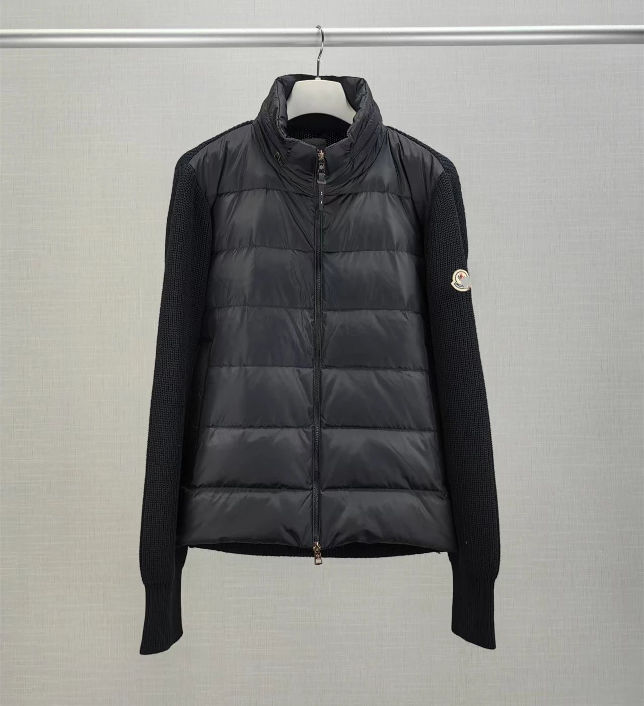 蒙家经典标LOGO刺绣拼接针织袖90鸭绒立领羽绒服外套男女