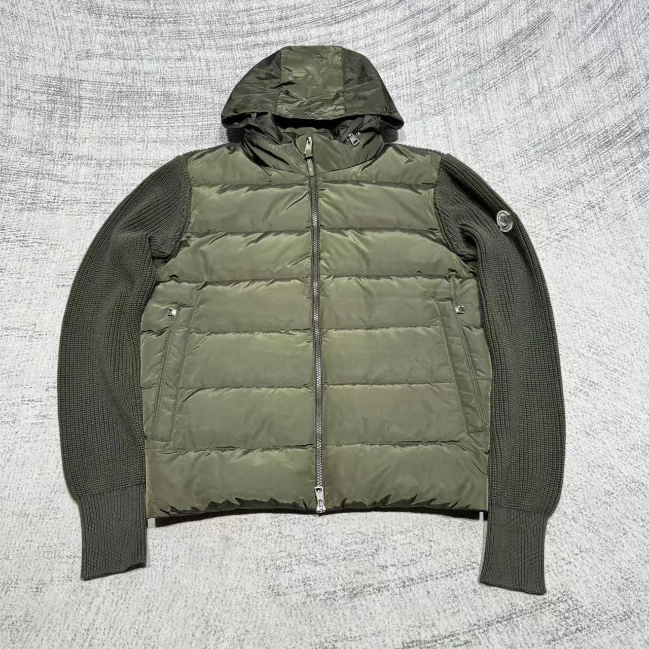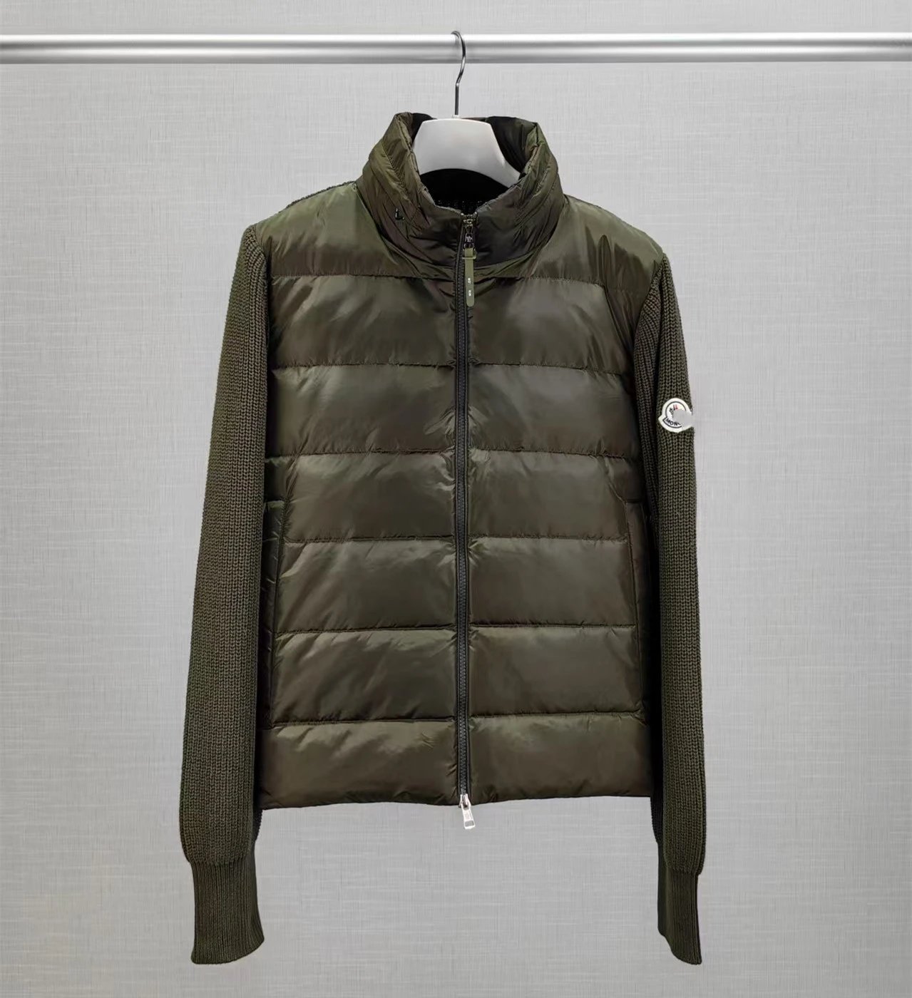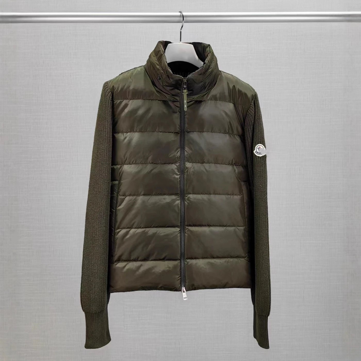 蒙家经典标LOGO刺绣拼接针织袖90鸭绒立领羽绒服外套男女