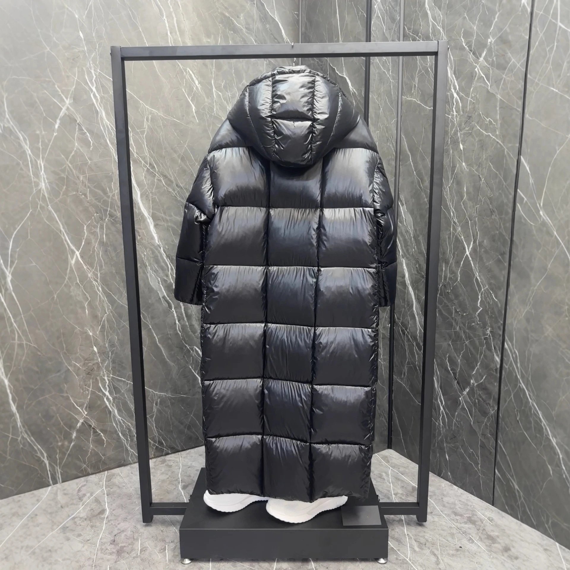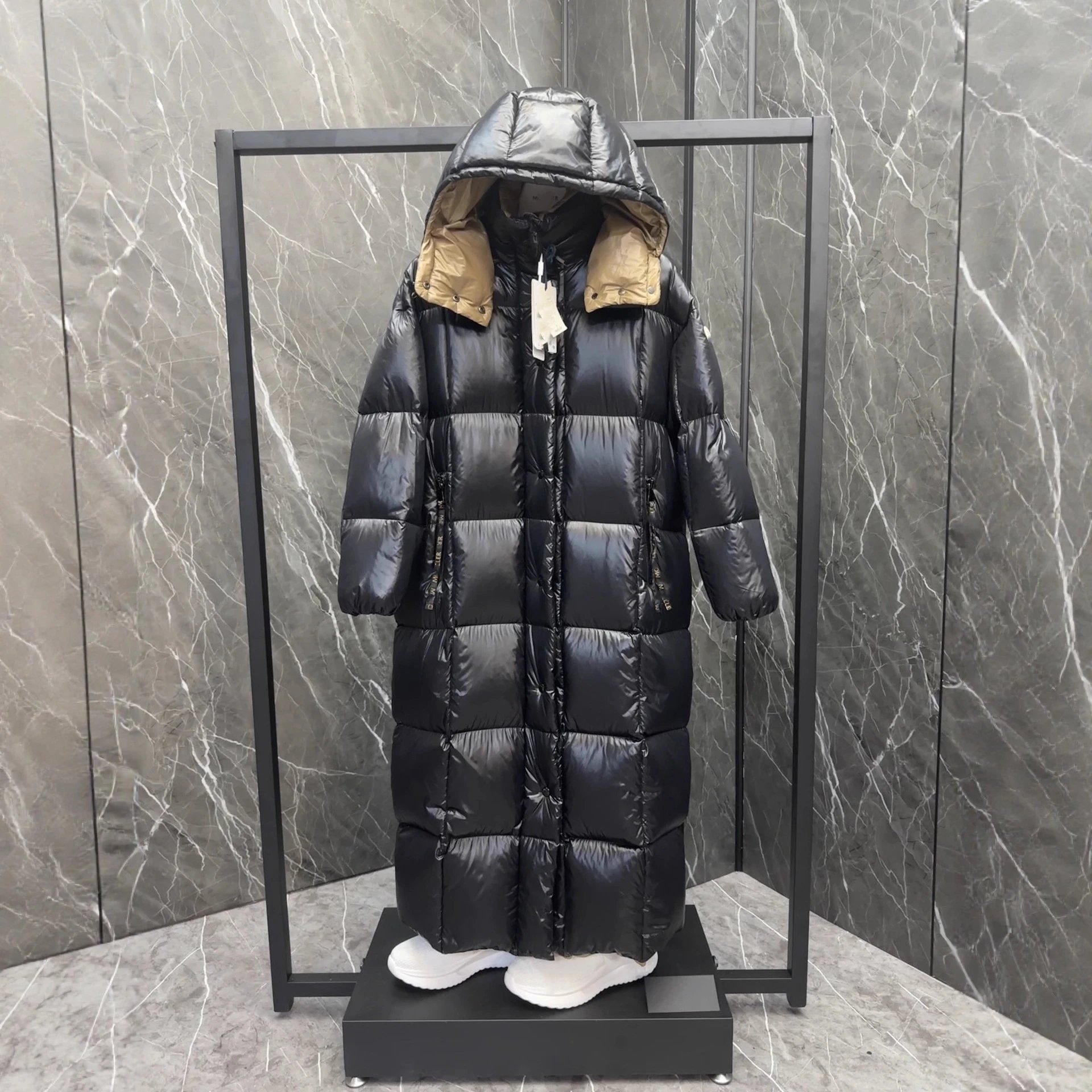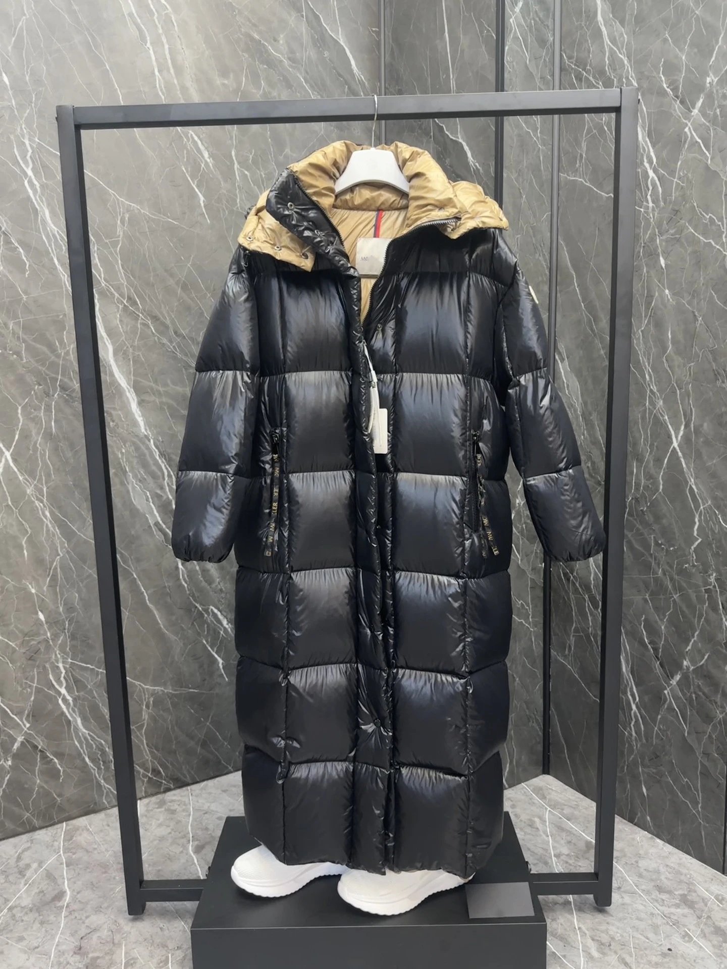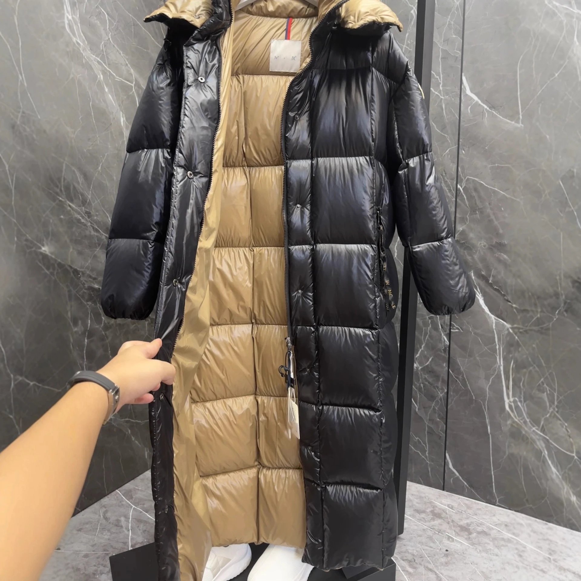 M蒙家闪亮漆面尼龙黑金撞色90白鸭绒长款女士羽绒服