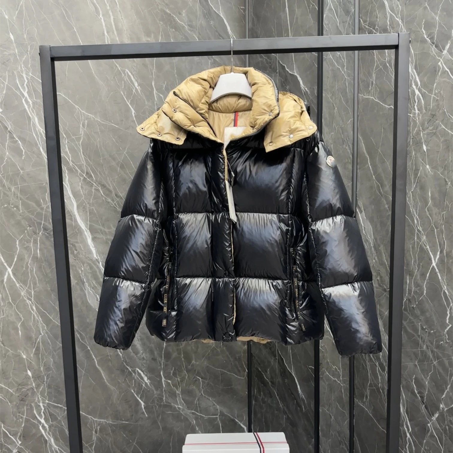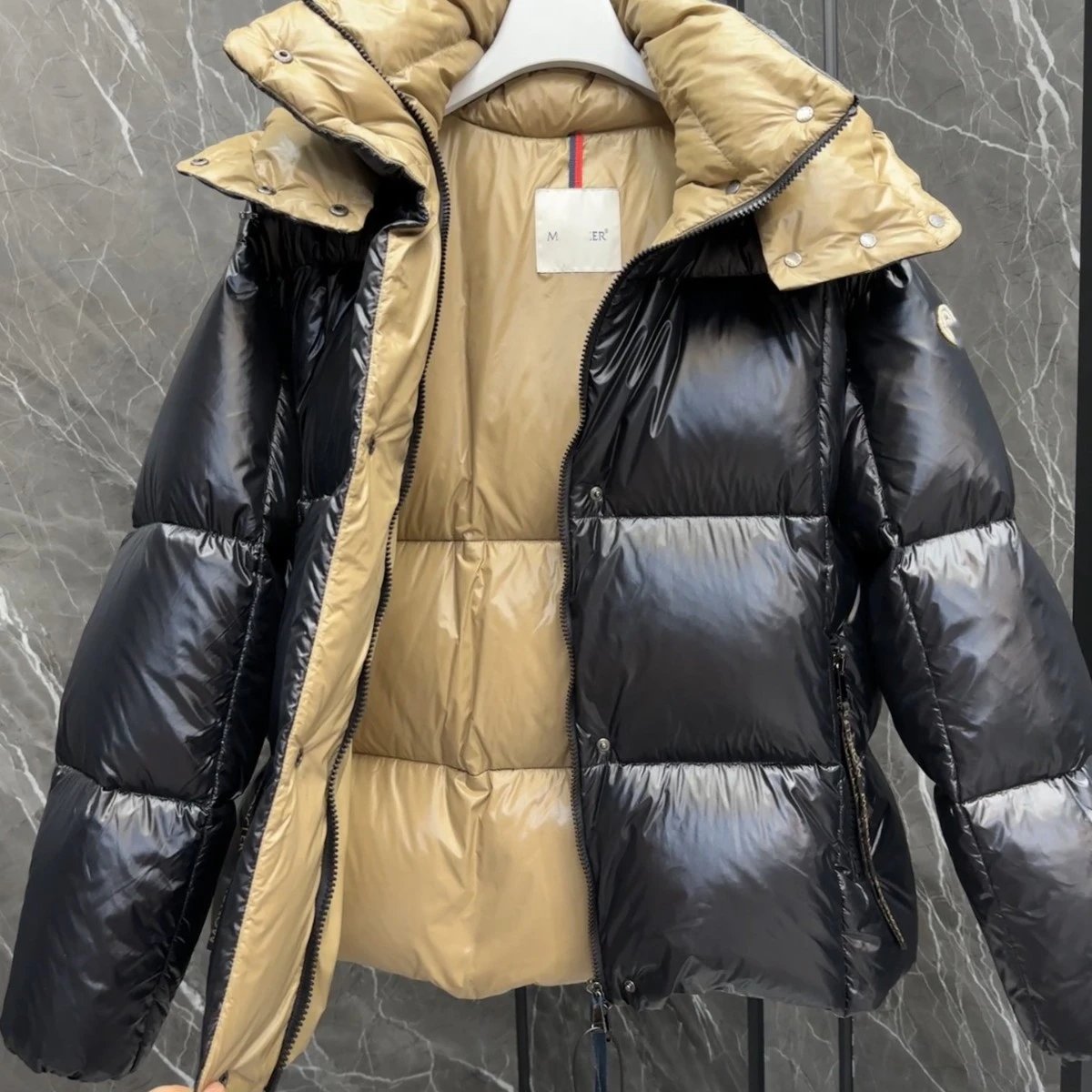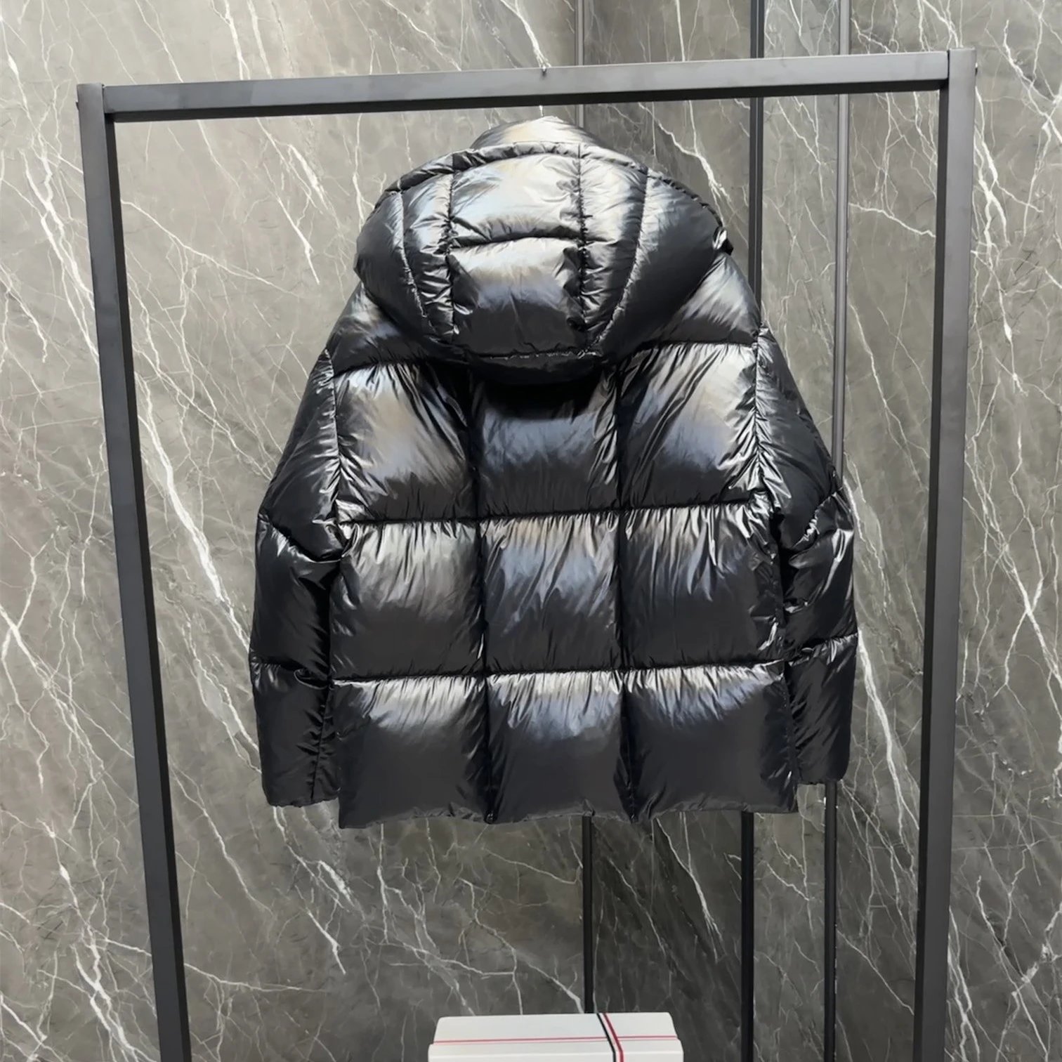 M蒙家闪亮漆面尼龙黑金撞色90白鸭绒短款羽绒服女装