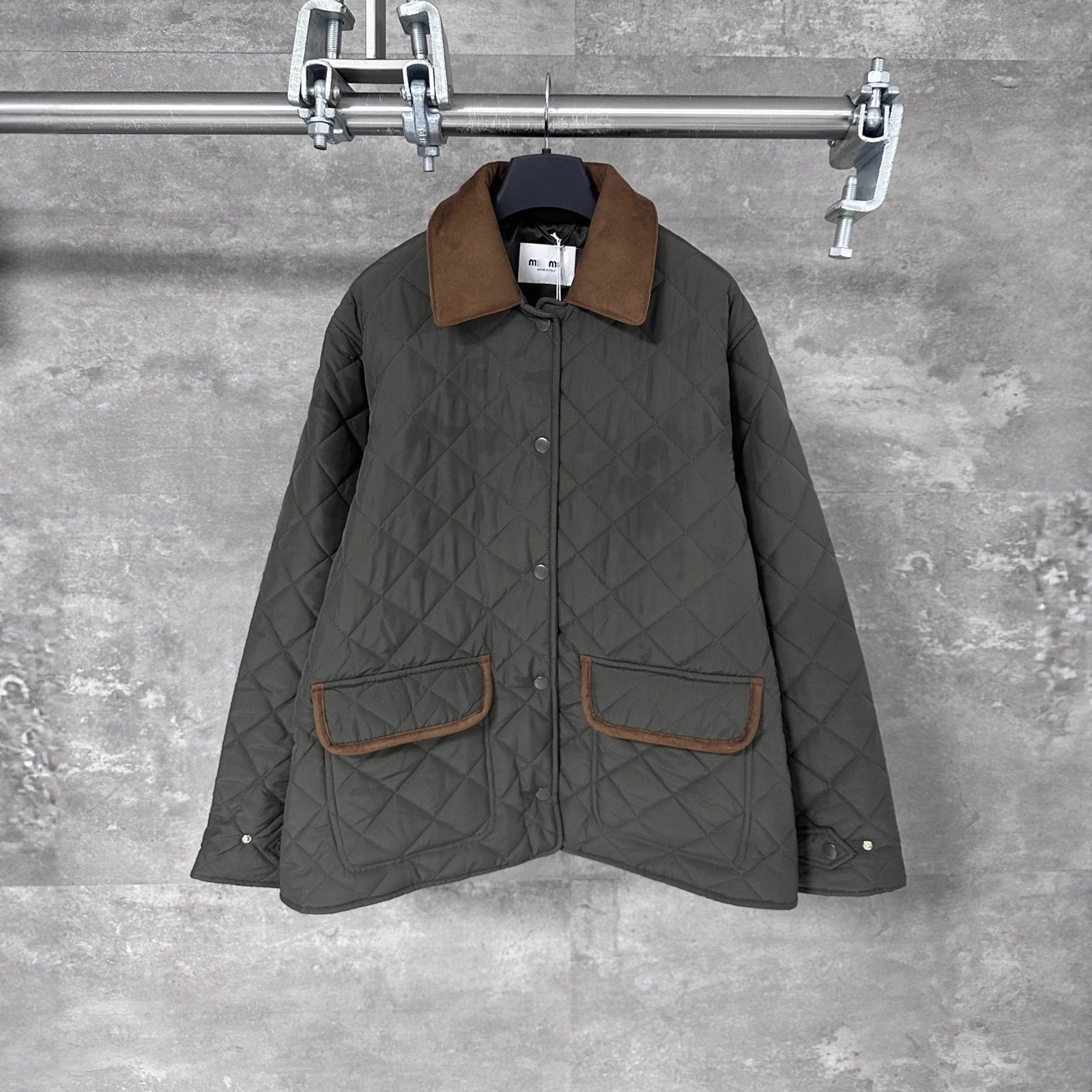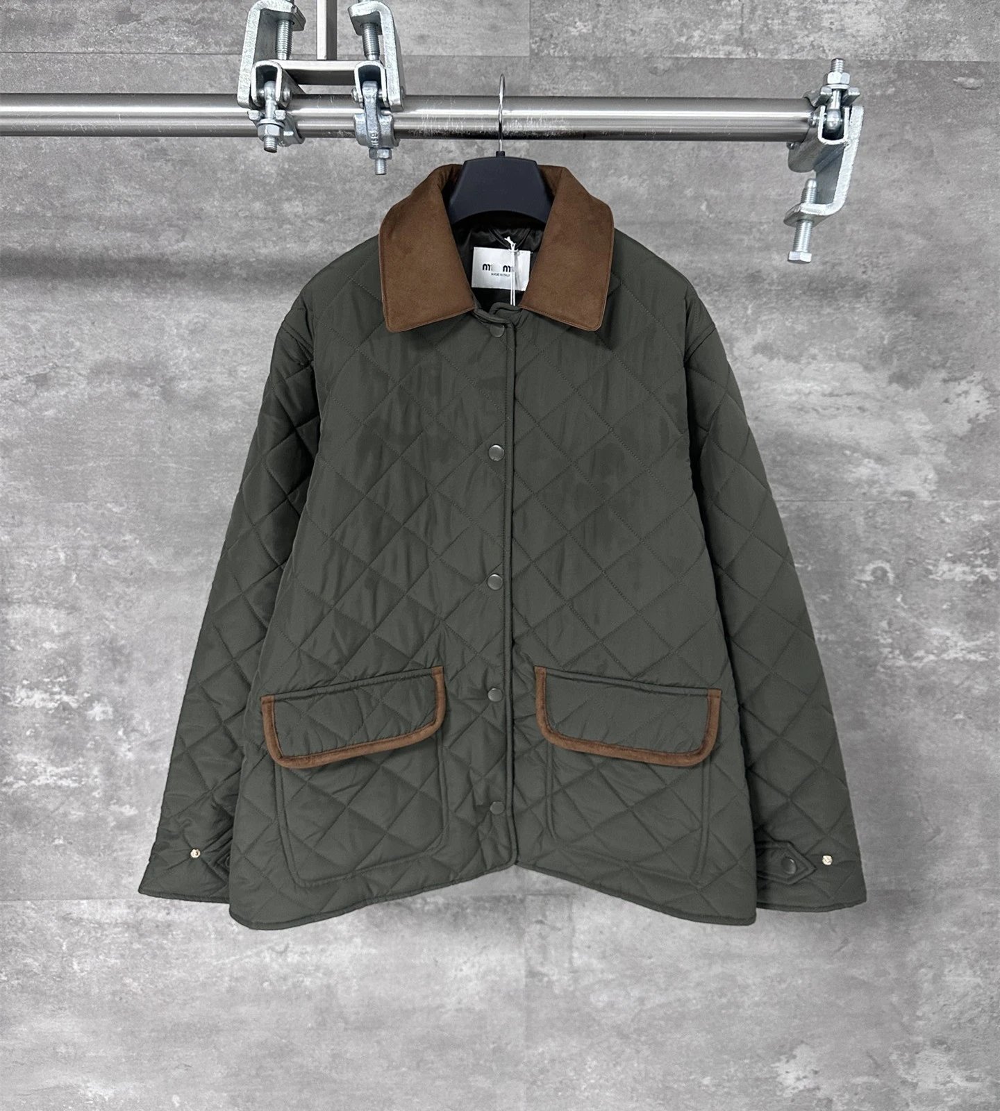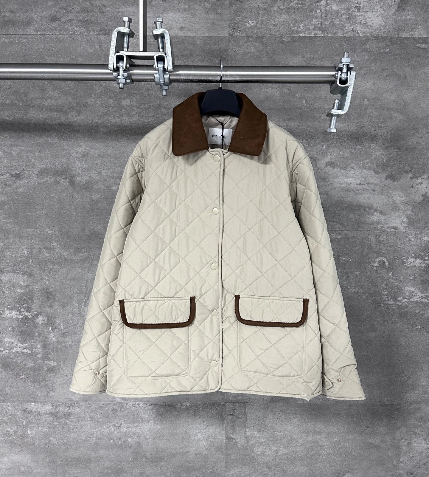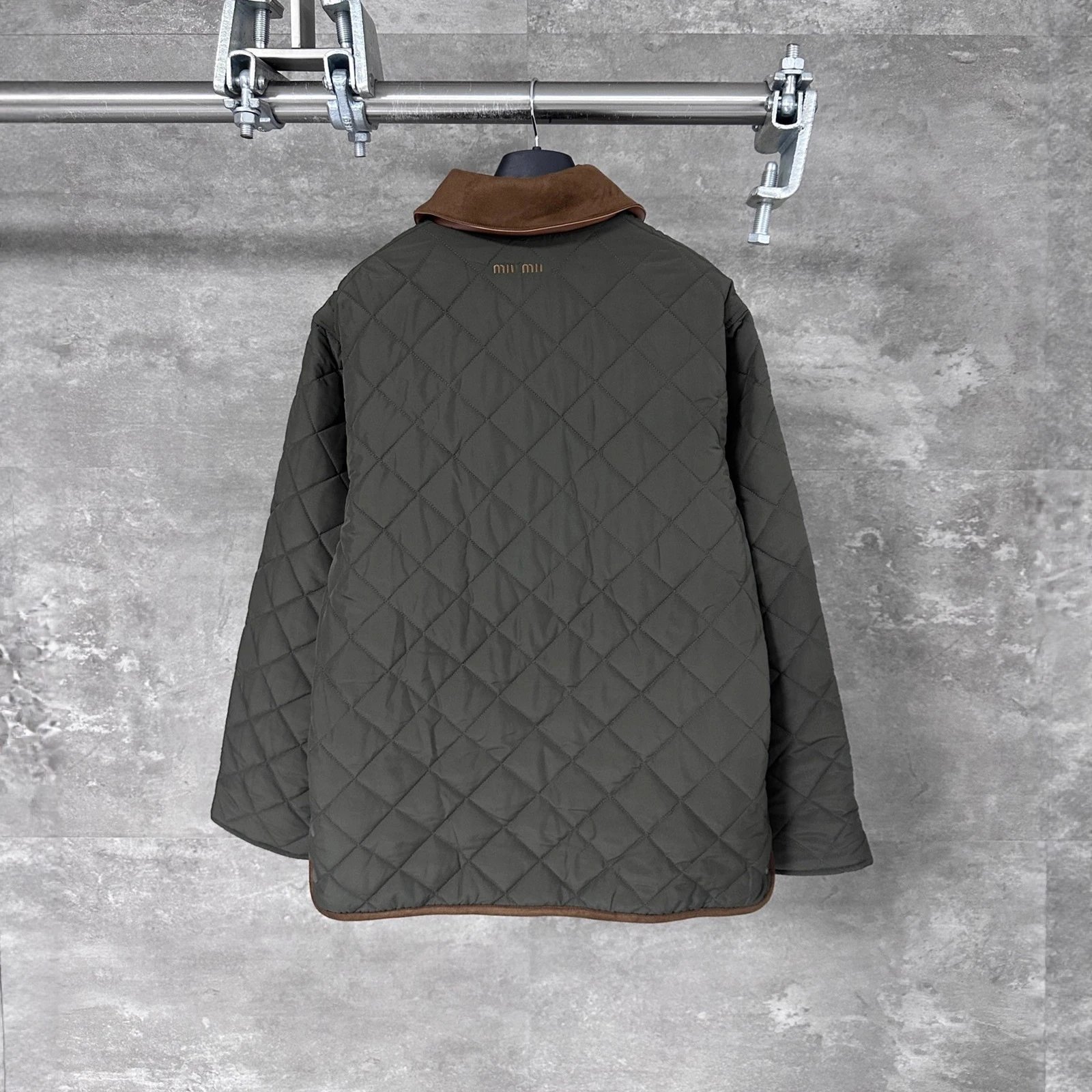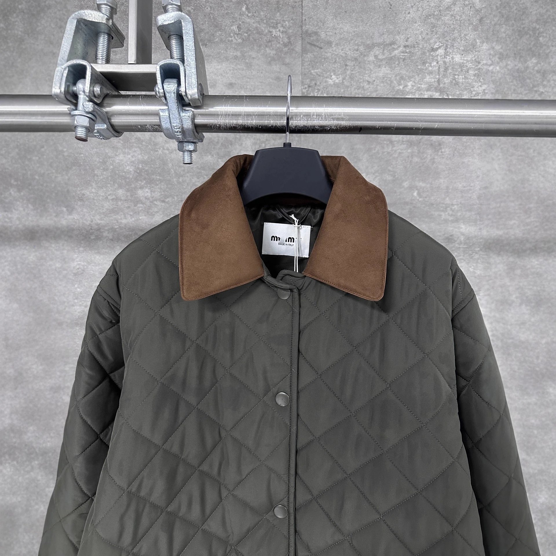 MIU缪家小红书网红款绒面皮革拼接翻领菱格棉服夹克外套