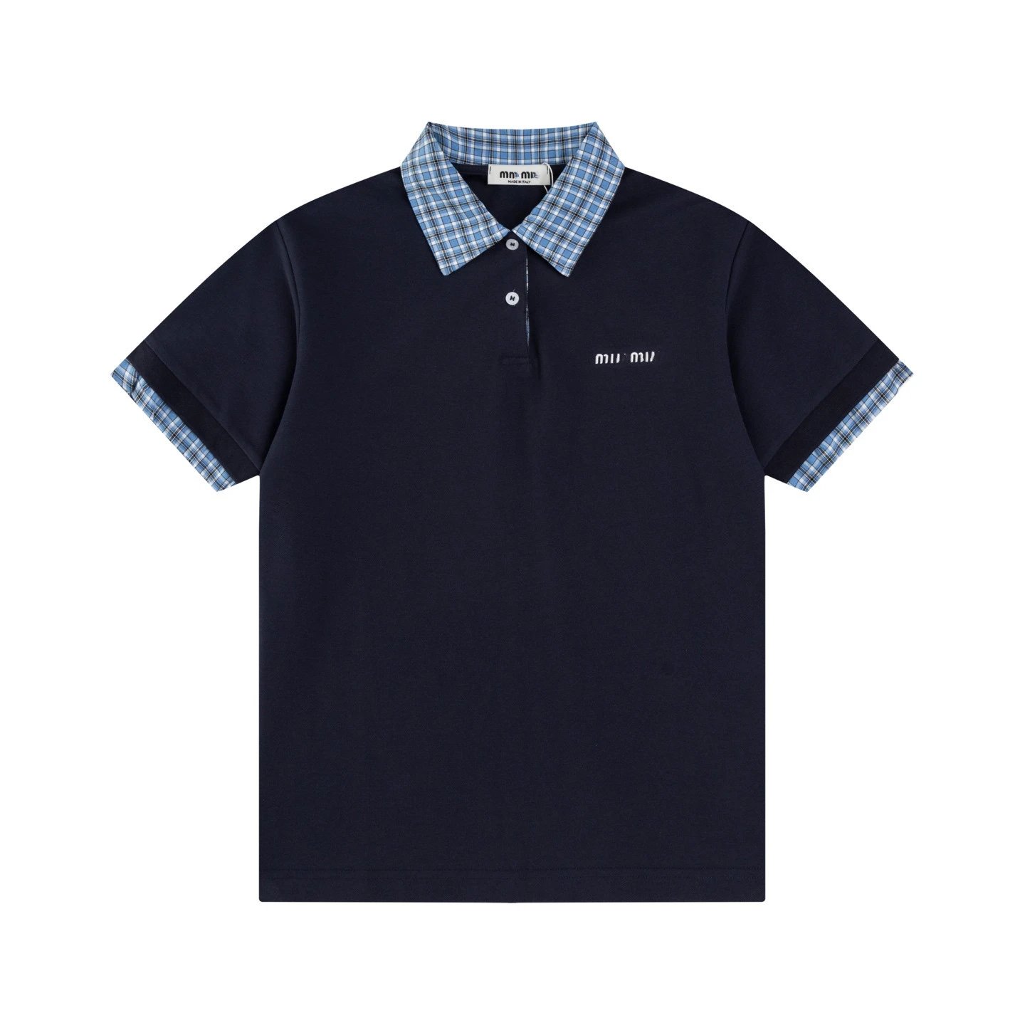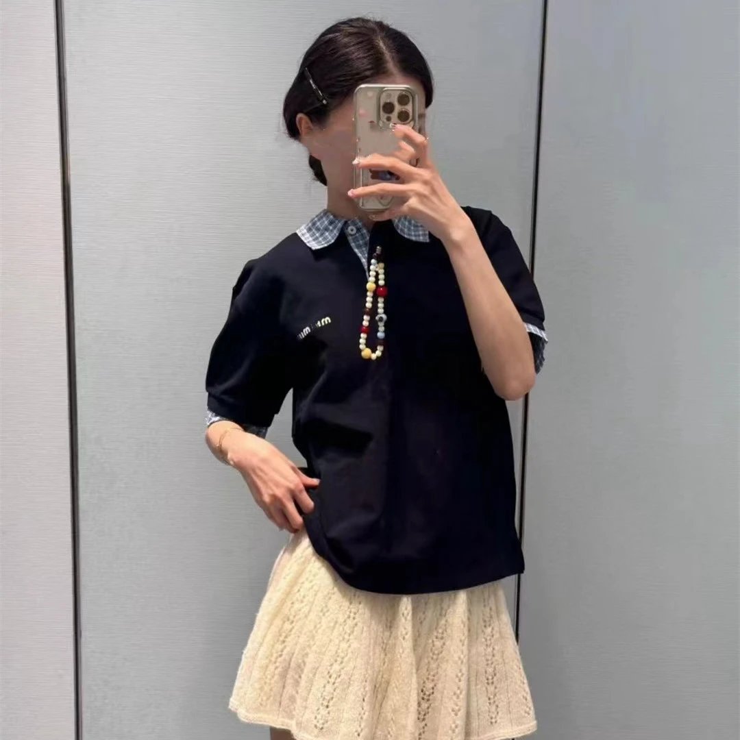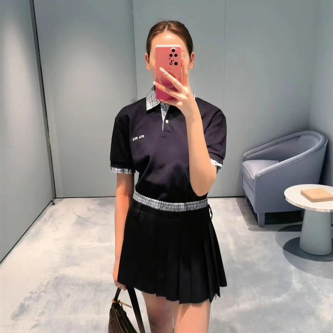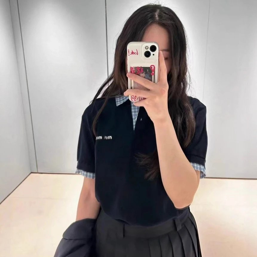 MIU缪家网红款学徽标假两件拼接格纹POLO衫短袖T恤