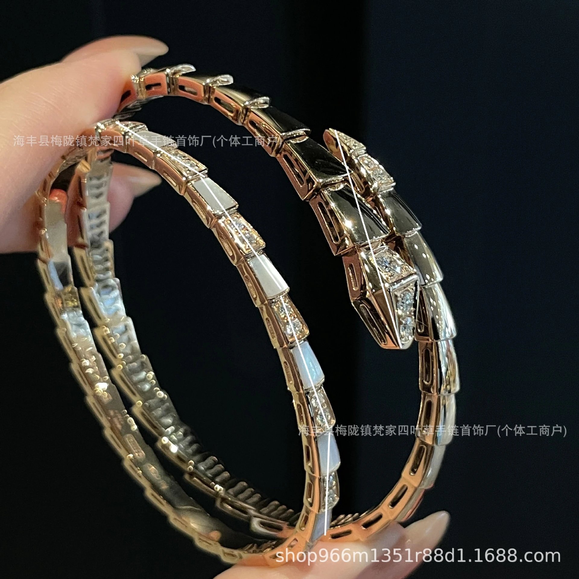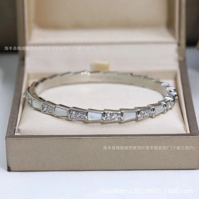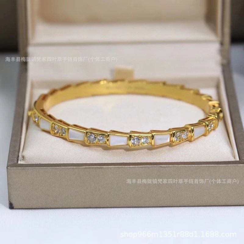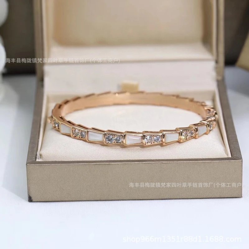宝家玫瑰金新款满钻白贝母蛇形手镯头尾钻光面蛇形手环闺蜜时尚