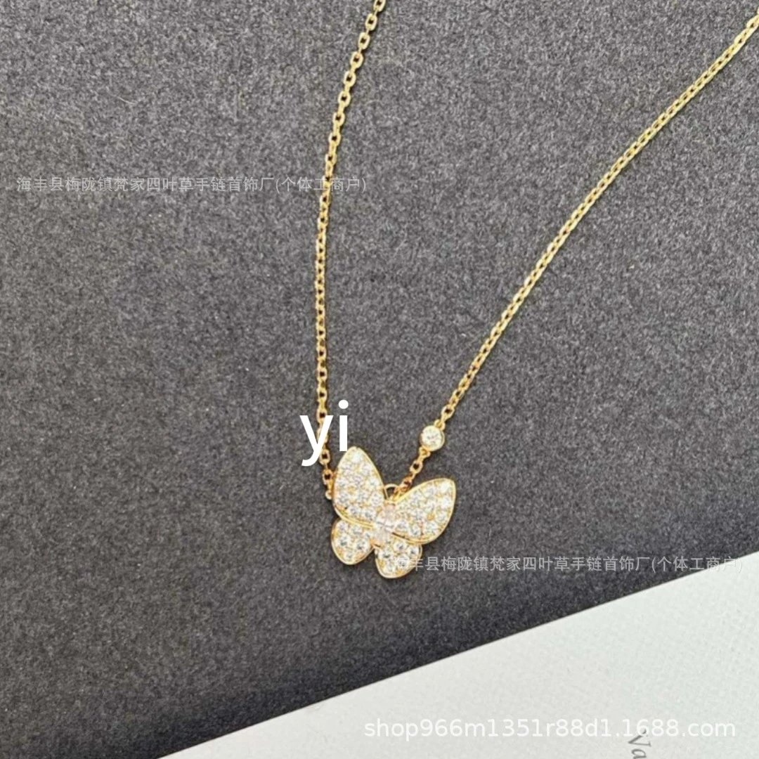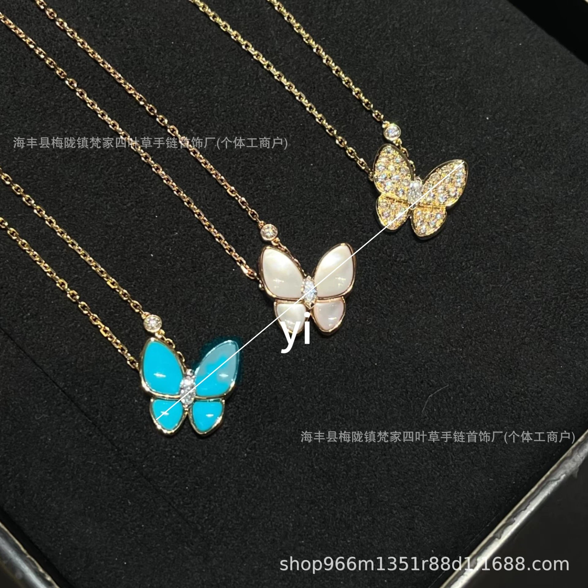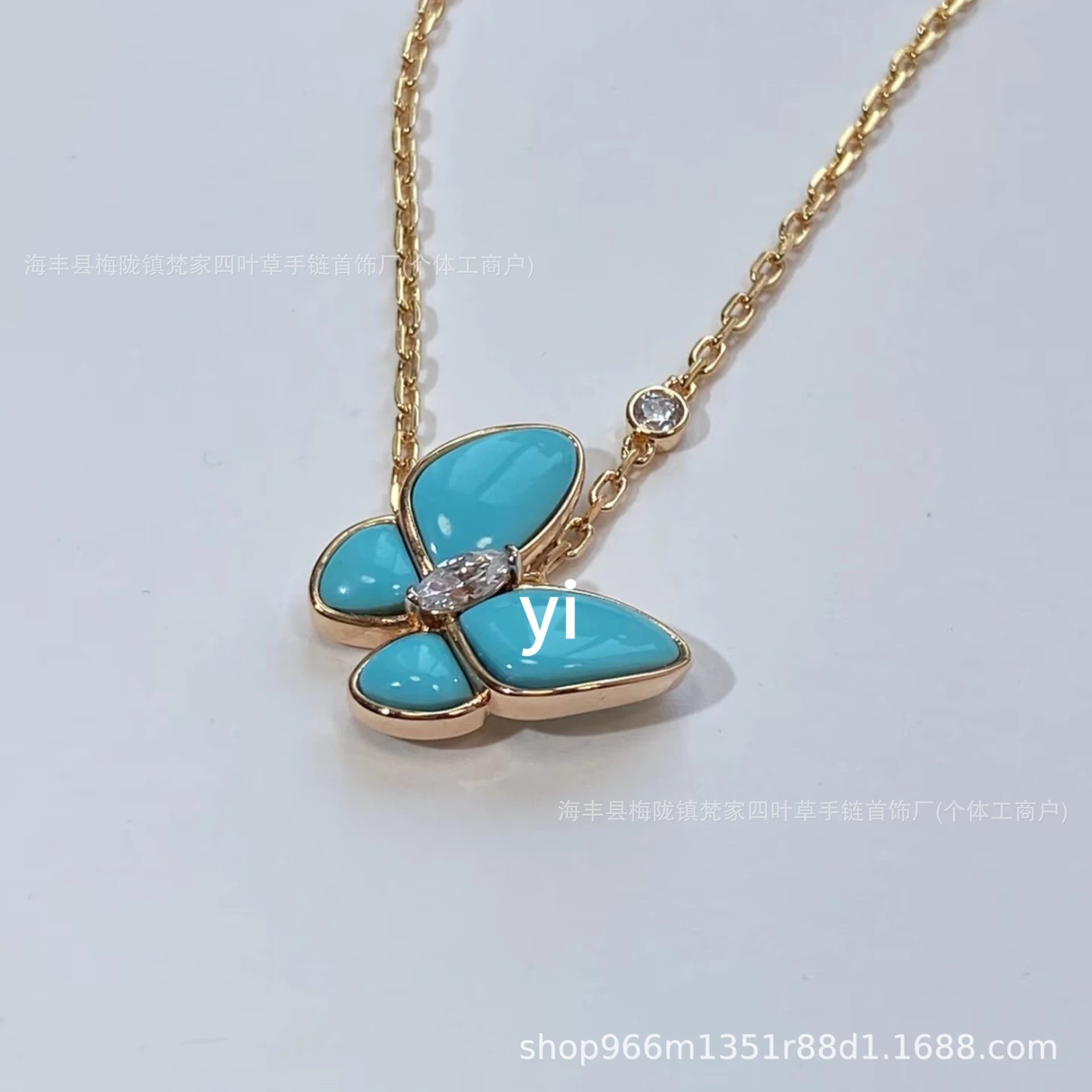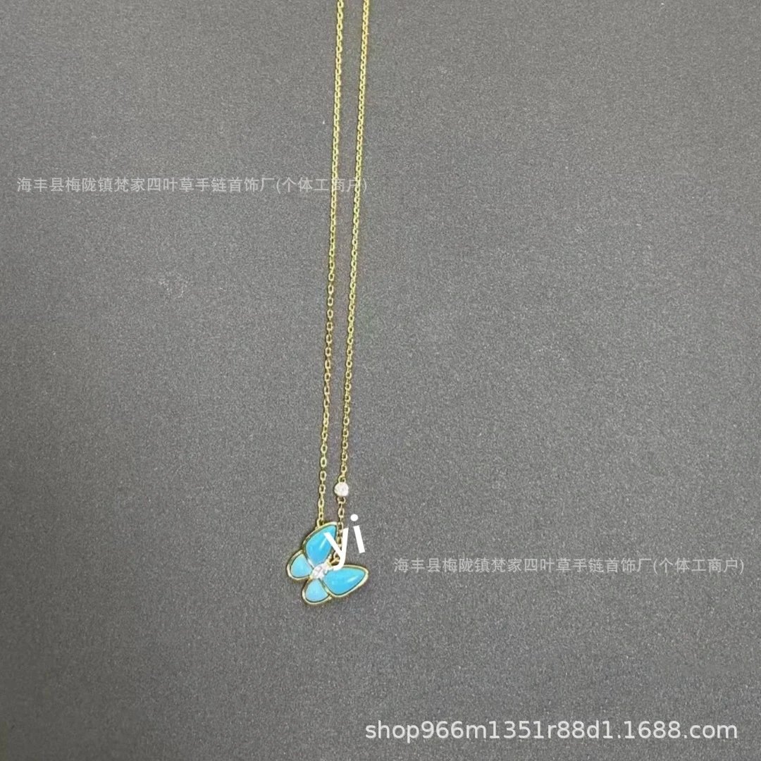 梵家镀玫瑰金黄金蝴蝶贝母项链马眼白金满钻绿松石蓝色新款