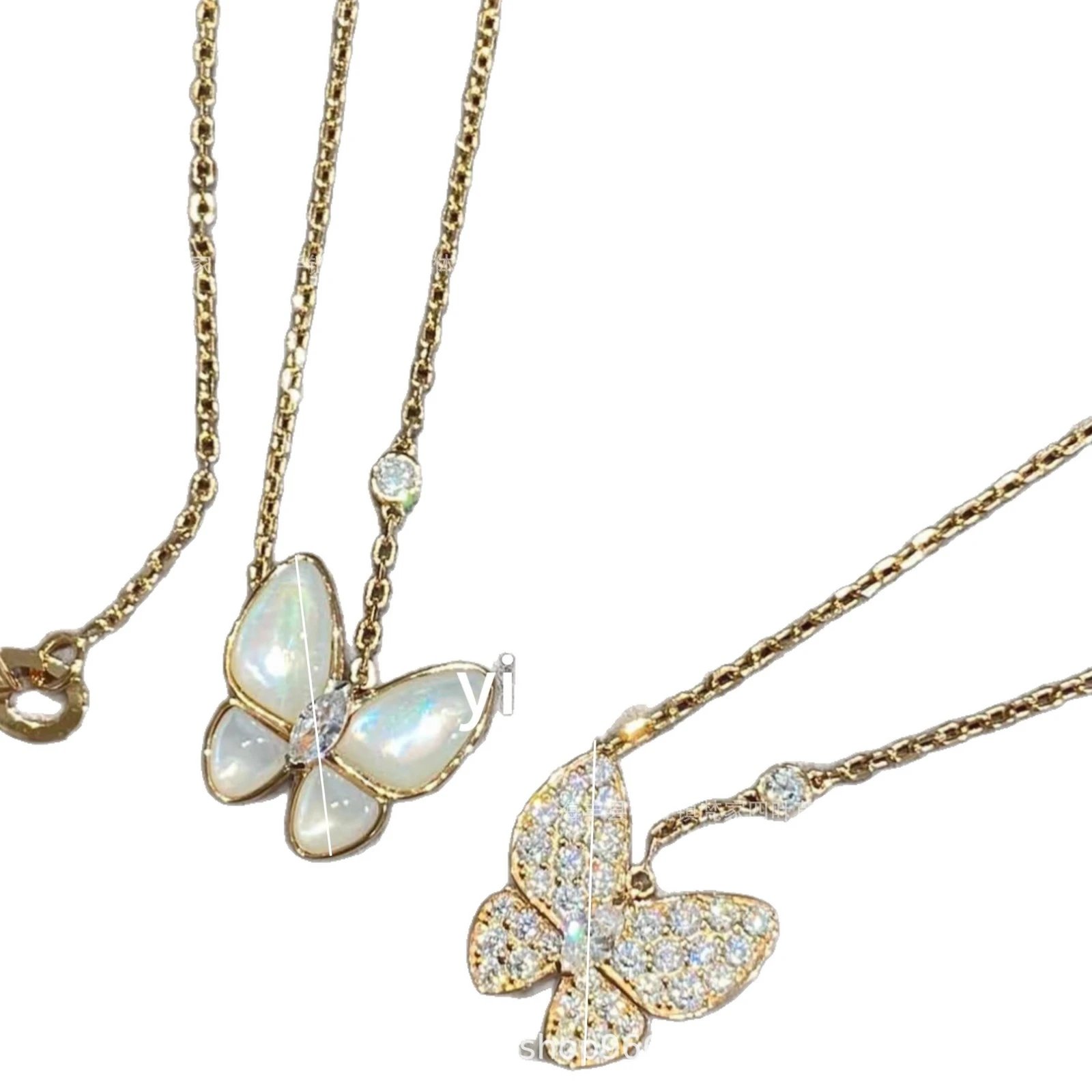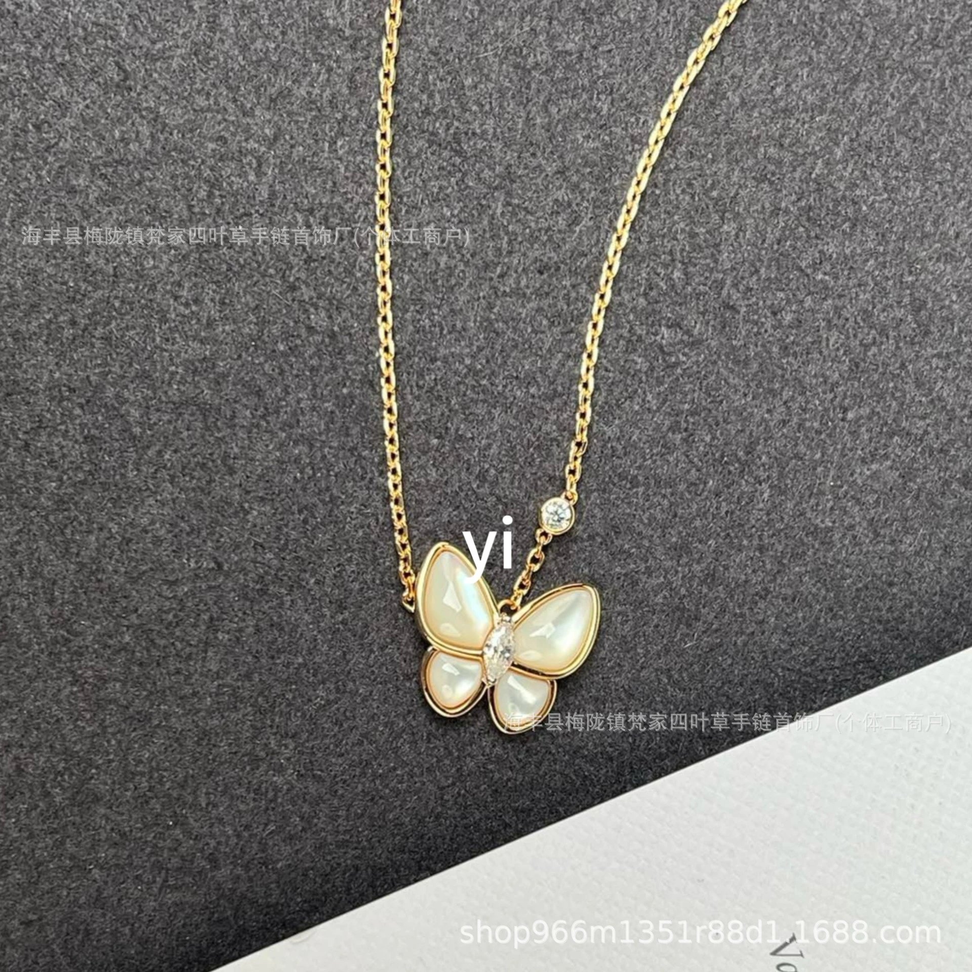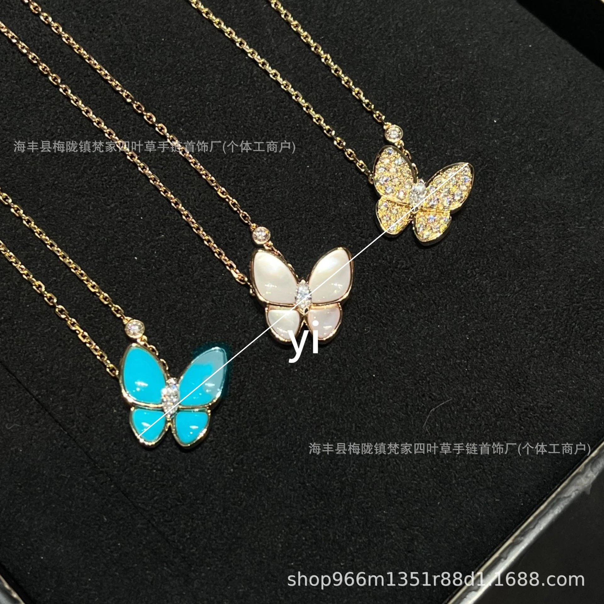 梵家镀玫瑰金黄金蝴蝶贝母项链马眼白金满钻绿松石蓝色新款