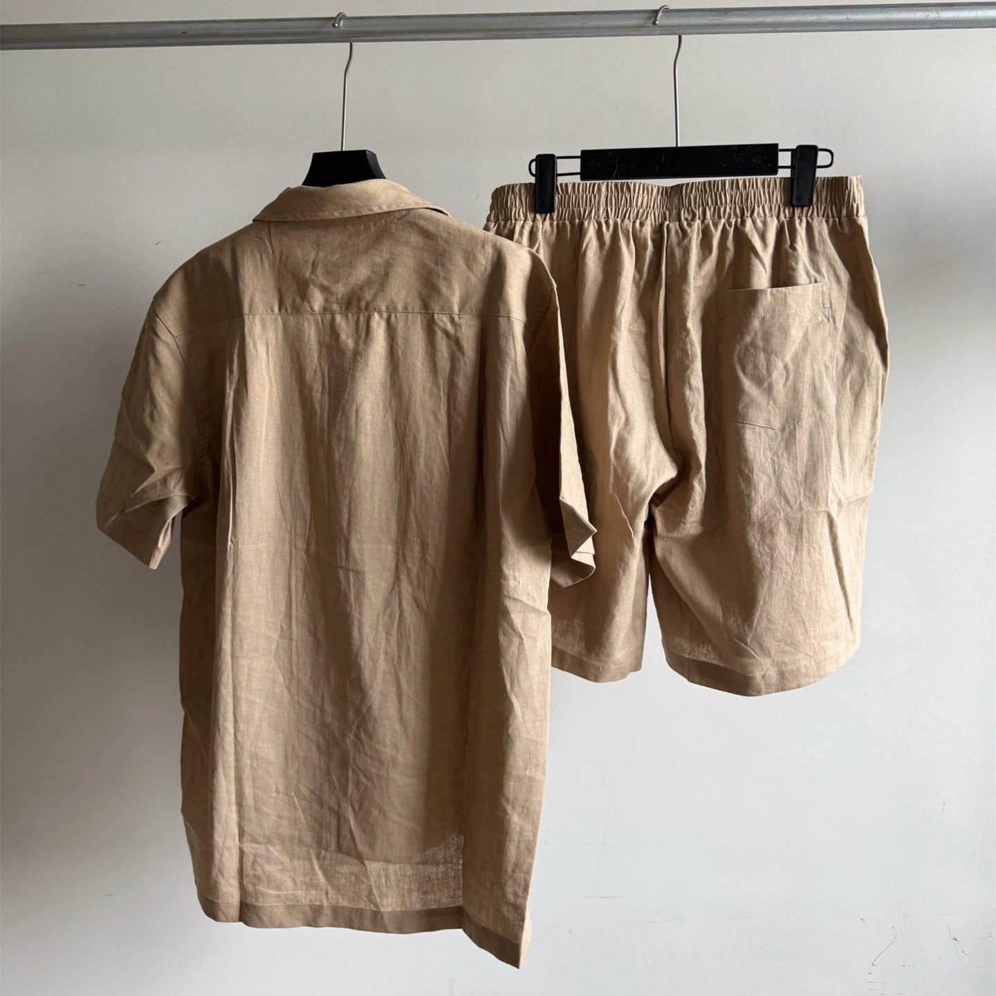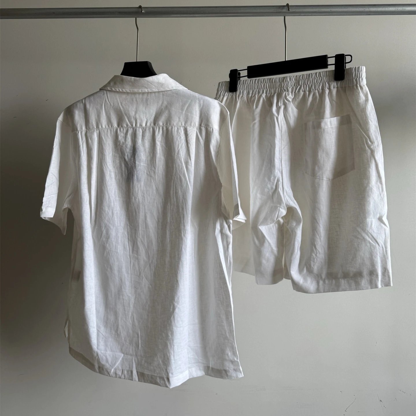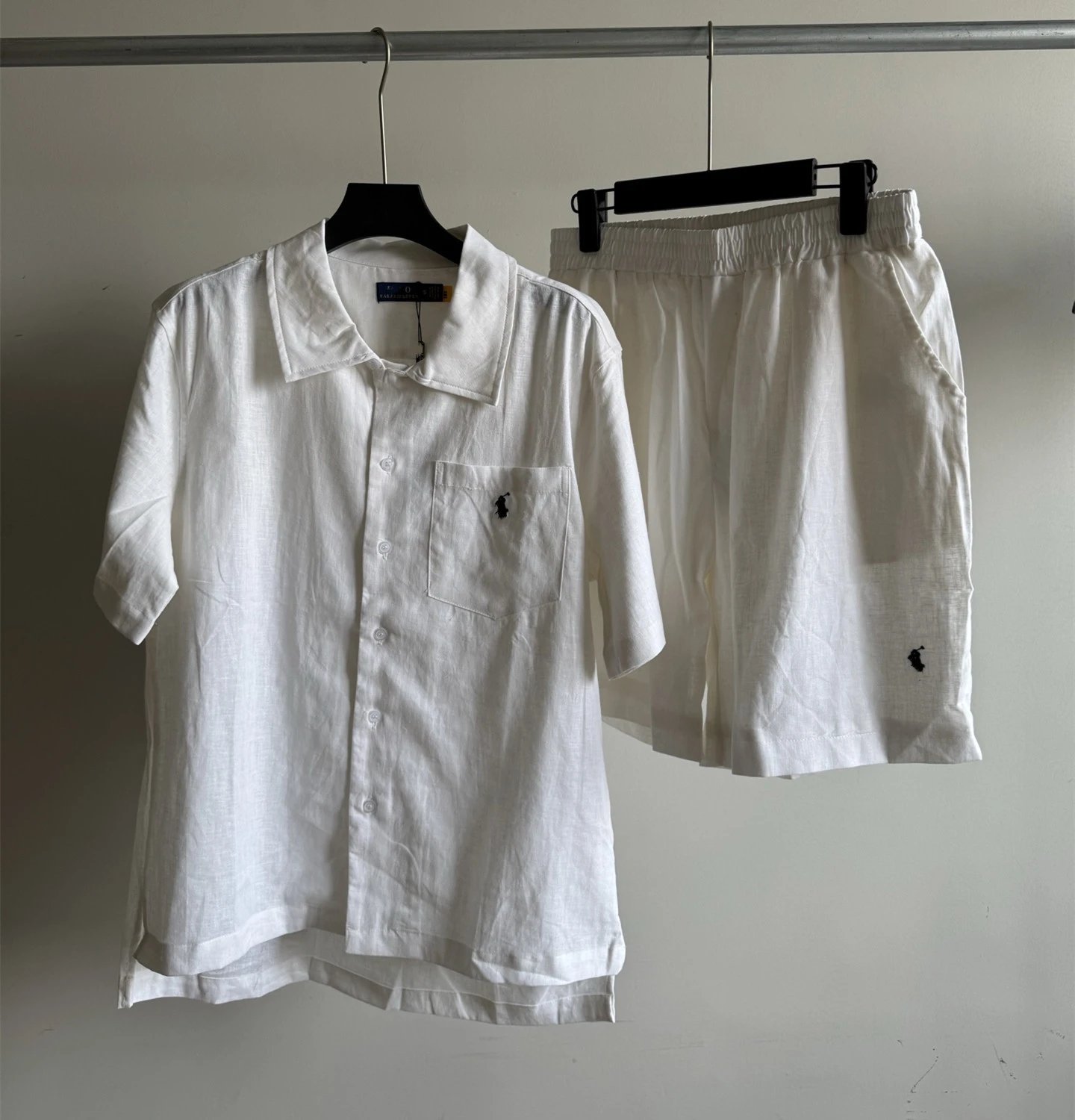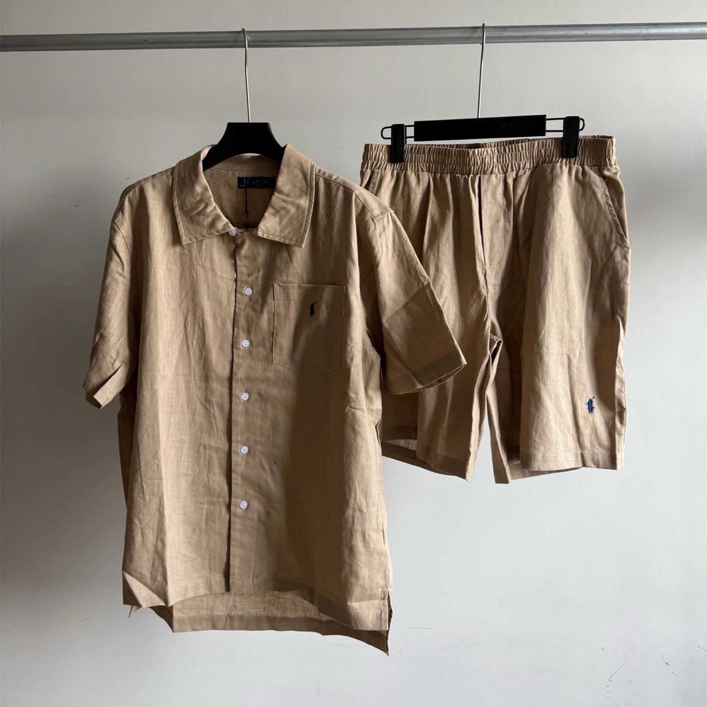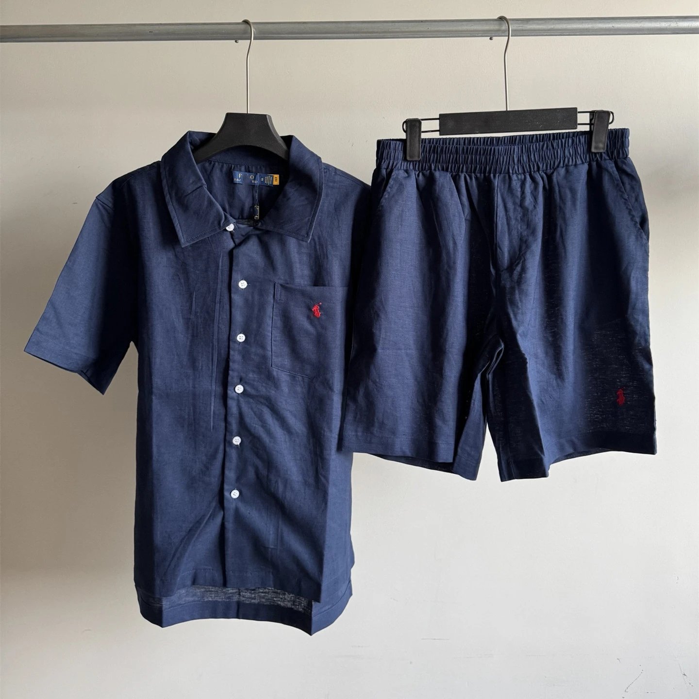 RL拉夫小马刺绣亚麻古巴风格短袖衬衫短裤套装
