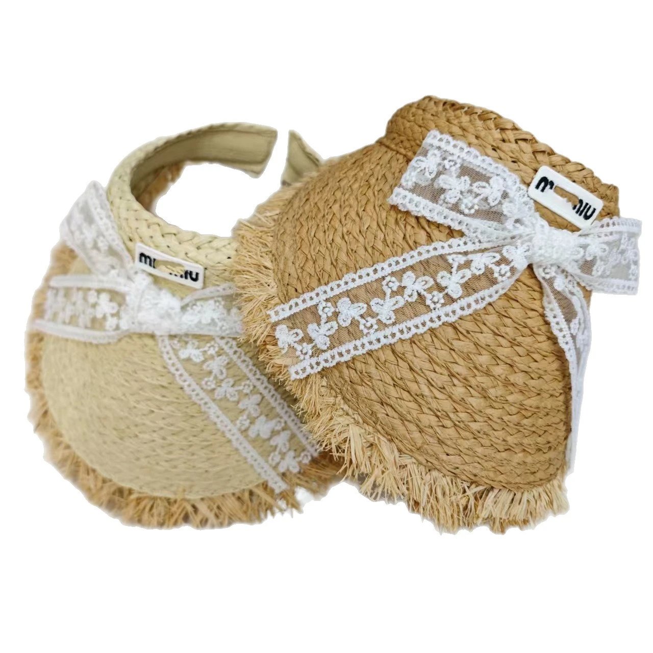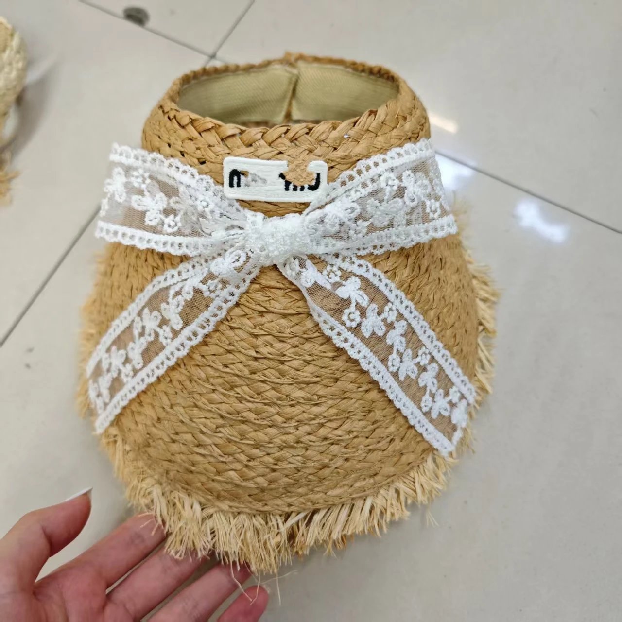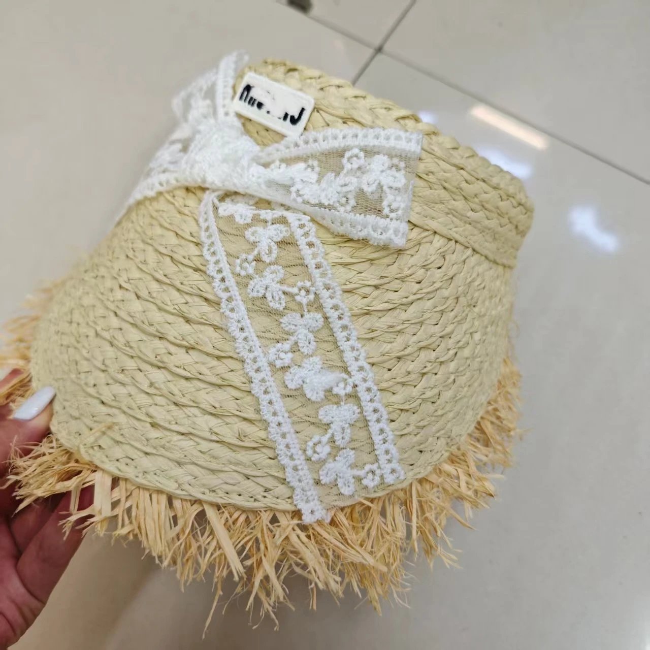 正确字母缪家洋气蝴蝶结空顶帽女夏季遮阳草帽户外防晒透气毛边帽