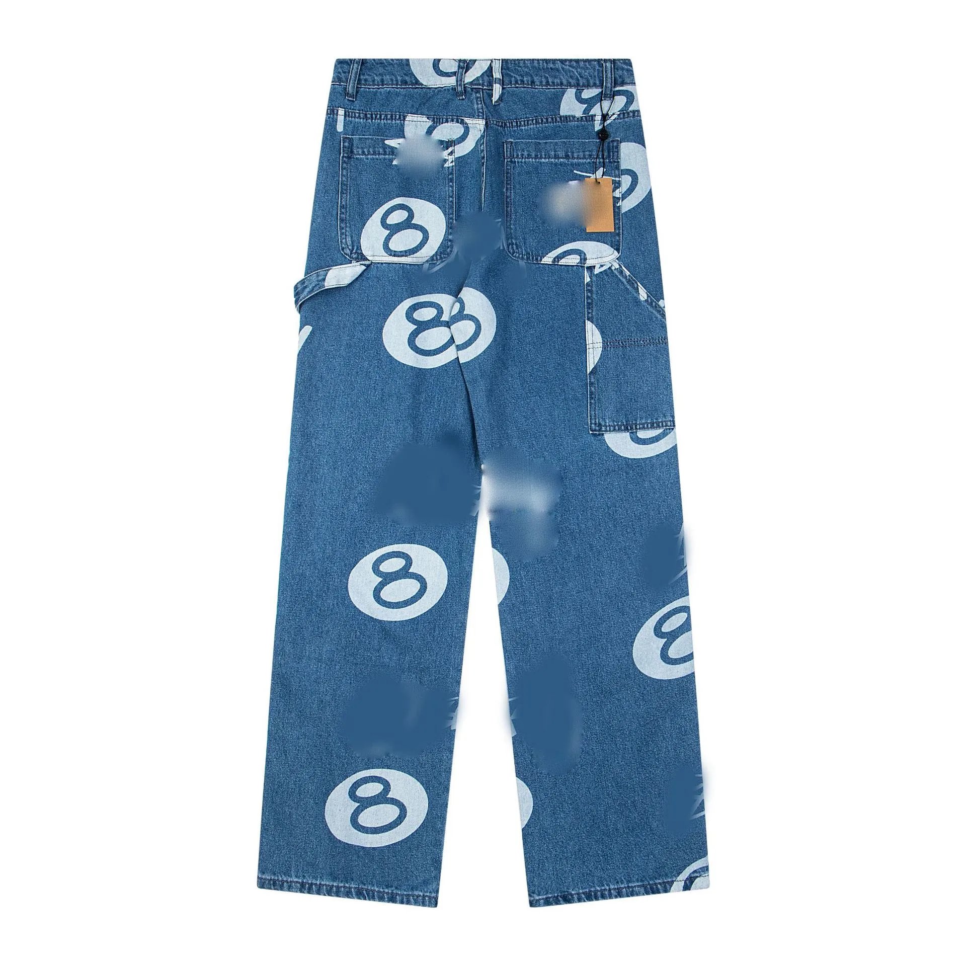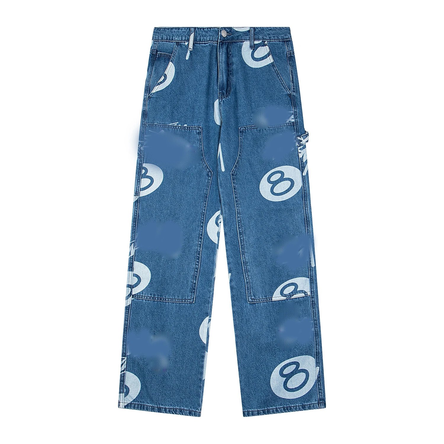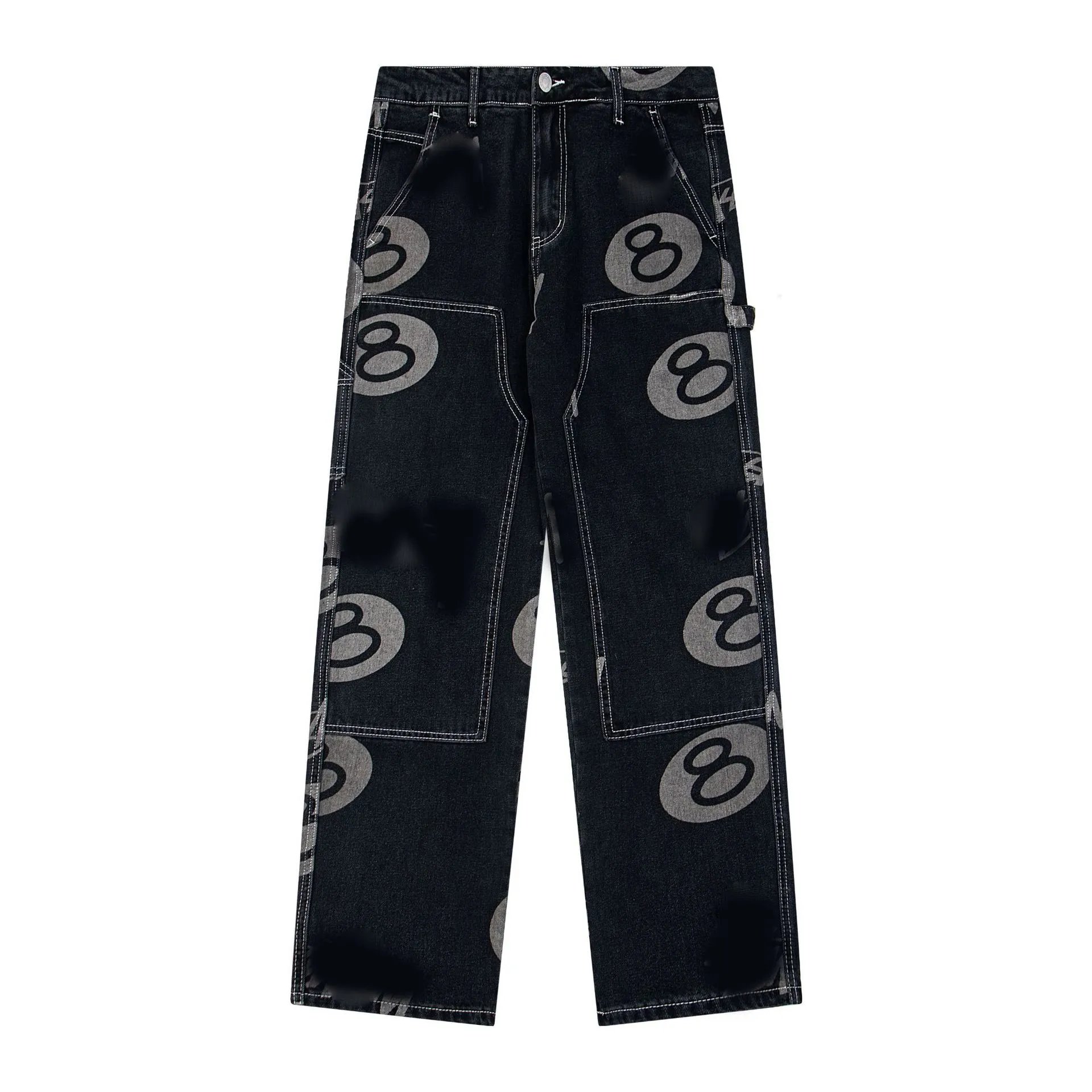 美式潮牌牛仔字母长裤满印logo黑8印花口袋徽标经典牛仔裤潮