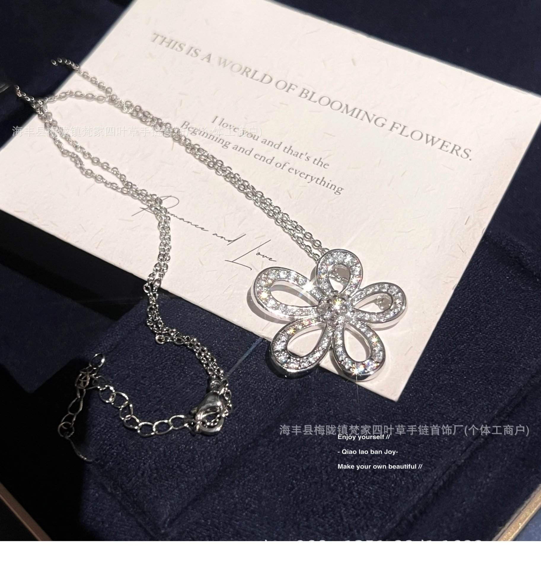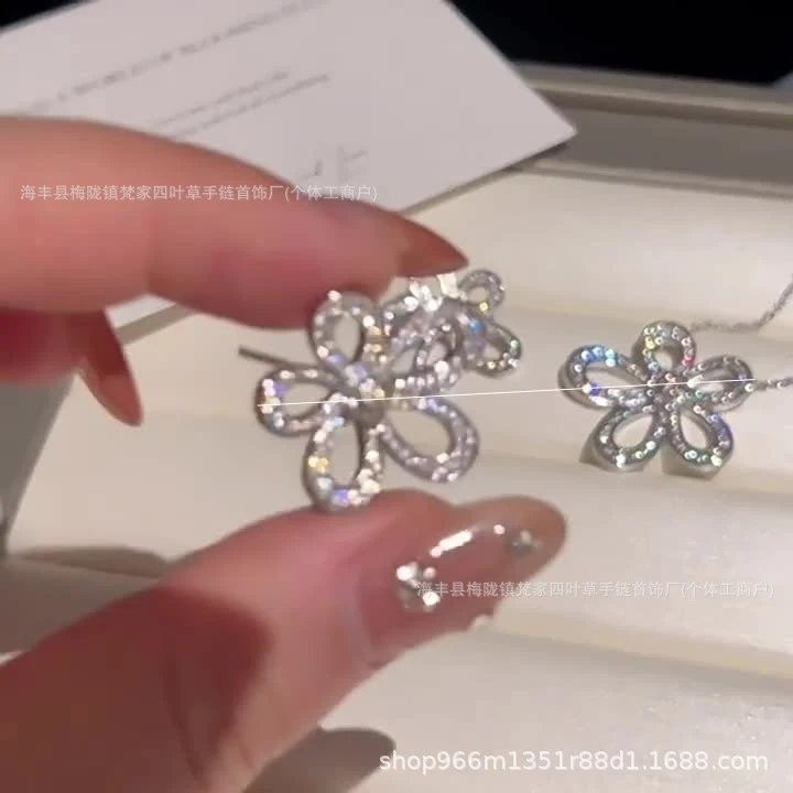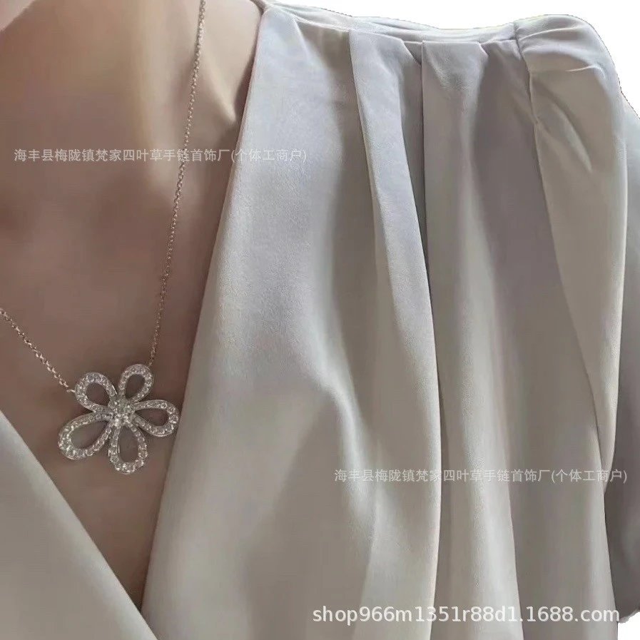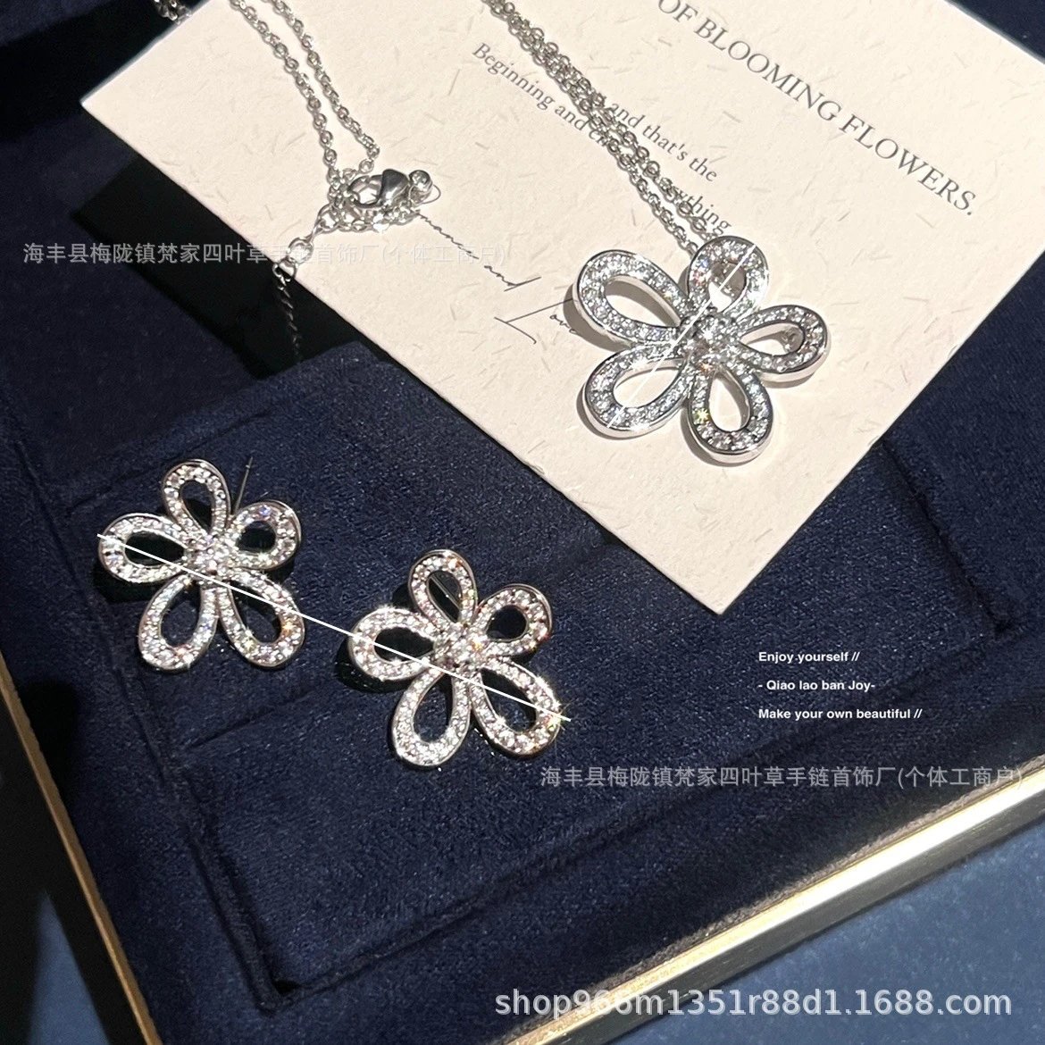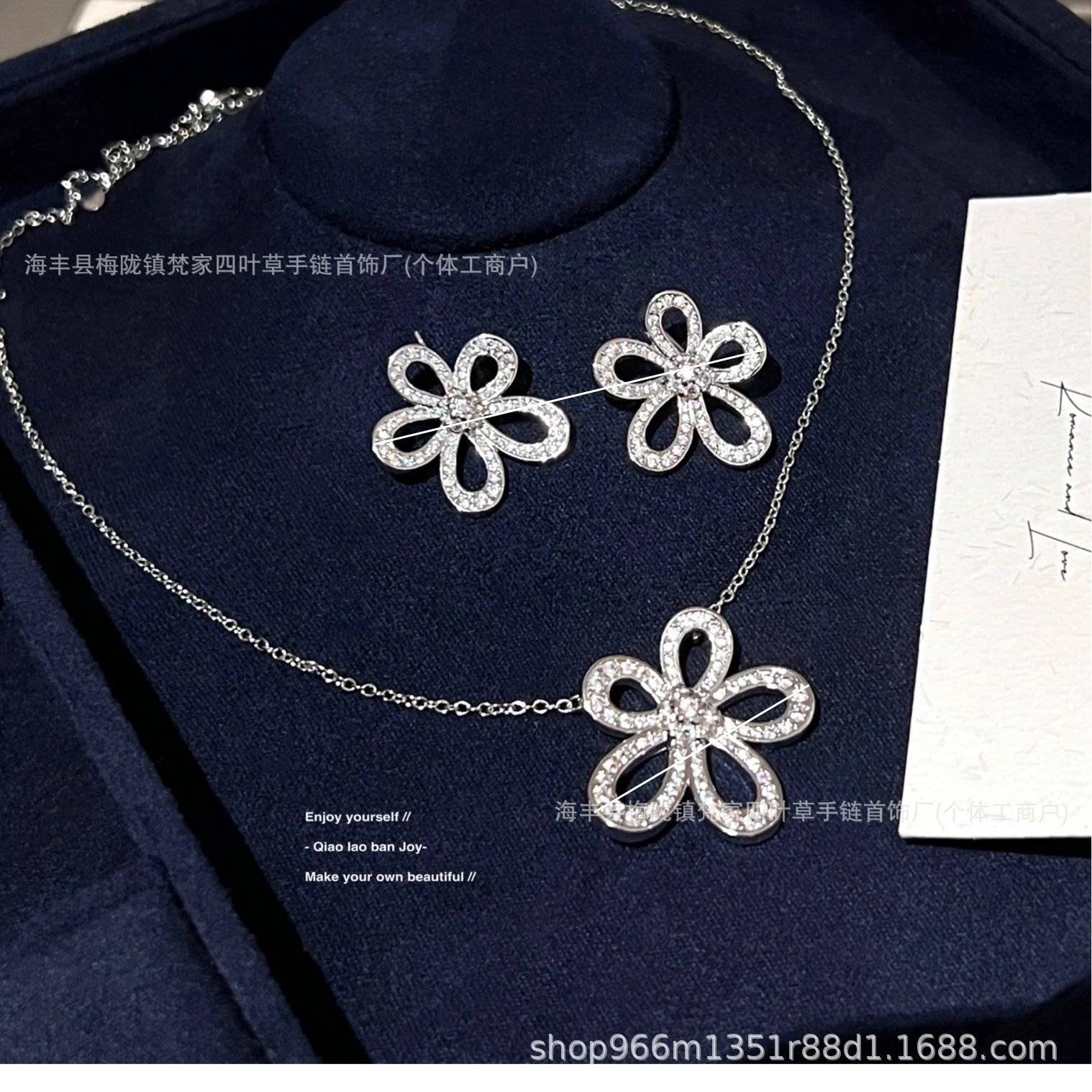 梵家高版镶锆石满钻大花朵项链银色花瓣耳环锁骨套装高级轻奢闪潮