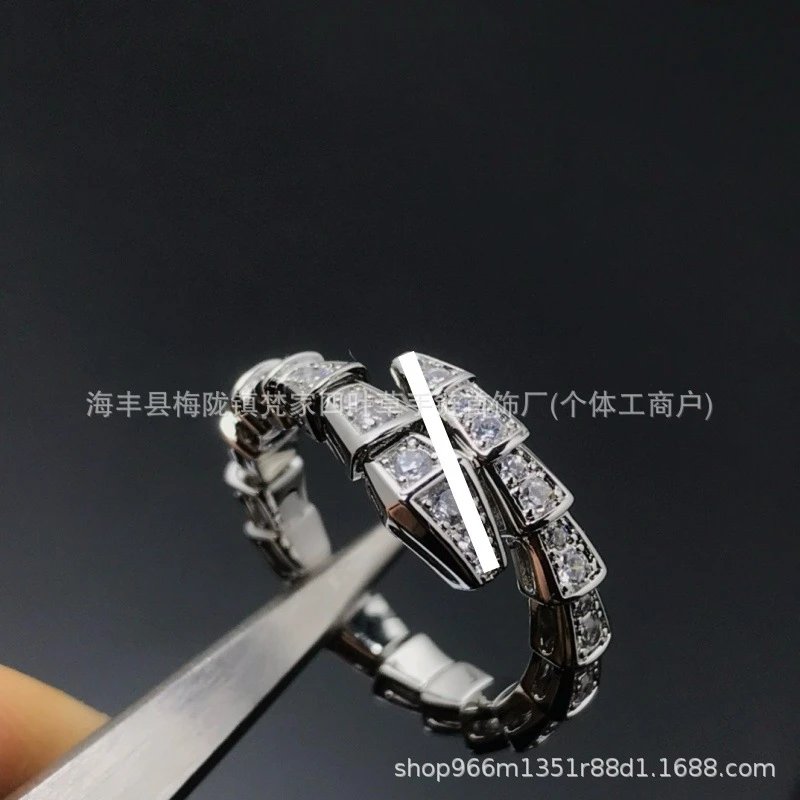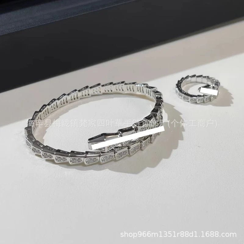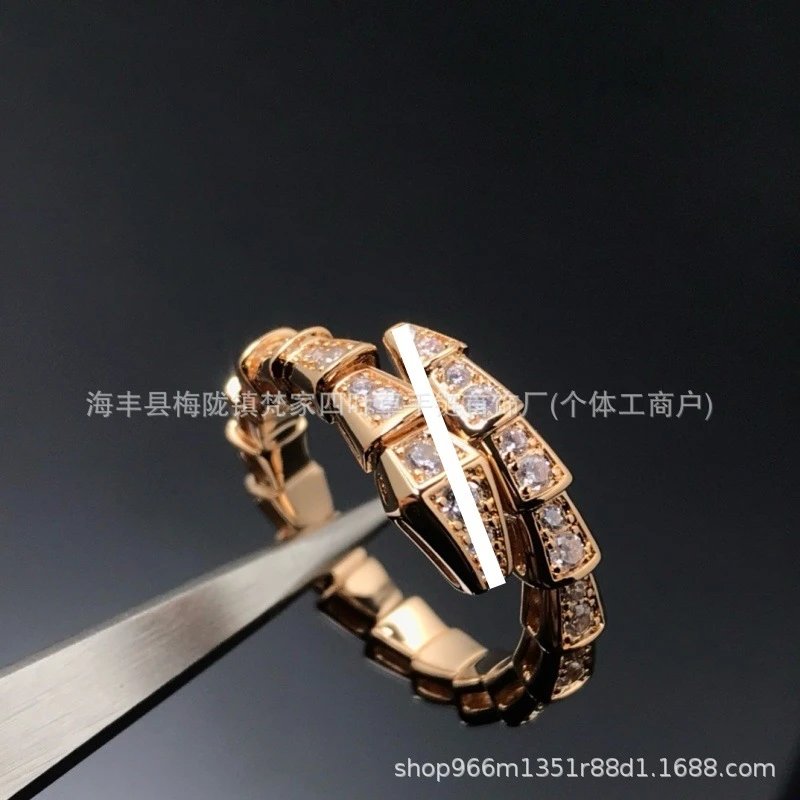 宝家新款轻奢蛇形手镯女镀18K贝母首尾满钻蛇骨手环情侣调节戒指