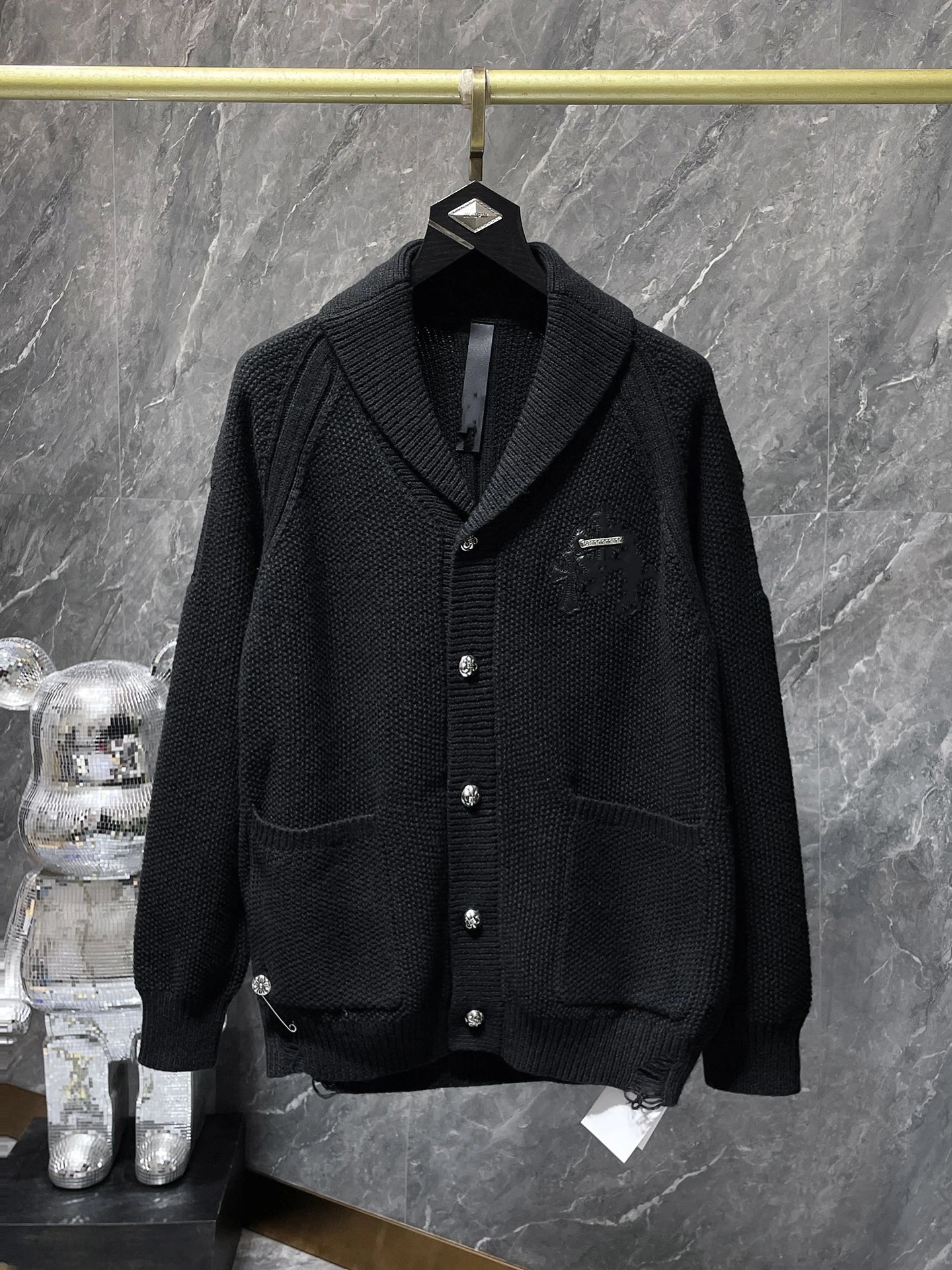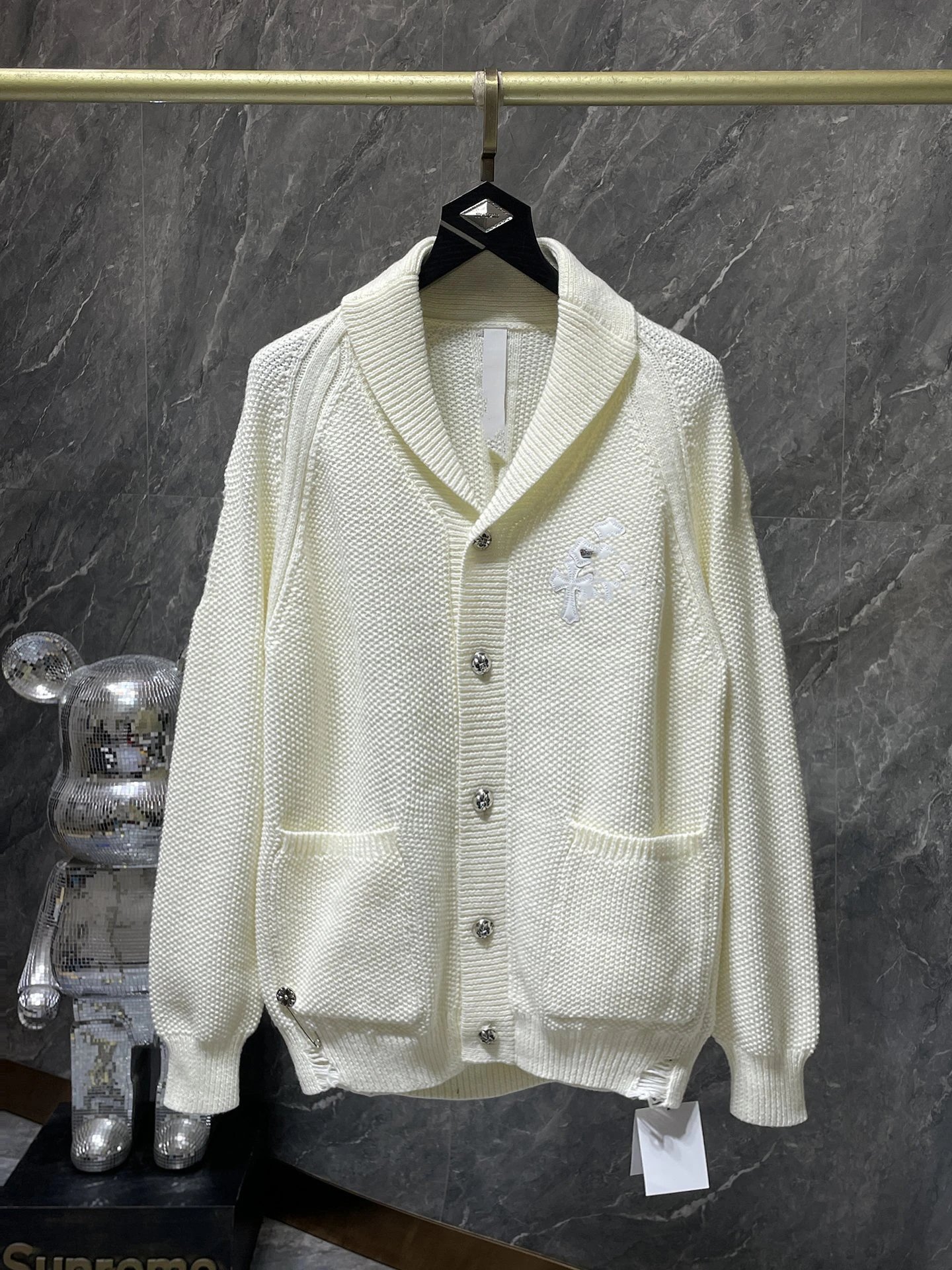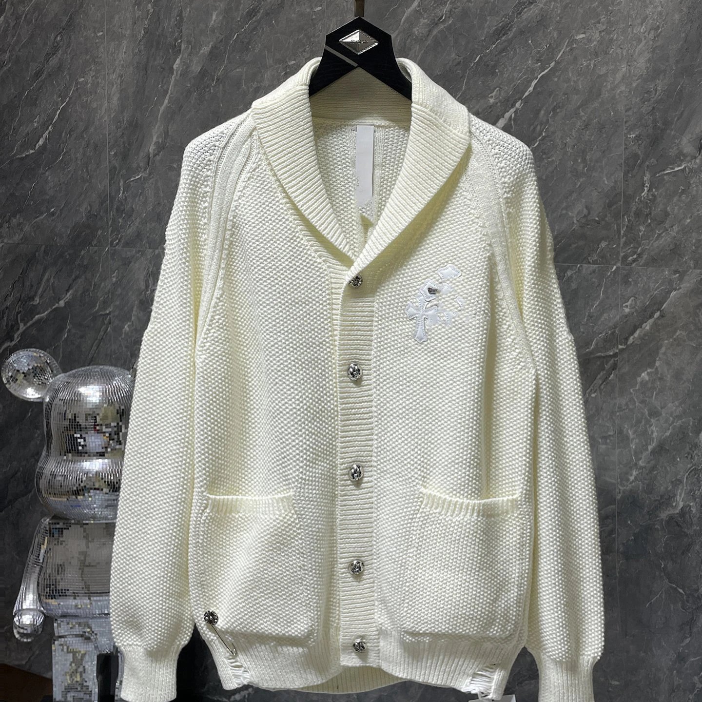 24ss秋冬CH新款香蕉领羊毛拼皮银扣开衫毛衣外套针织衫男女款白底