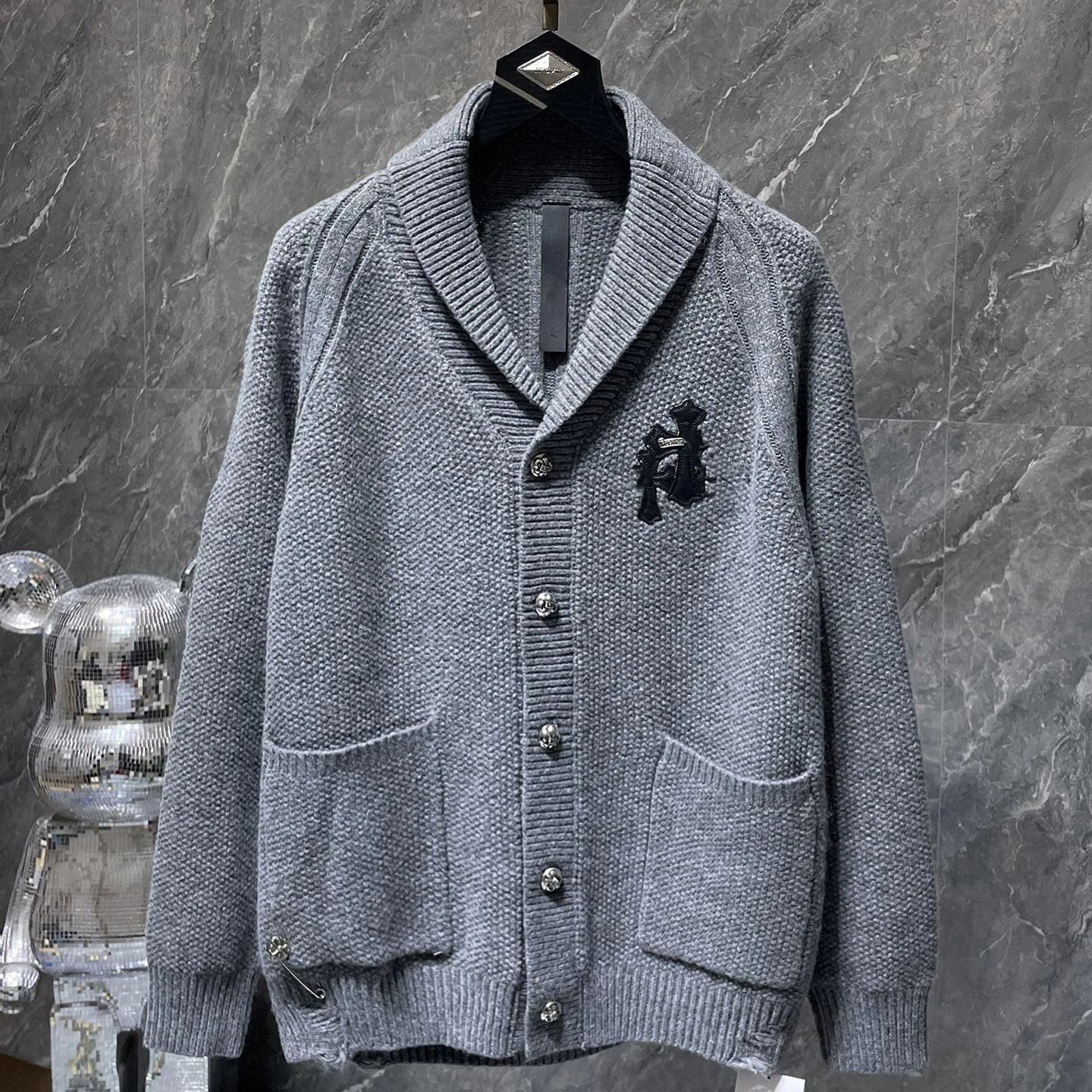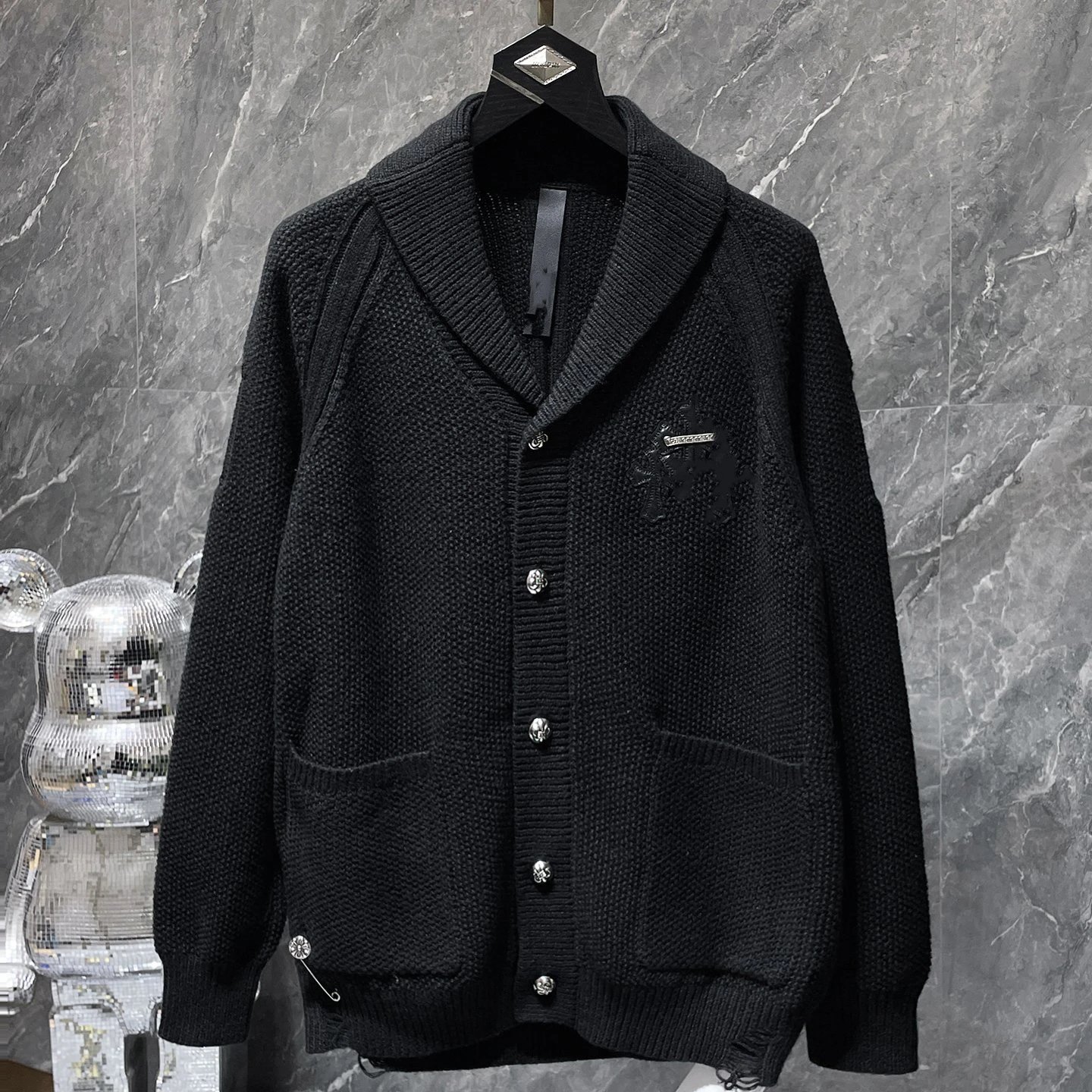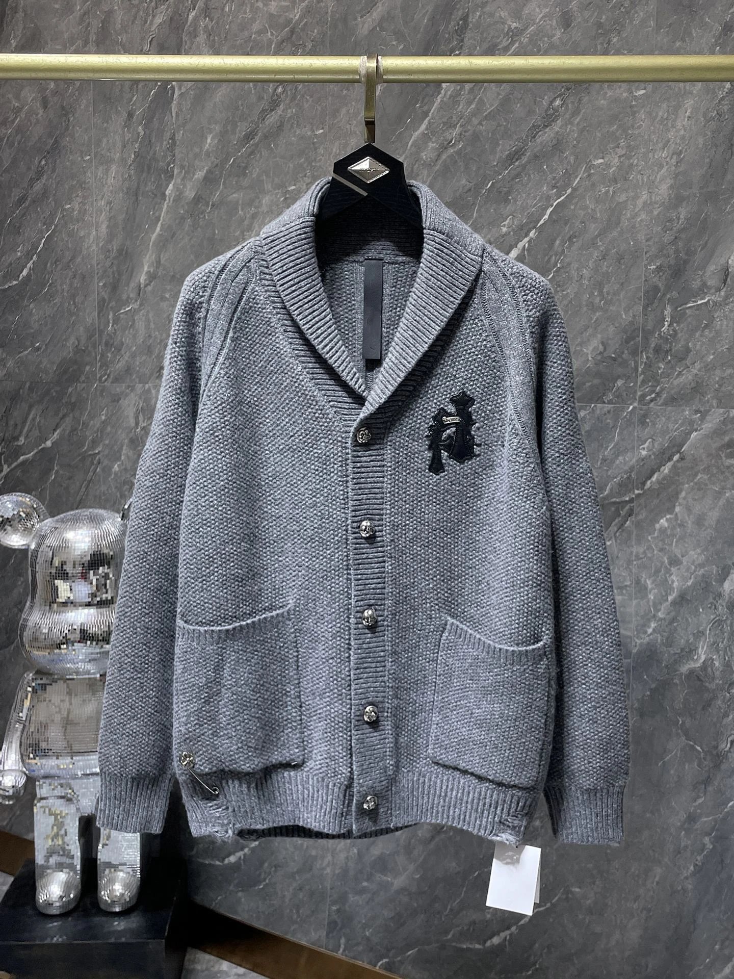24ss秋冬CH新款香蕉领羊毛拼皮银扣开衫毛衣外套针织衫男女款白底
