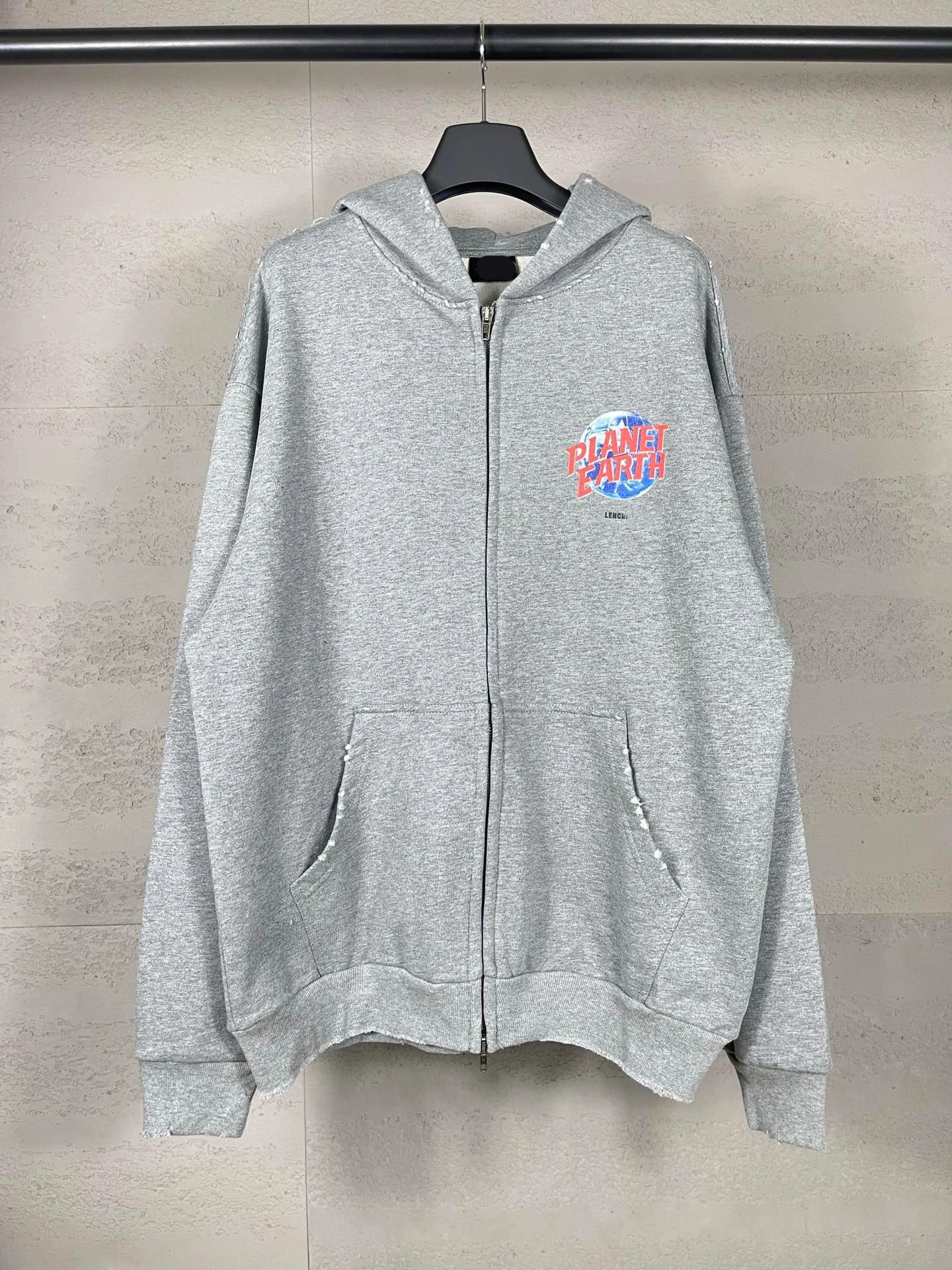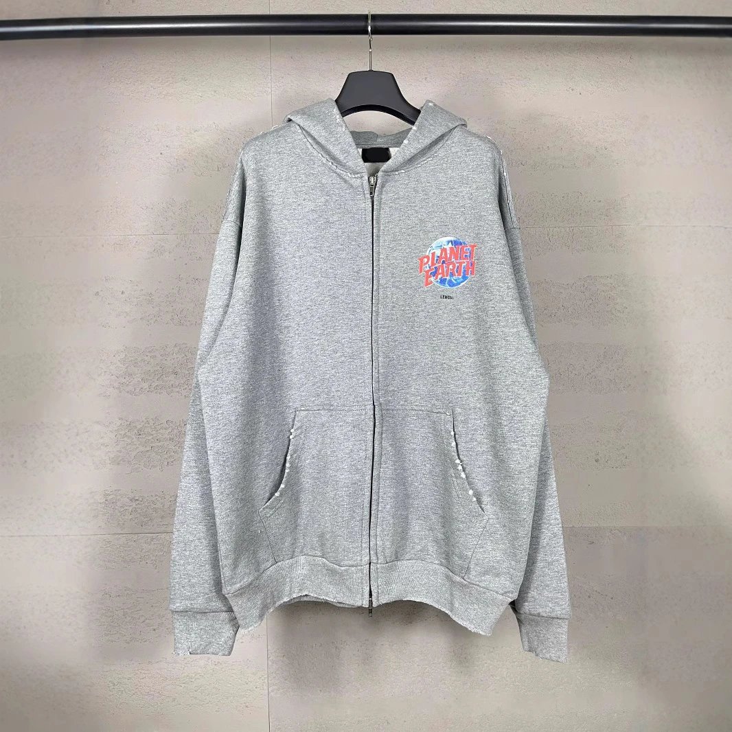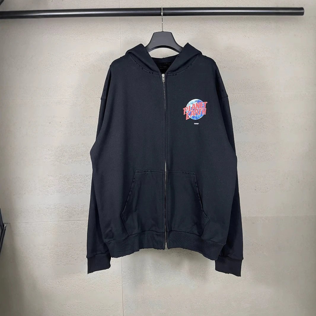 秋冬巴黎走秀款地球图案印花水洗做旧磨烂开衫拉链连帽卫衣