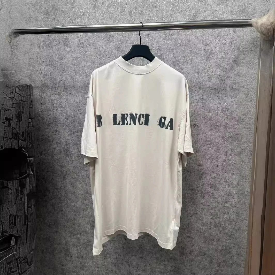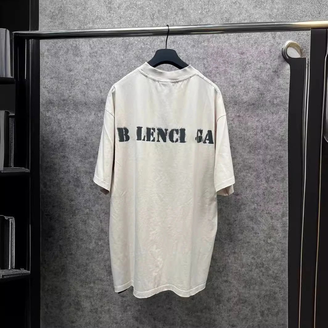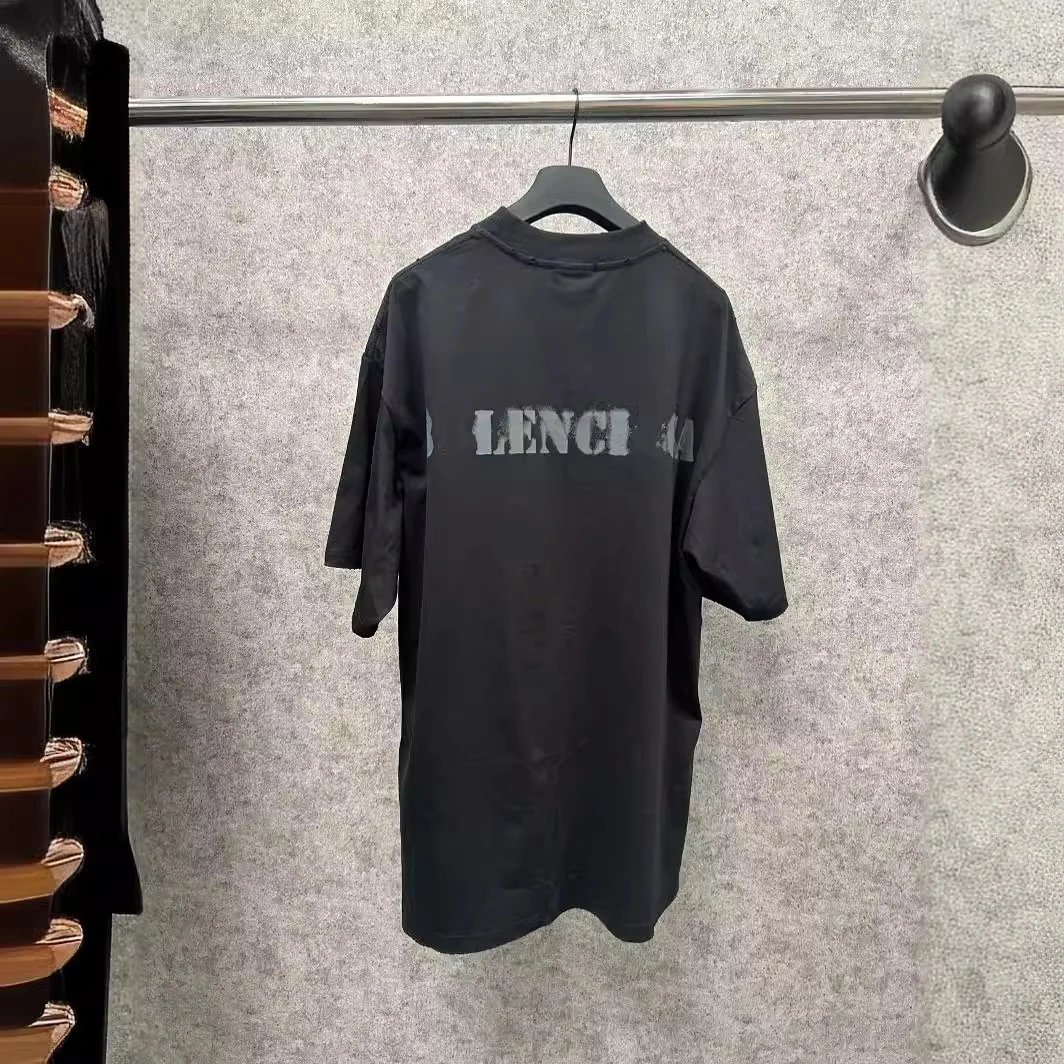 巴黎B家INS网红新品模糊字母印花磨破男女宽松小领口短袖T恤