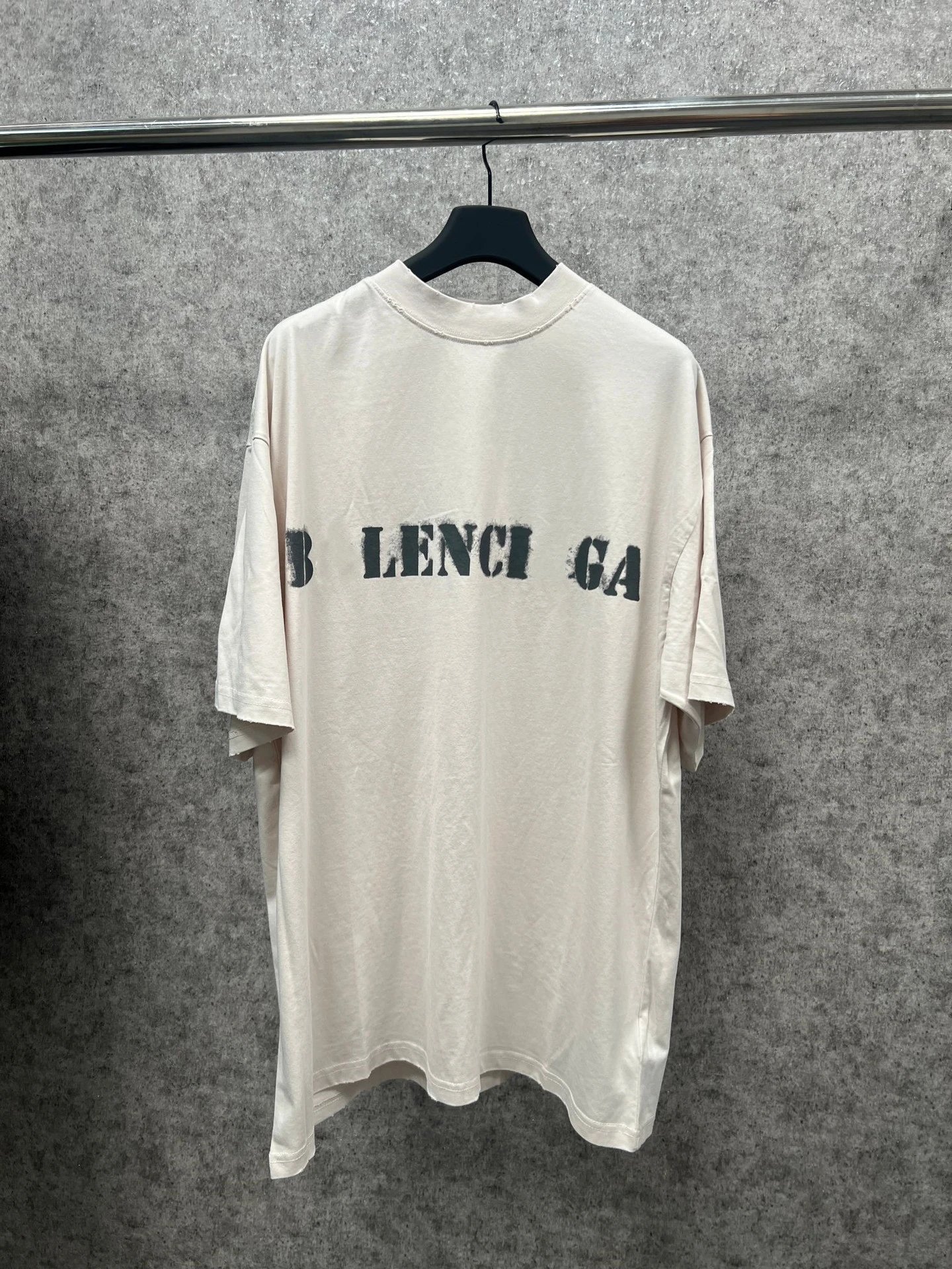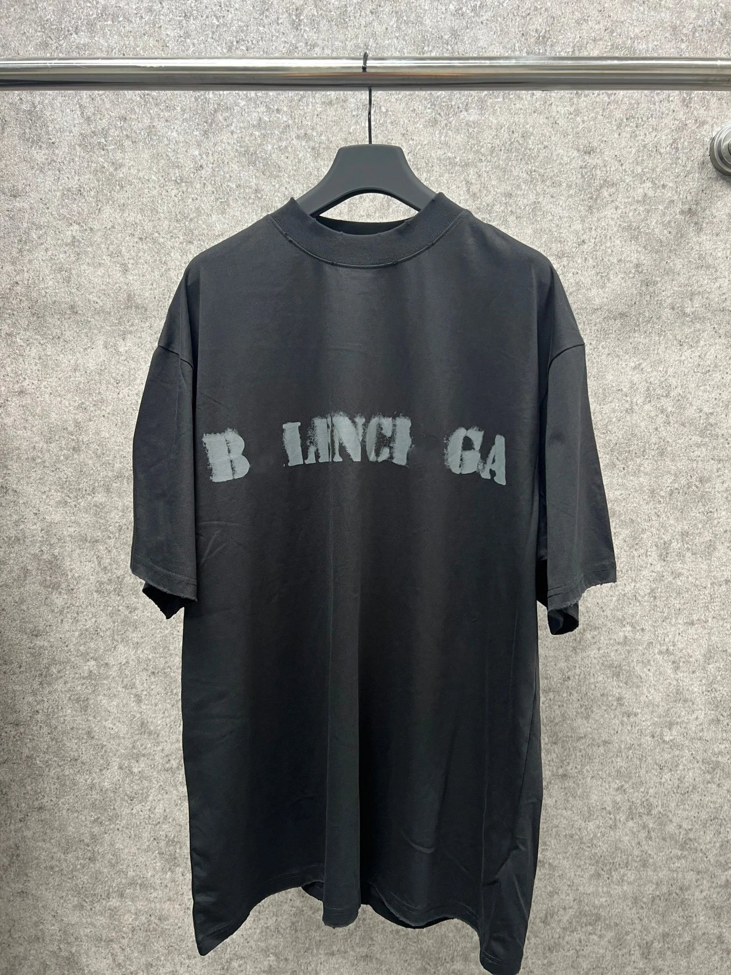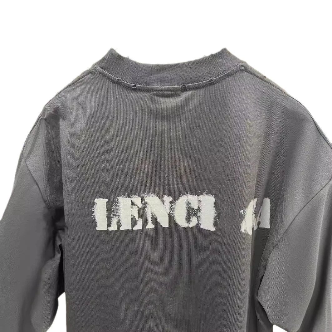 巴黎B家INS网红新品模糊字母印花磨破男女宽松小领口短袖T恤