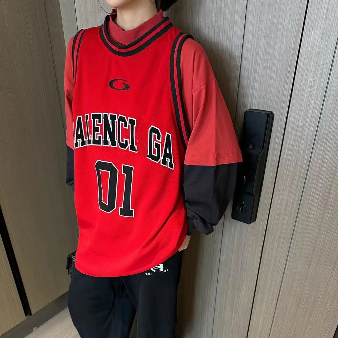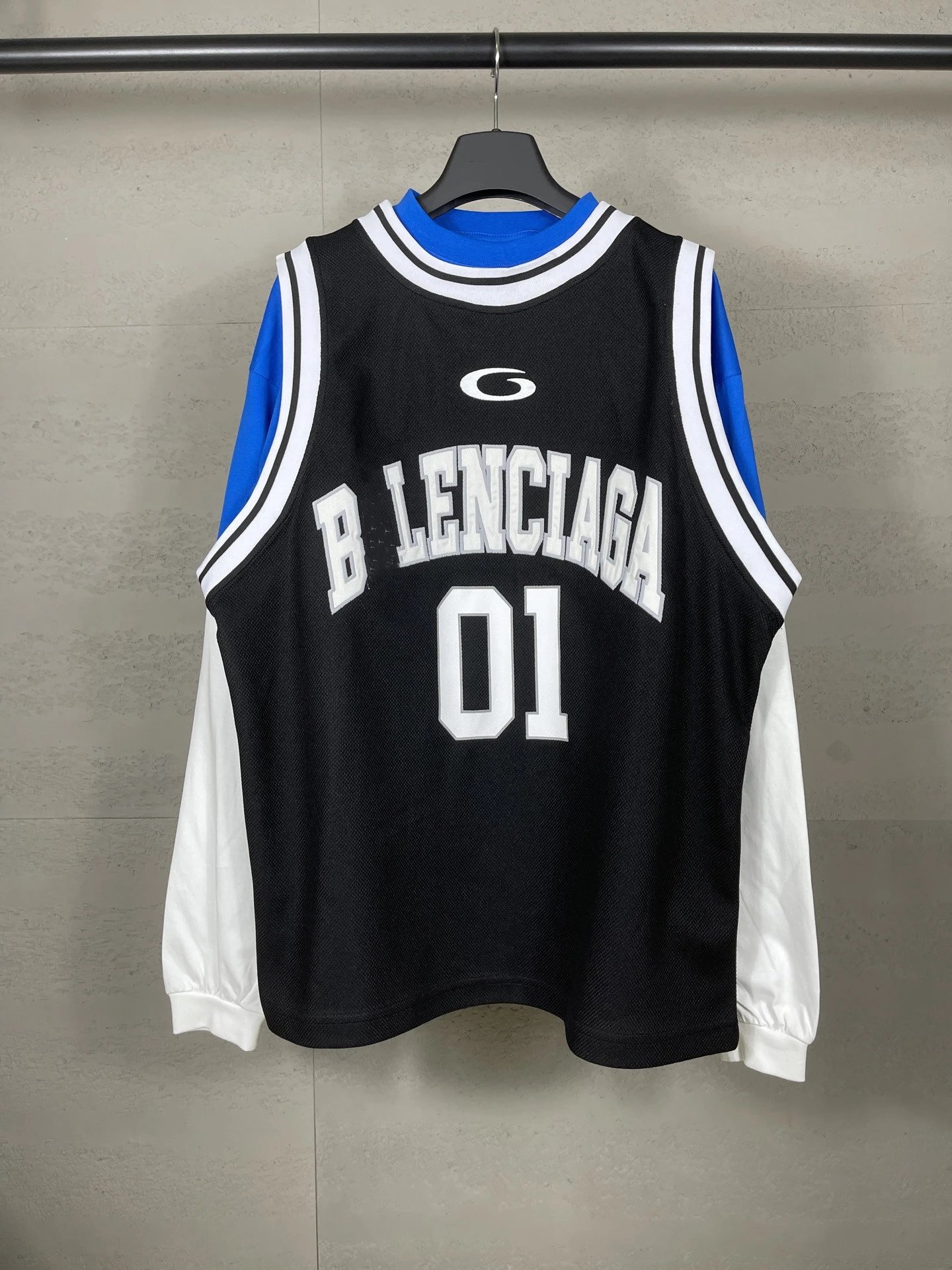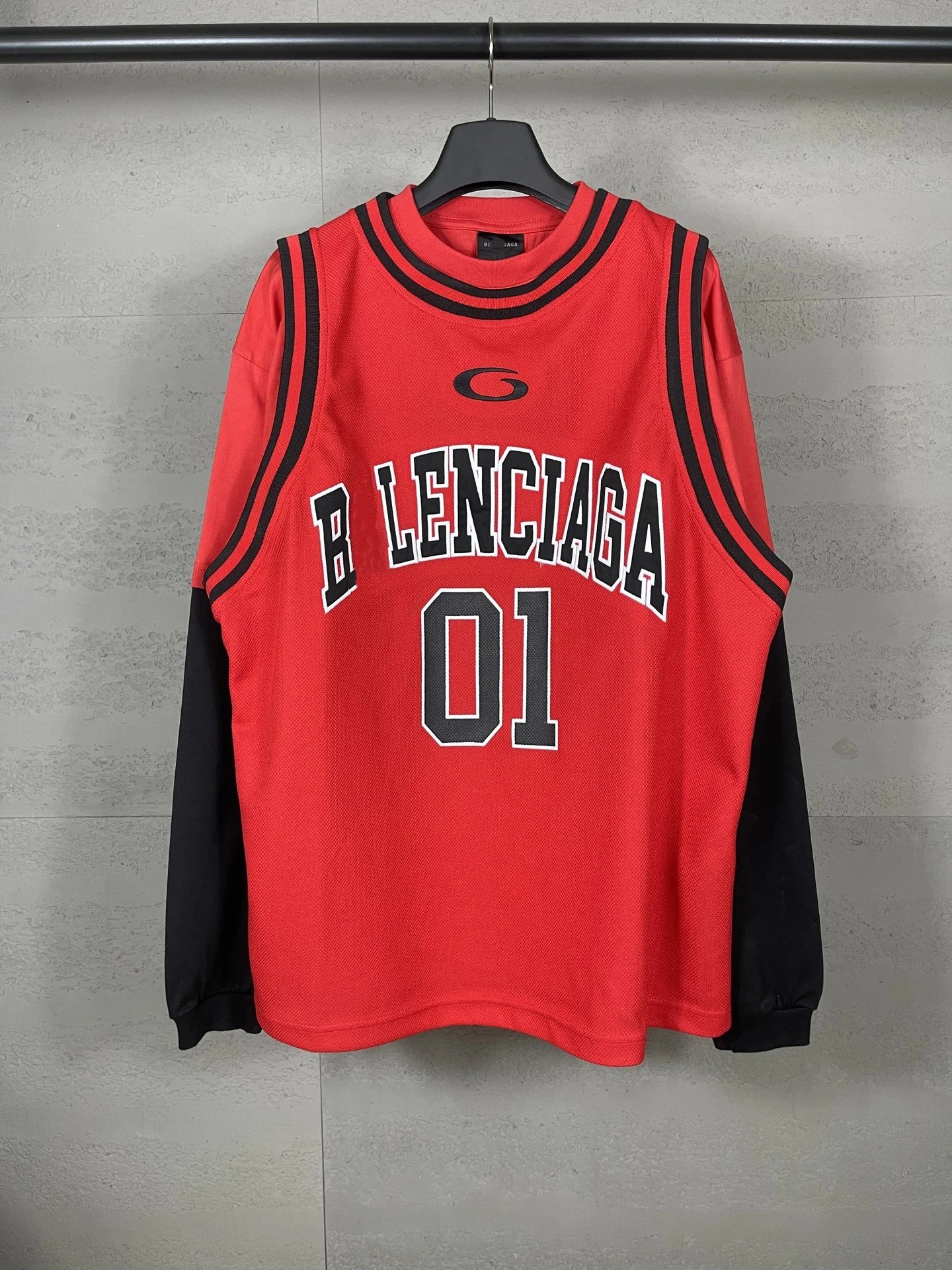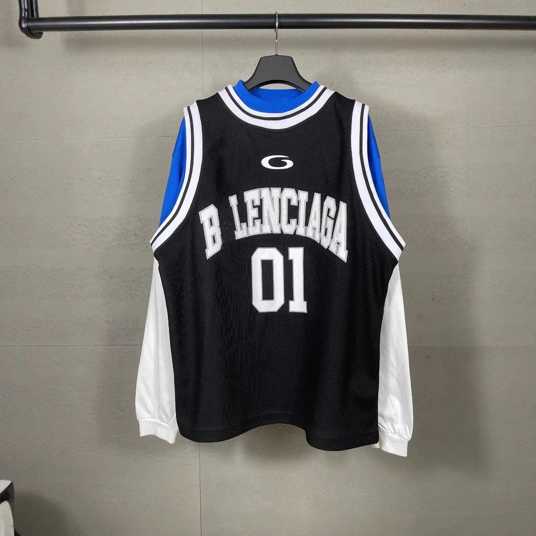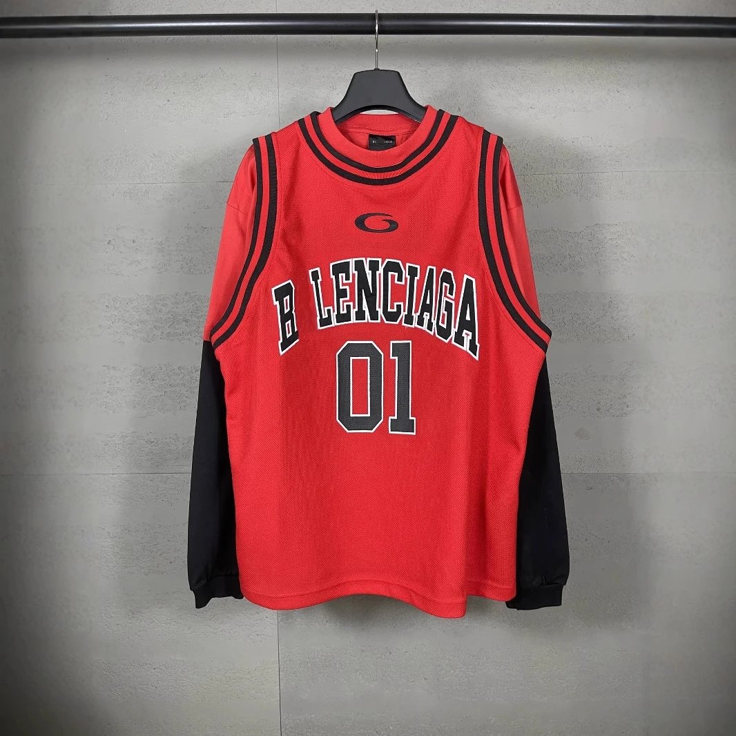 本早秋新款巴黎B家篮球球服假三件套绣花印花长袖T恤男女