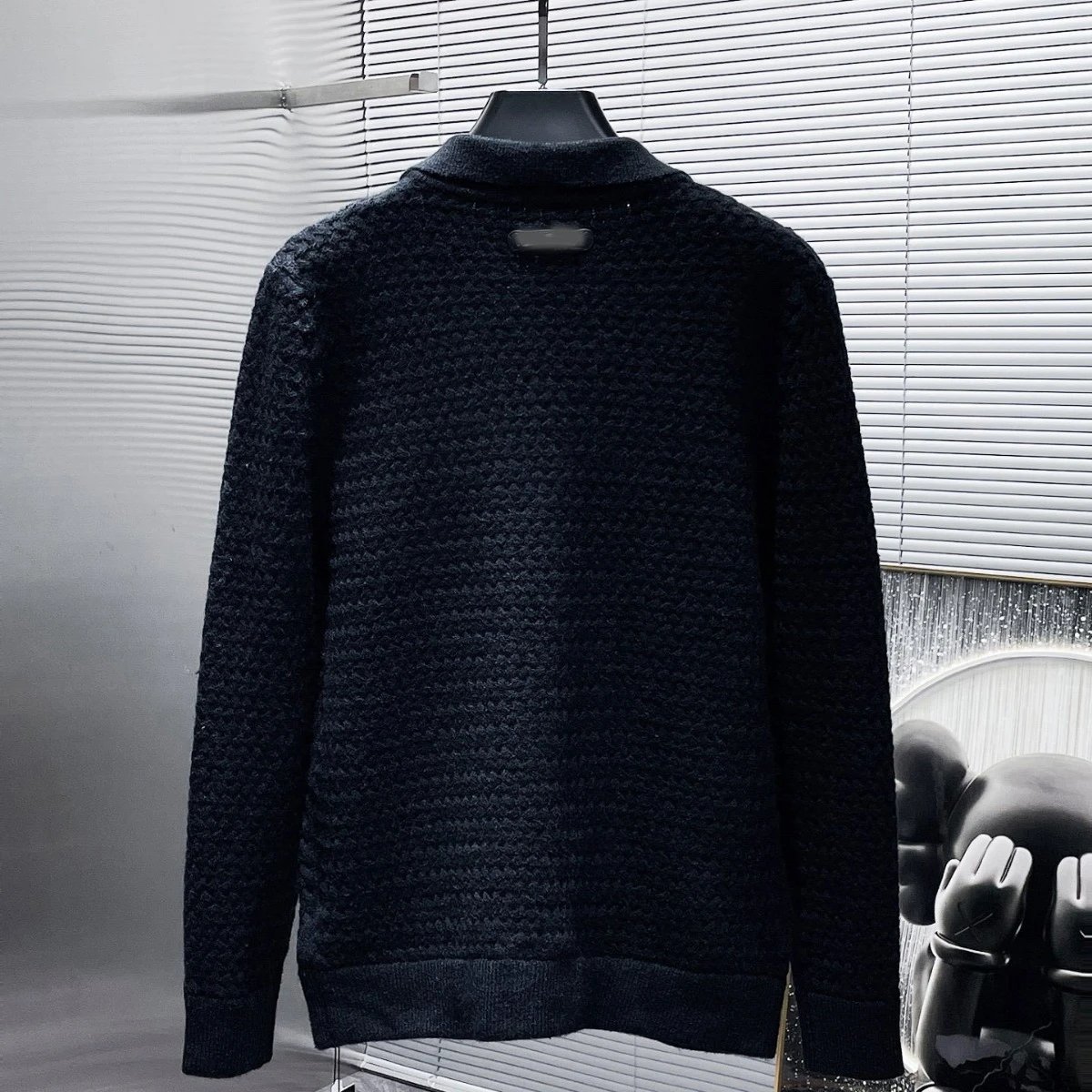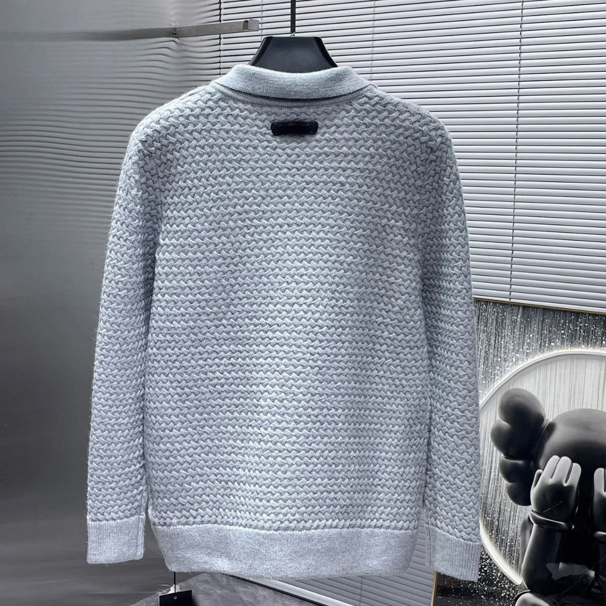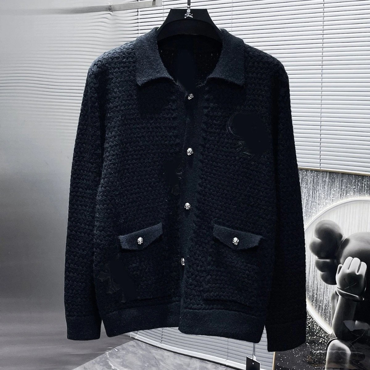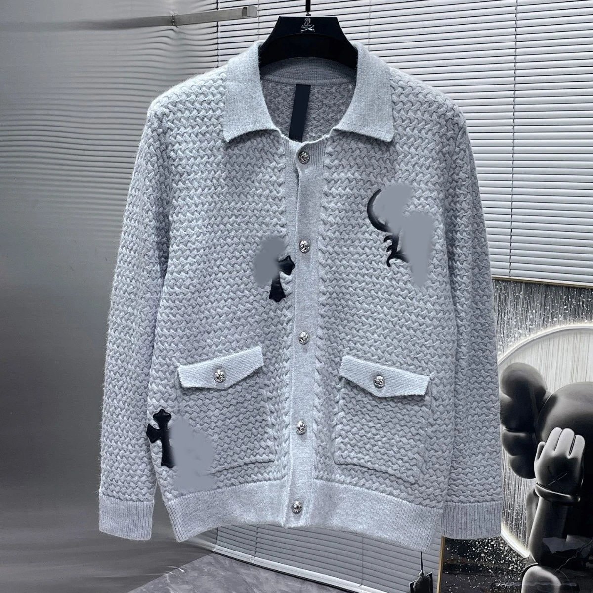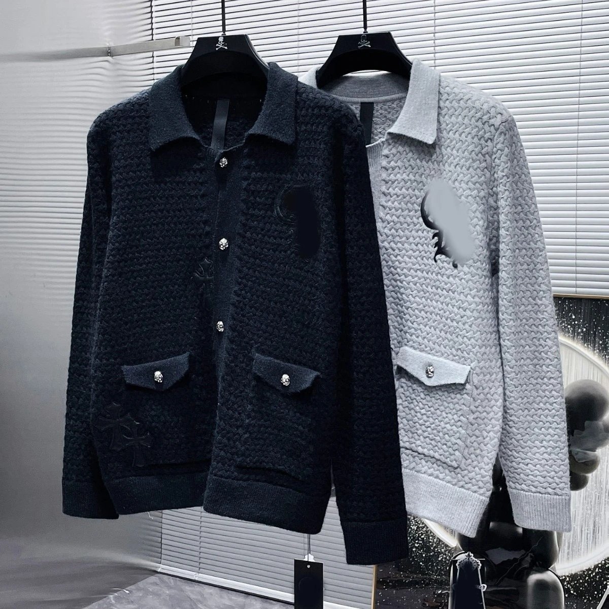 秋冬CH华夫格纹拼皮开衫毛衣男女款针织衫情侣款潮流百搭