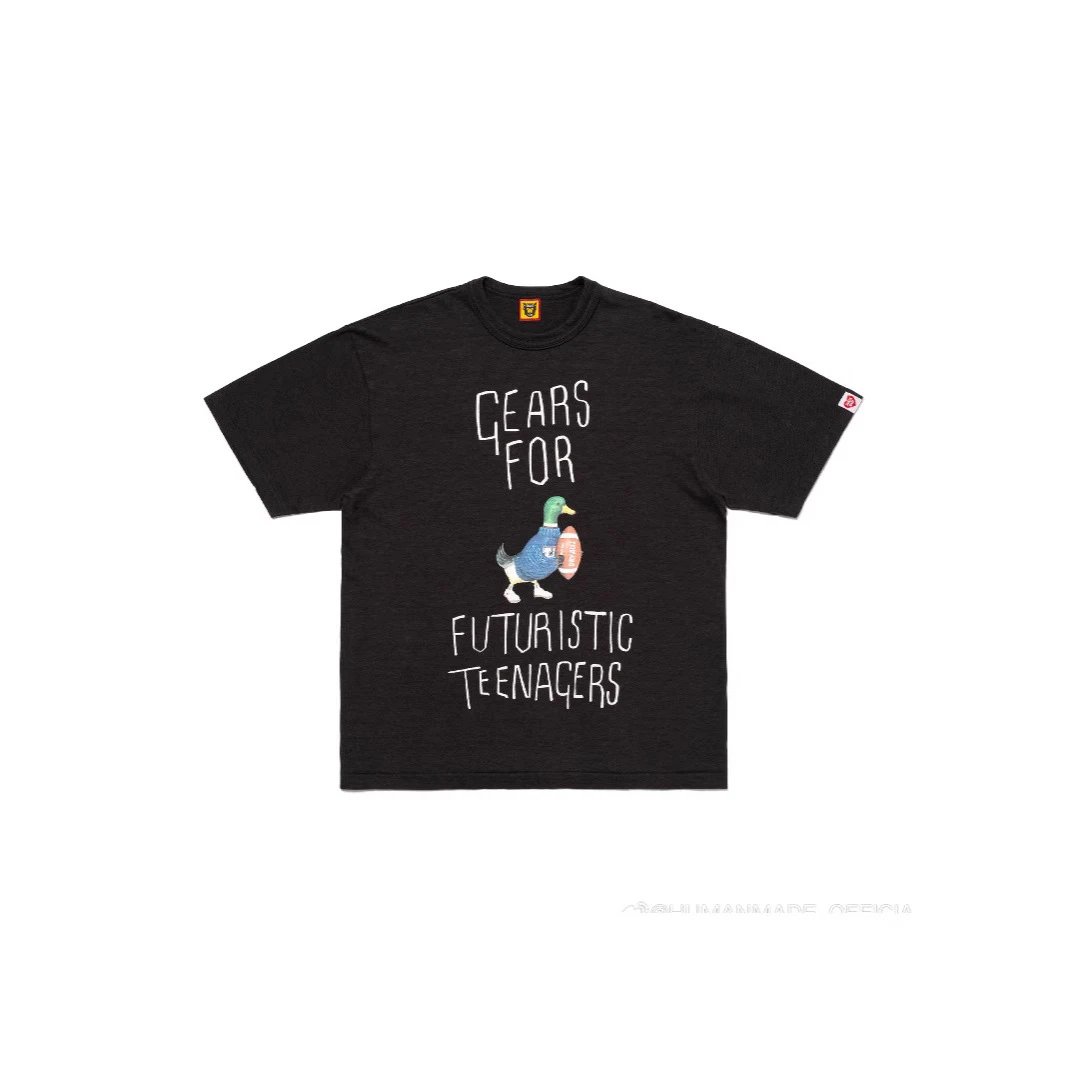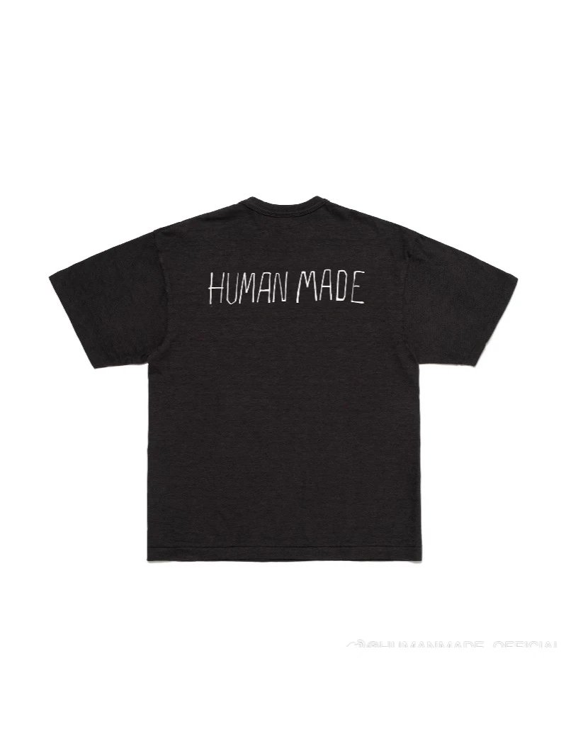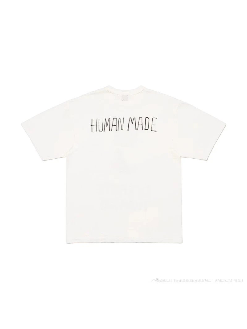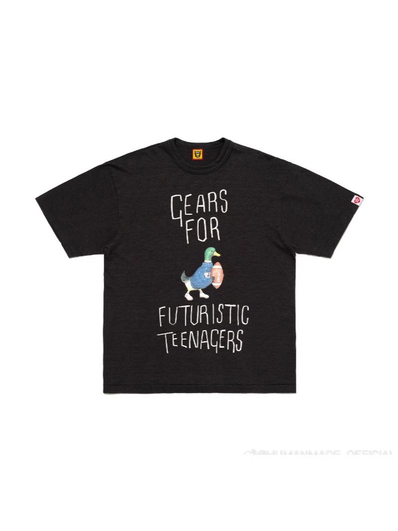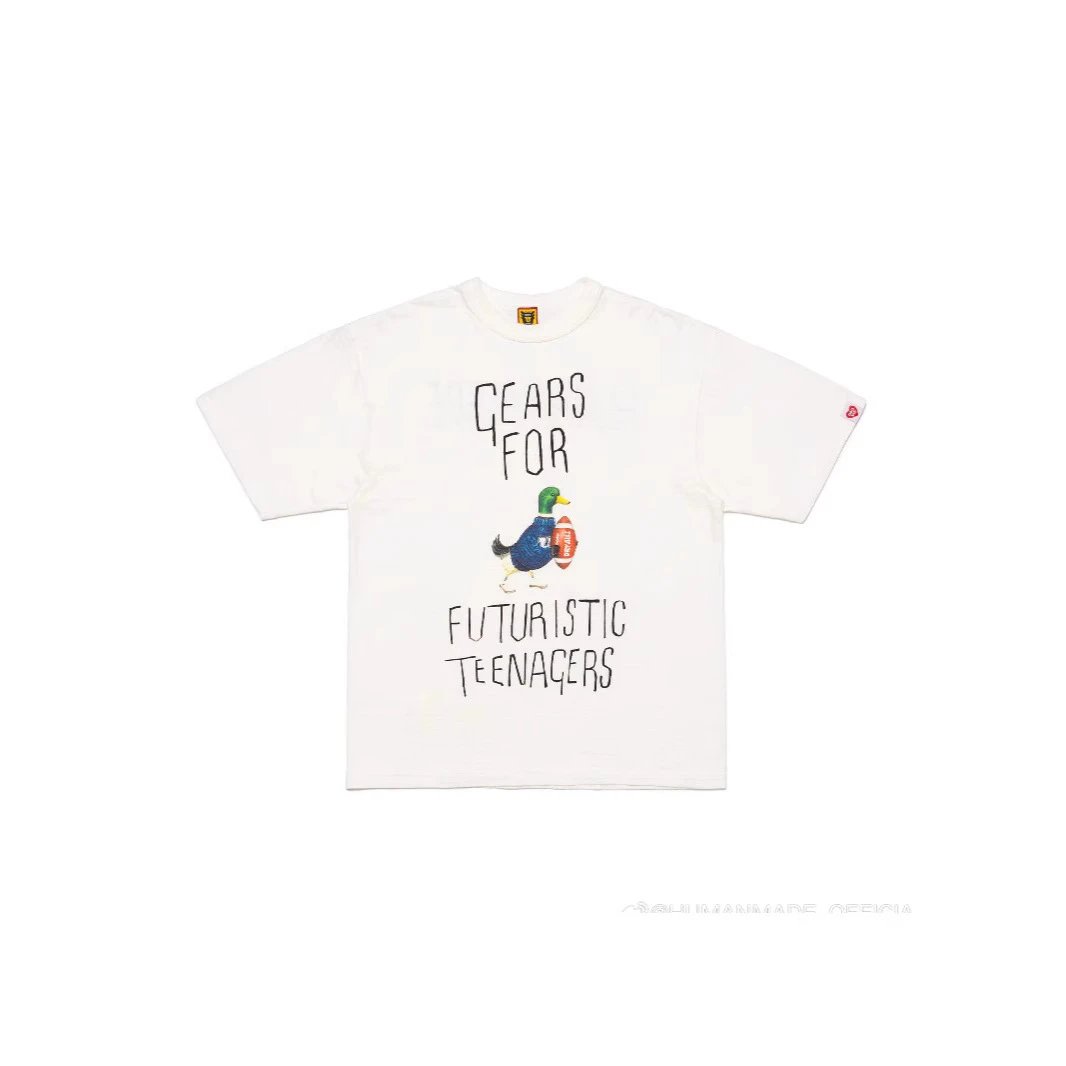 日系潮牌复古HUMAN 小鸟字母卡通图案印花短袖竹节棉宽松T恤