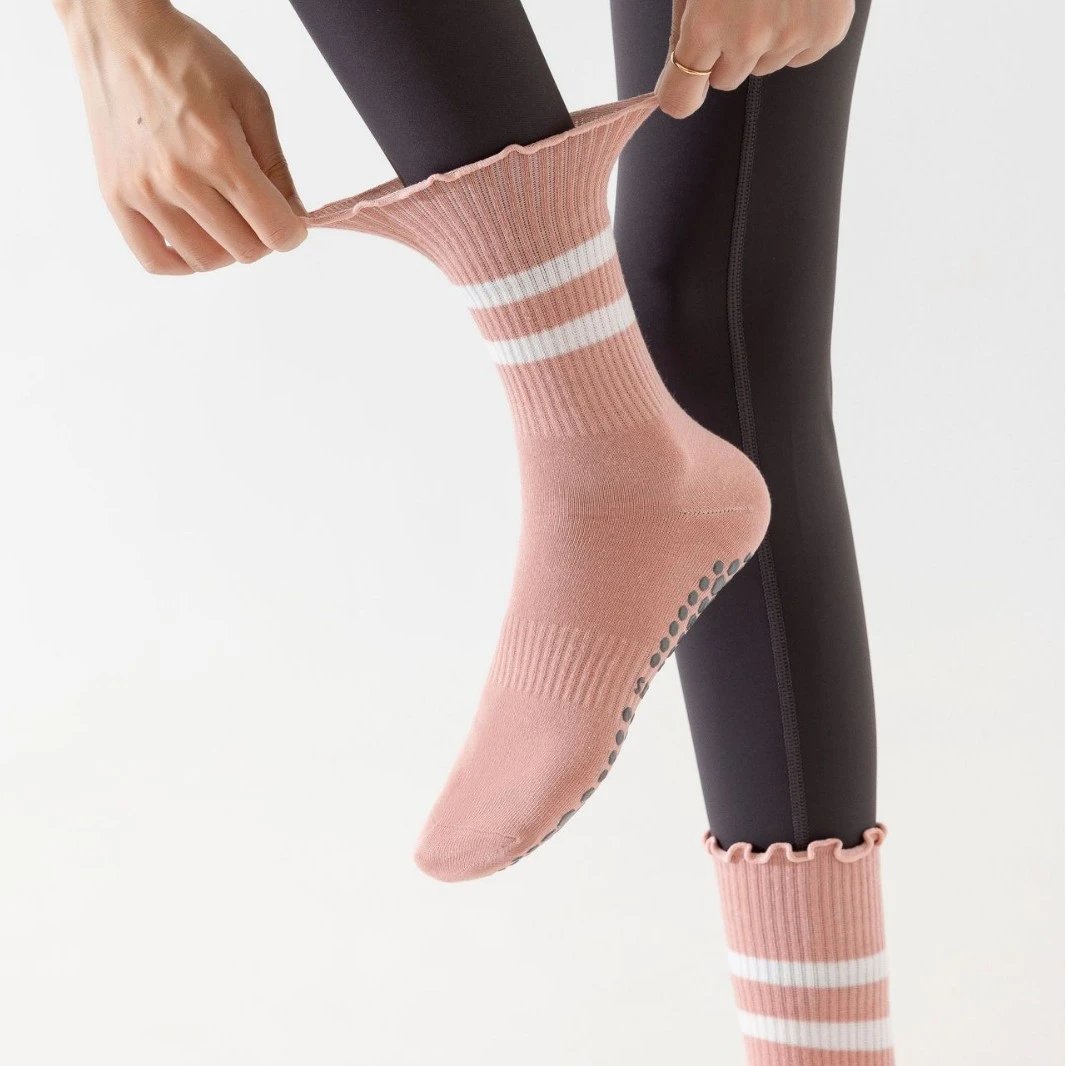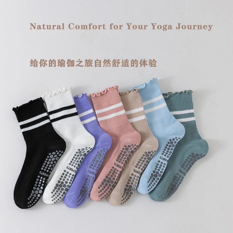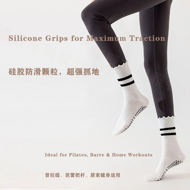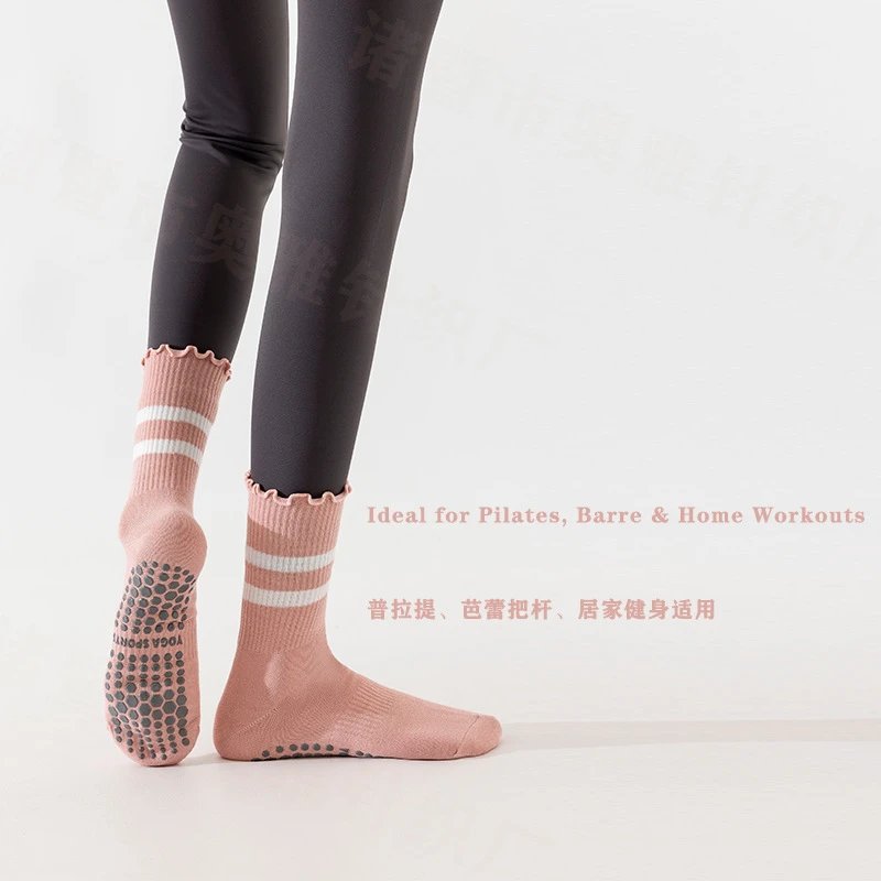 防滑吸汗专业瑜伽袜女中筒普拉提木耳边条纹运动袜健身高弹透气