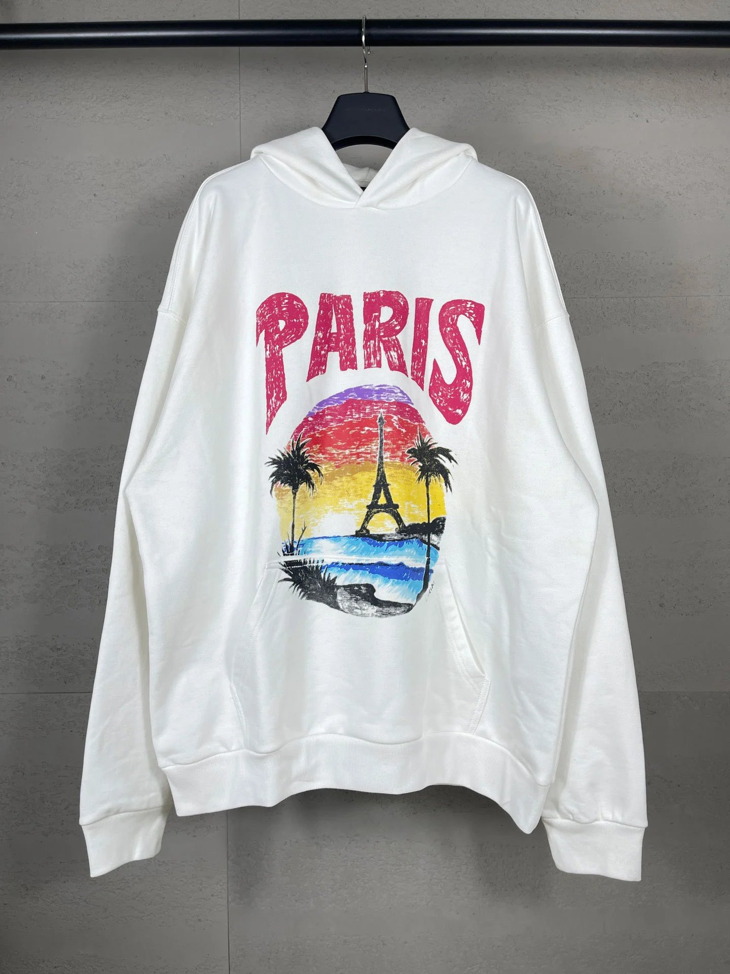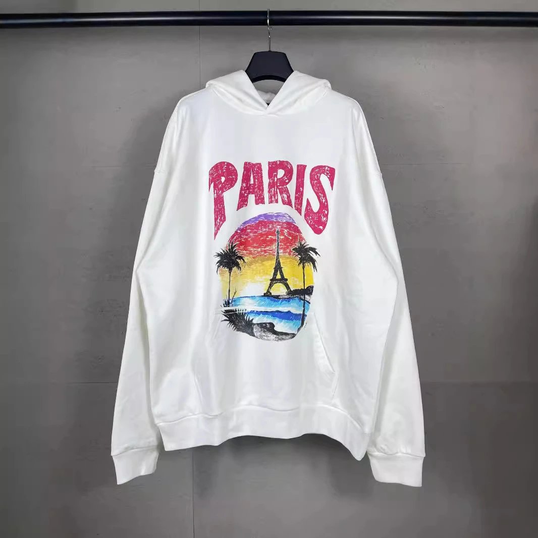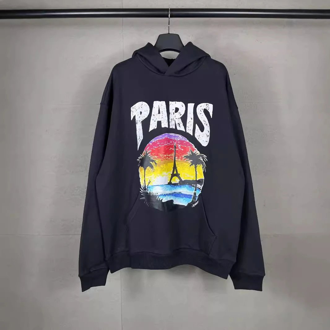 秋冬巴黎夏威夷落日椰树铁塔LOGO图案直喷印花连帽卫衣宽松休闲男