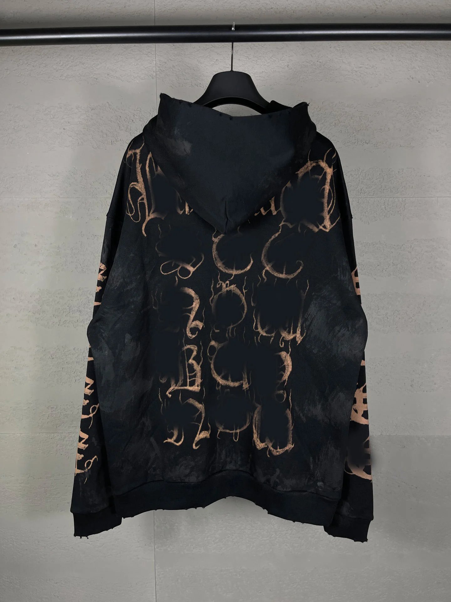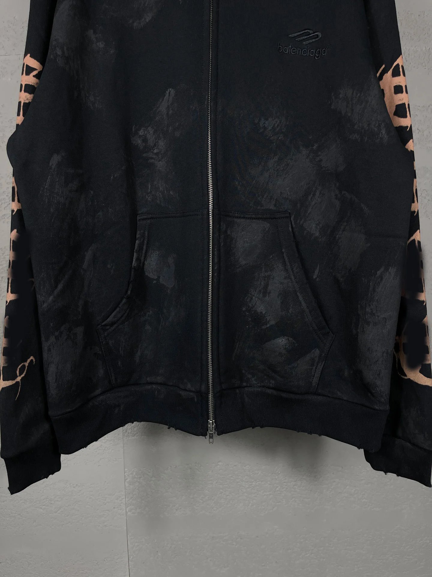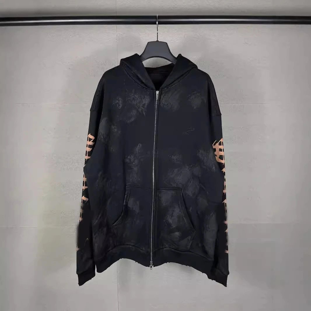 秋冬巴黎梵文字母LOGO手绘涂鸦洗水做旧磨烂拉链开衫连帽卫衣