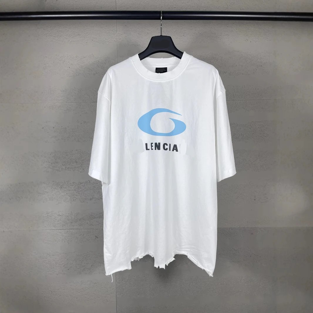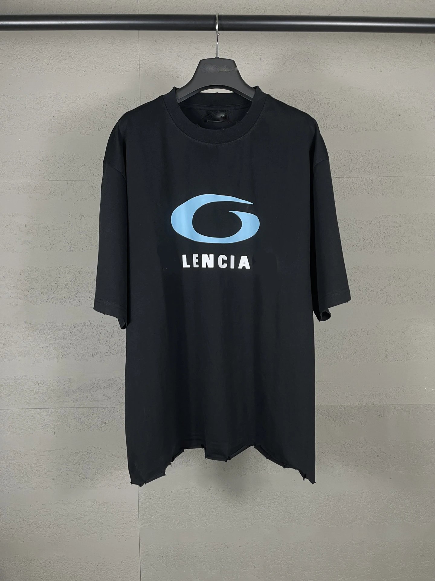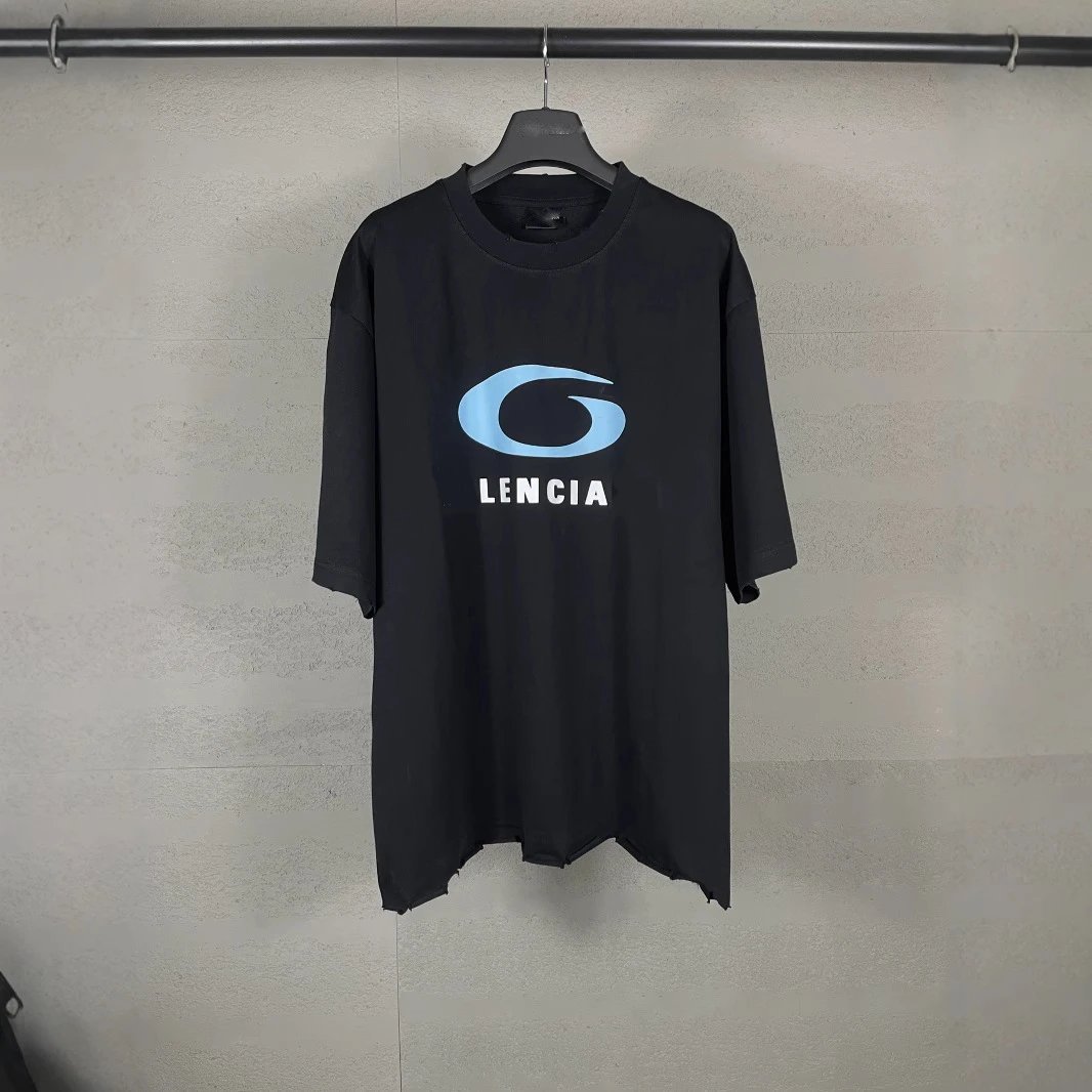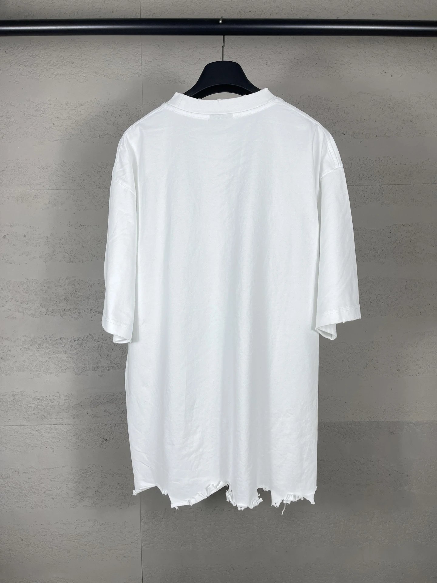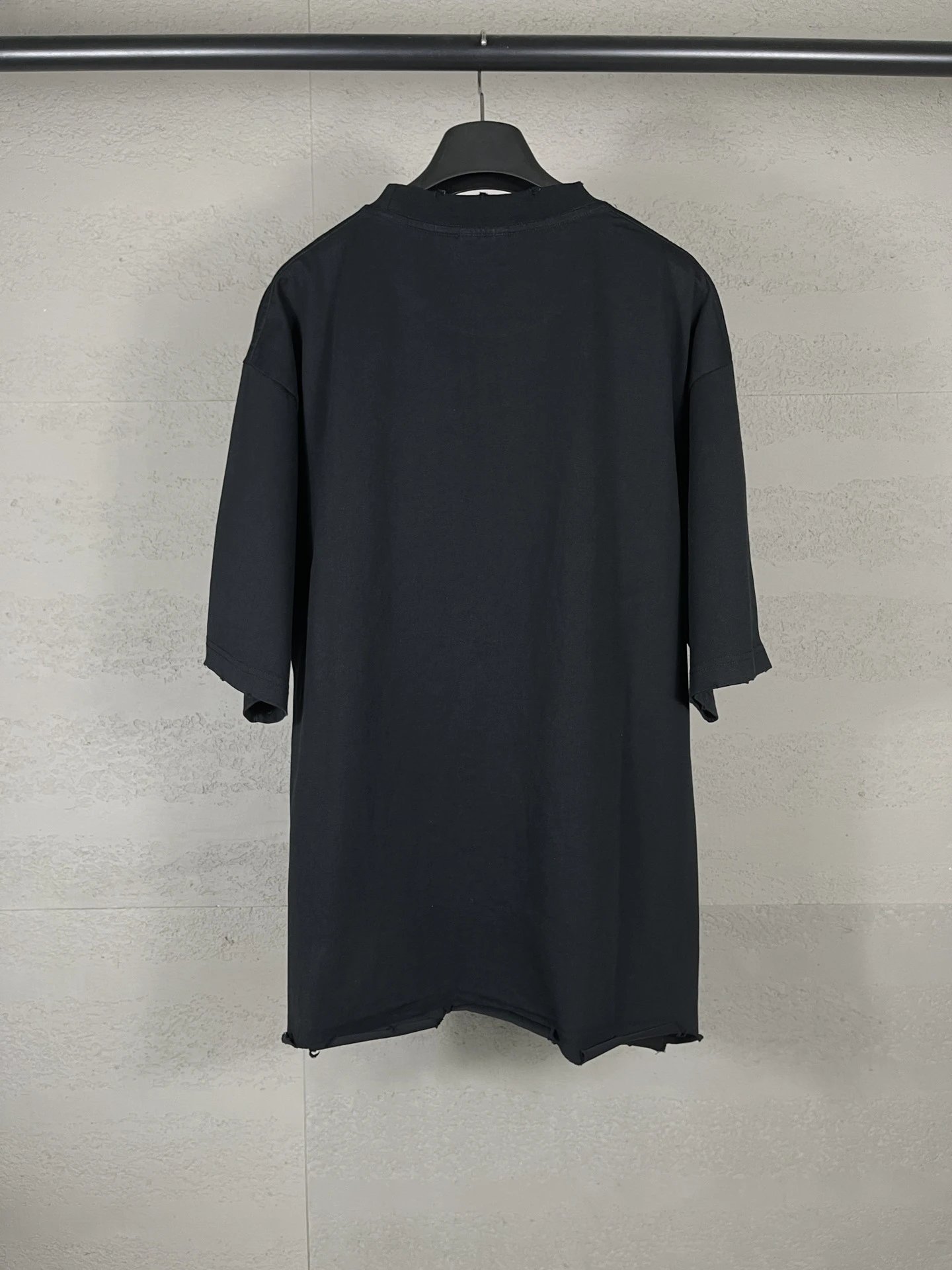 巴黎经典LOGO印花洗水下摆破坏磨烂宽松短袖T恤半袖男女款情侣潮