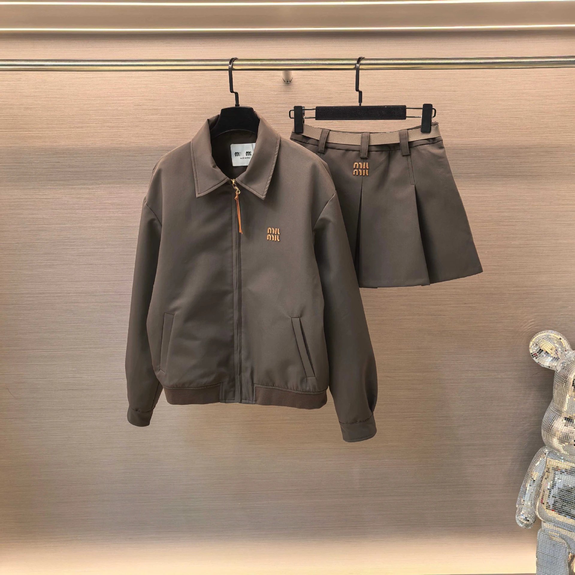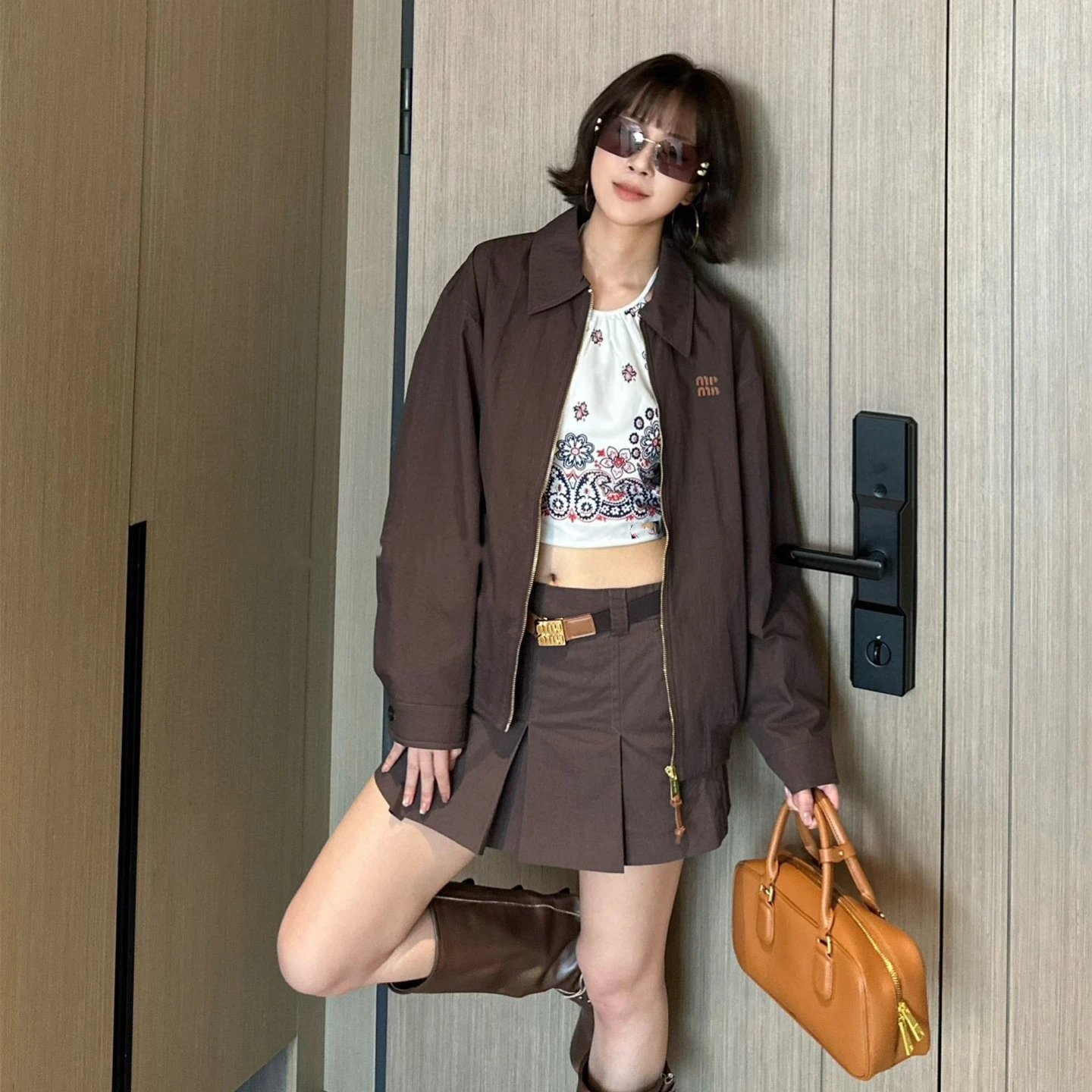 MIU缪家INS网红款可可棕翻领夹克外套 半裙短裙套装女装