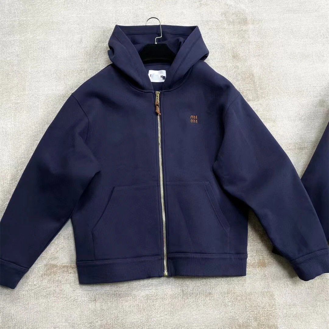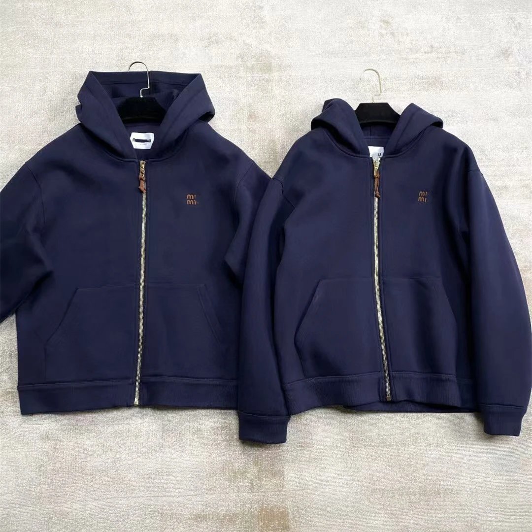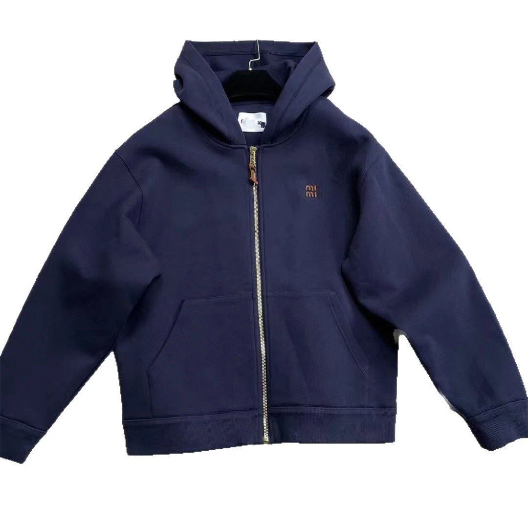MIU缪家网红款徽标LOGO皮标藏青色太空棉连帽夹克外套男女