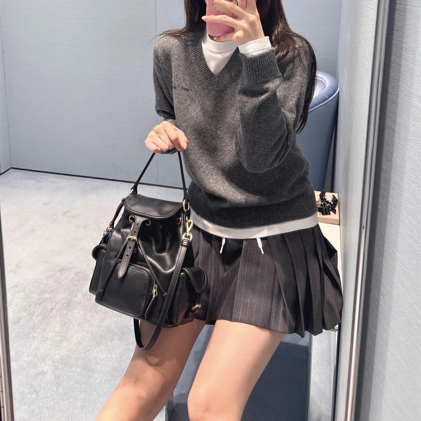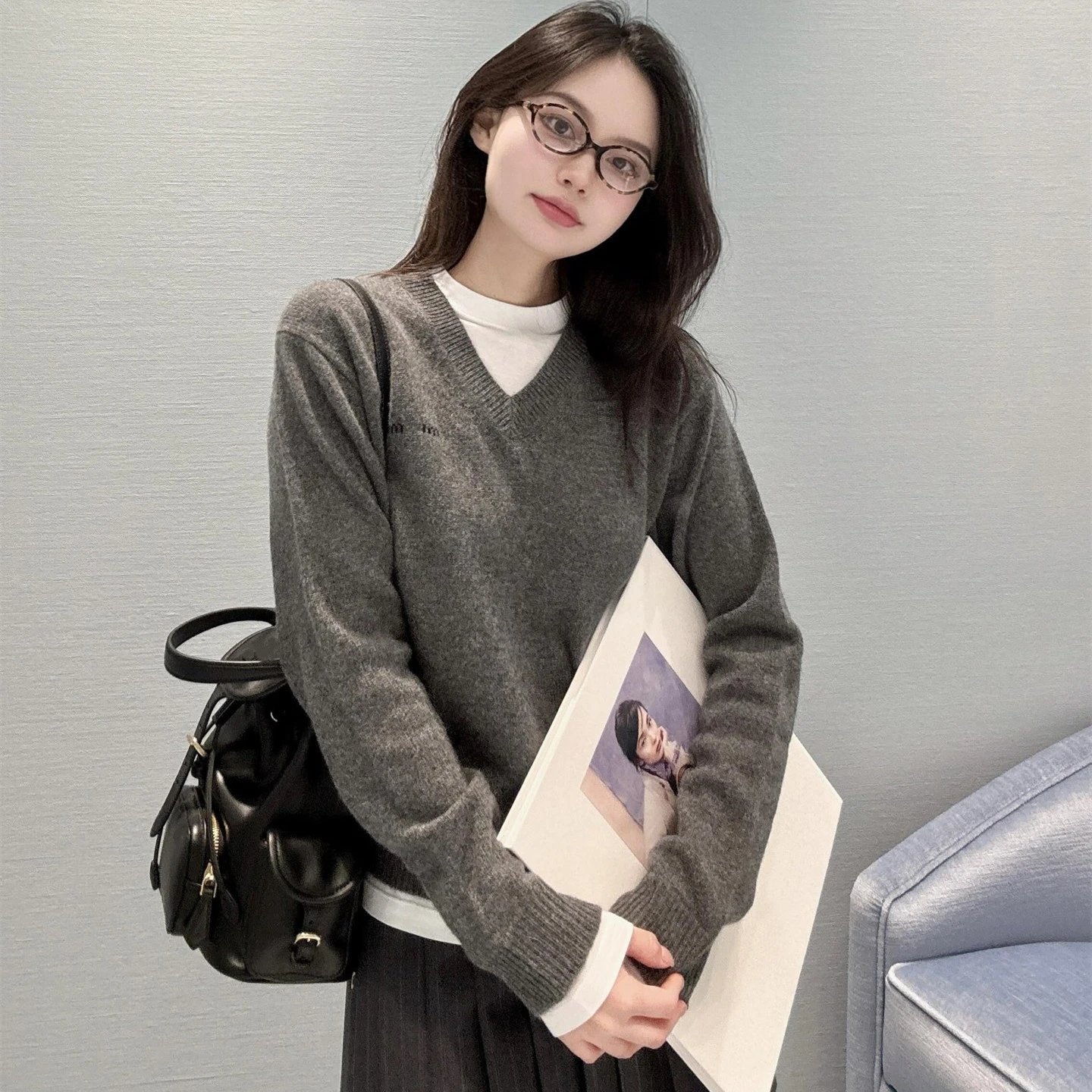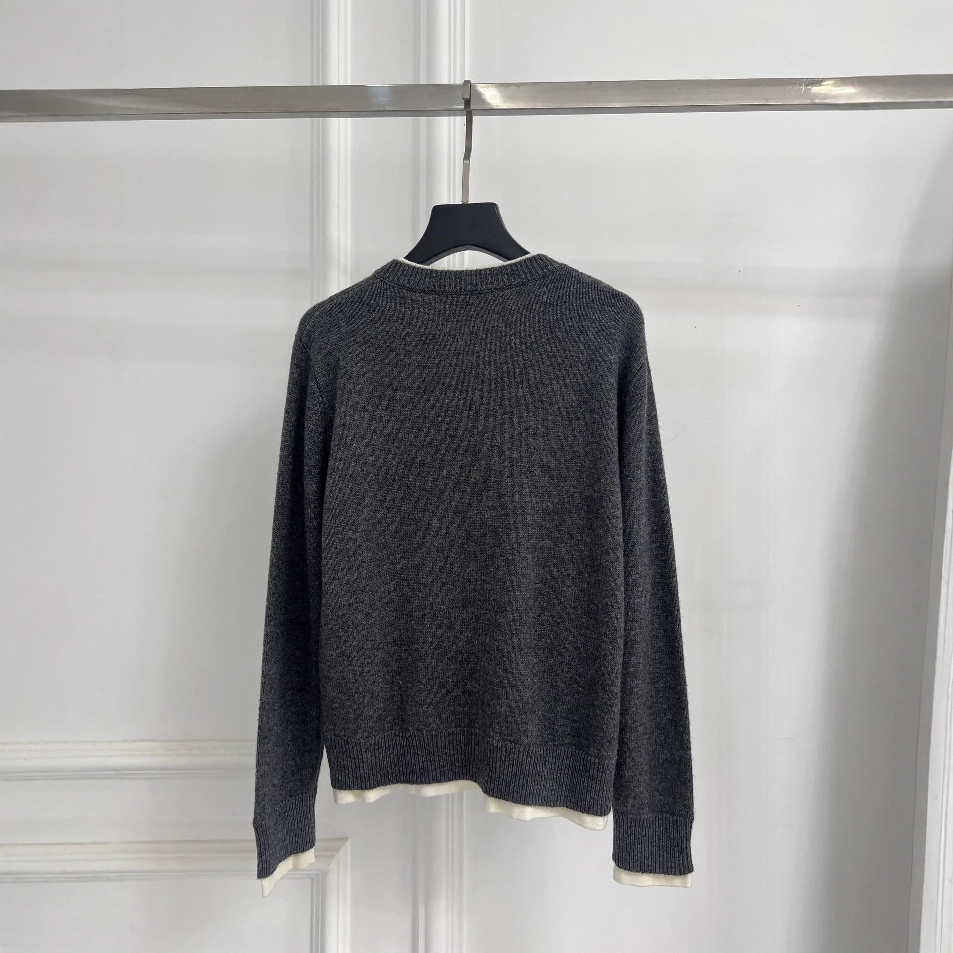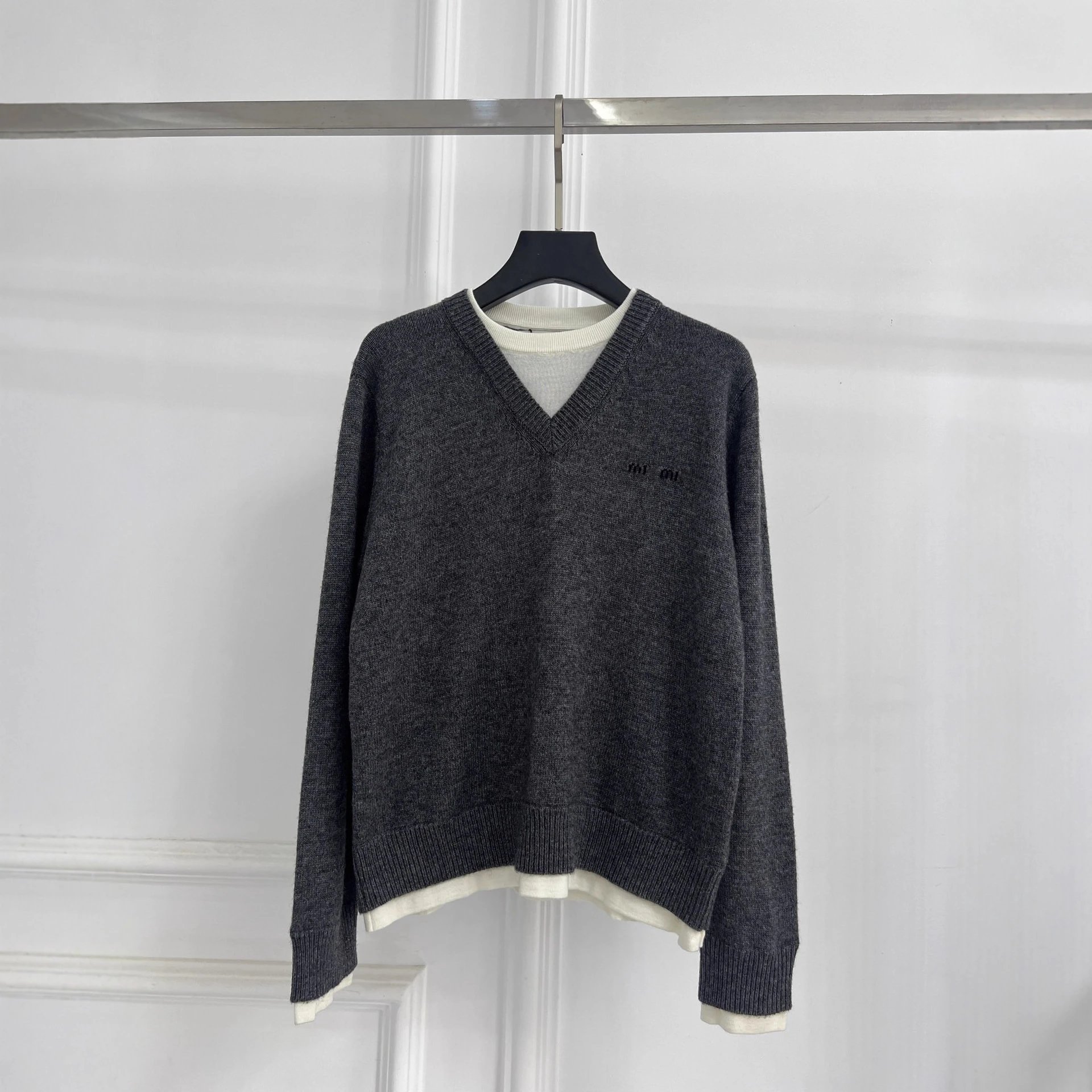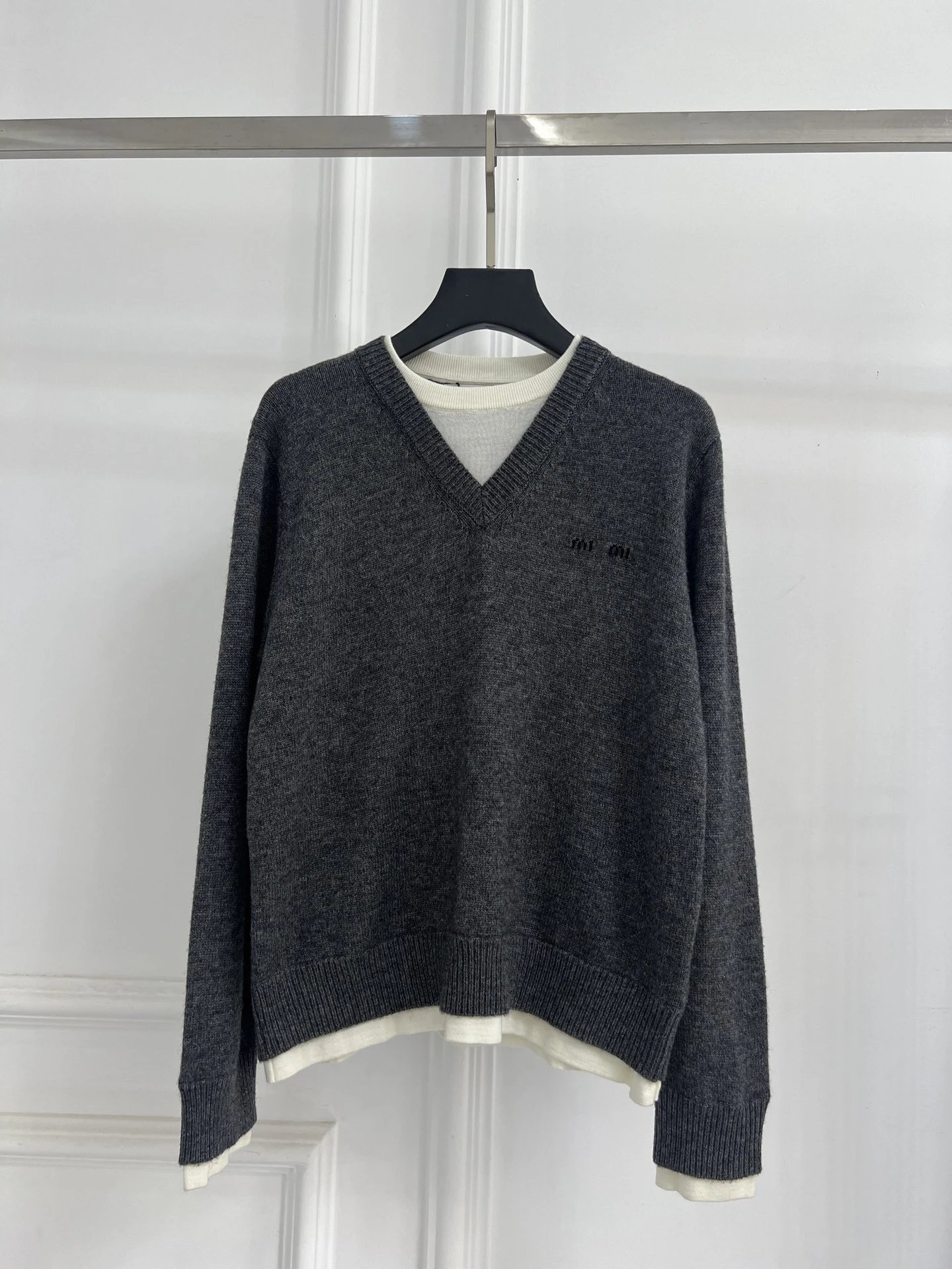 本MIU缪家款撞色假两件长袖圆领针织衫V领毛衣男女