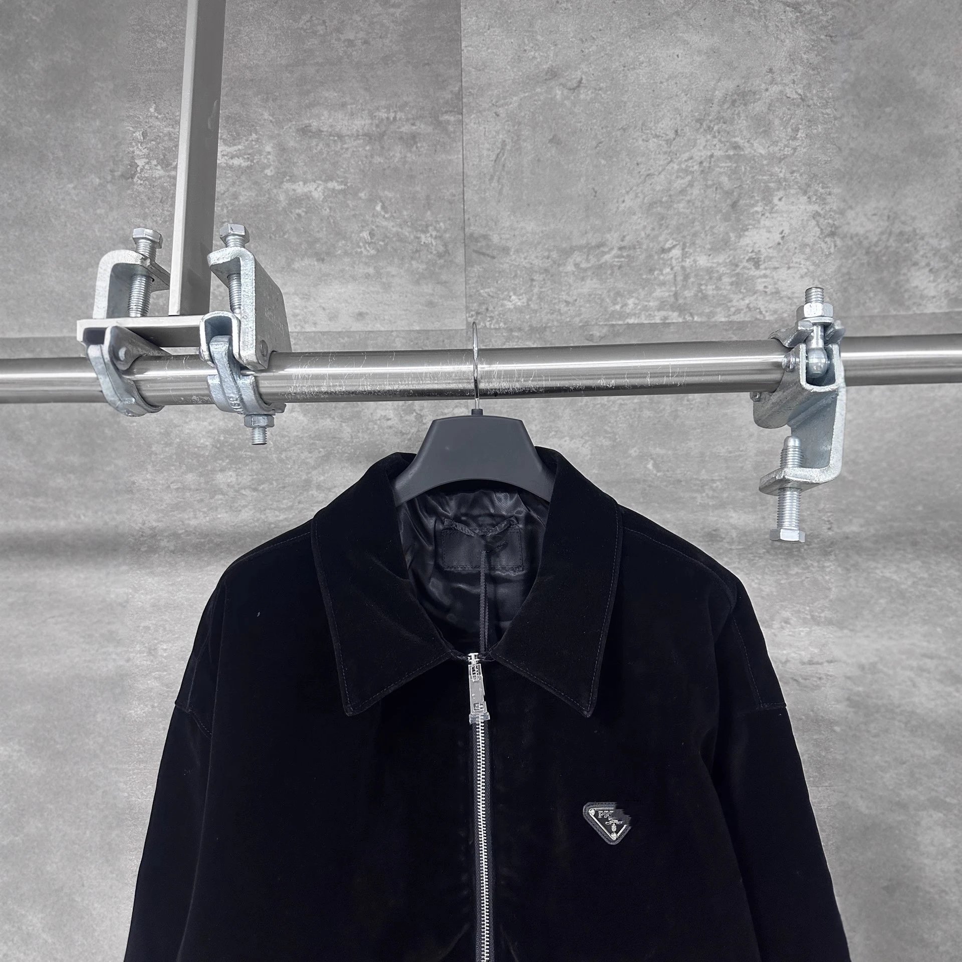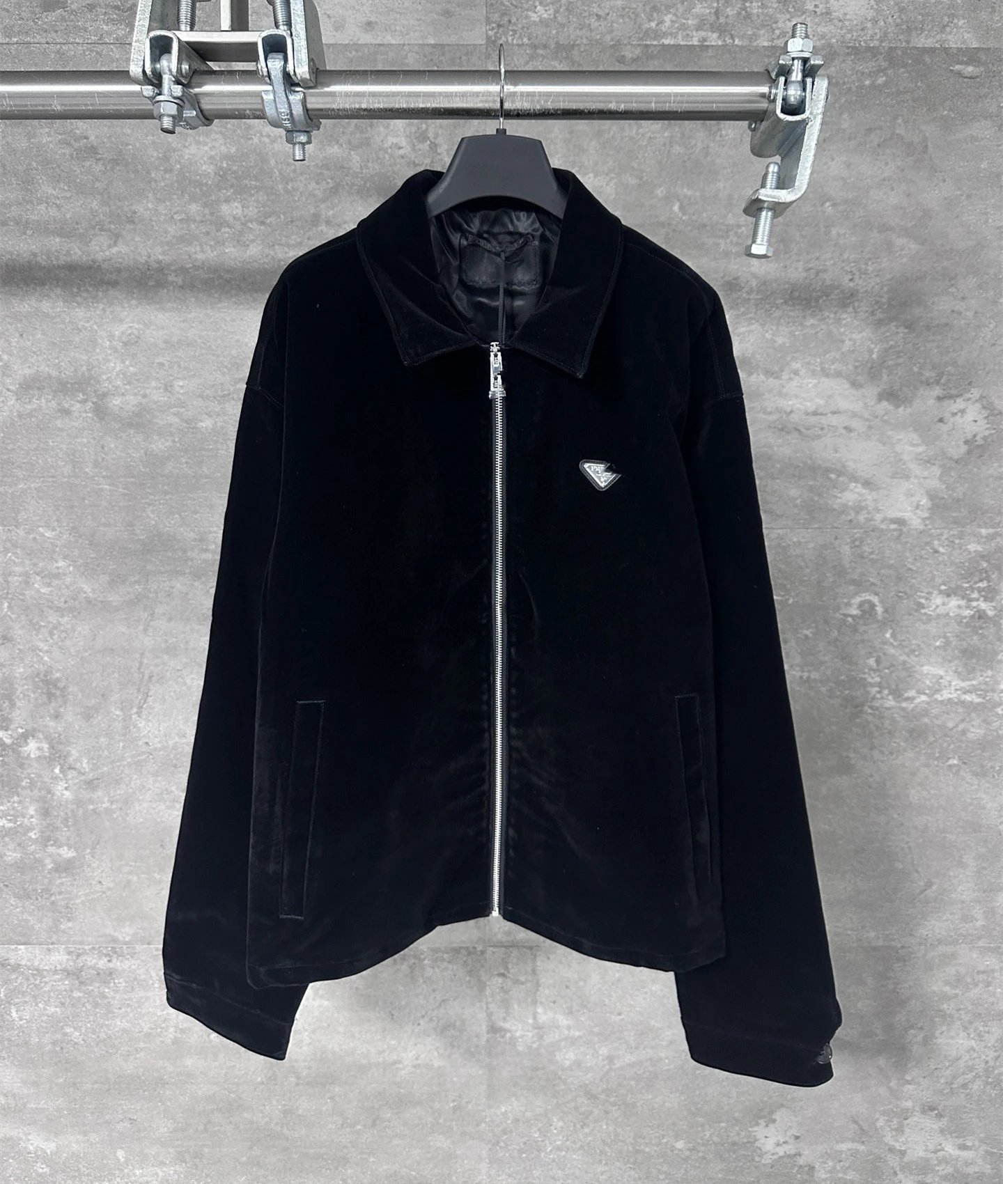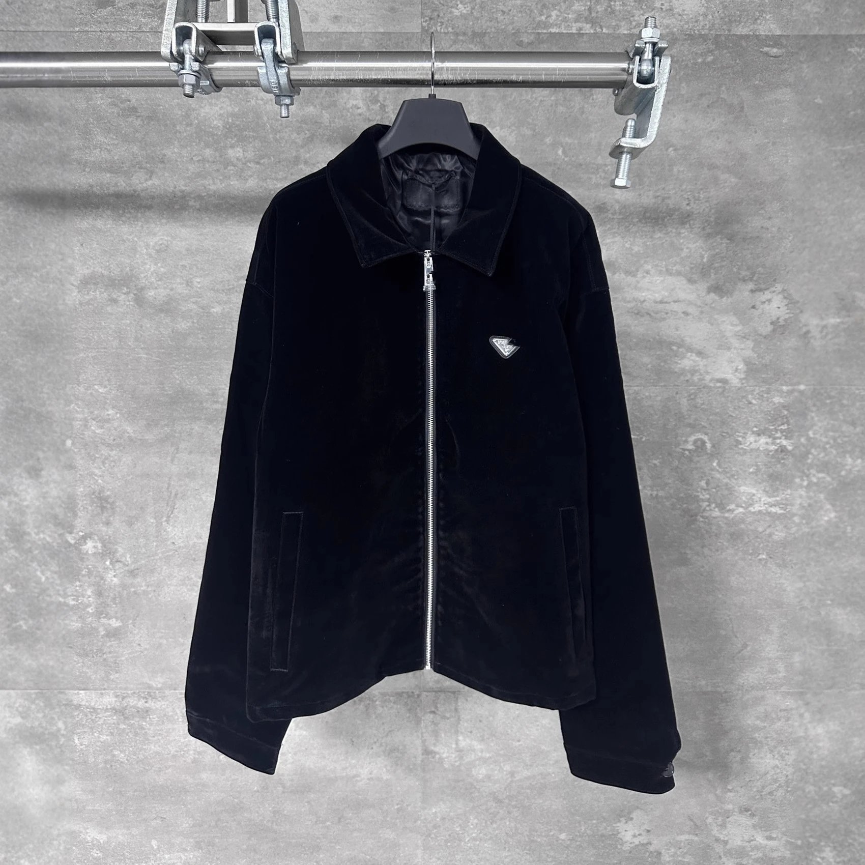 P家网红款三角标哑光天鹅绒黑色翻领夹克外套男女