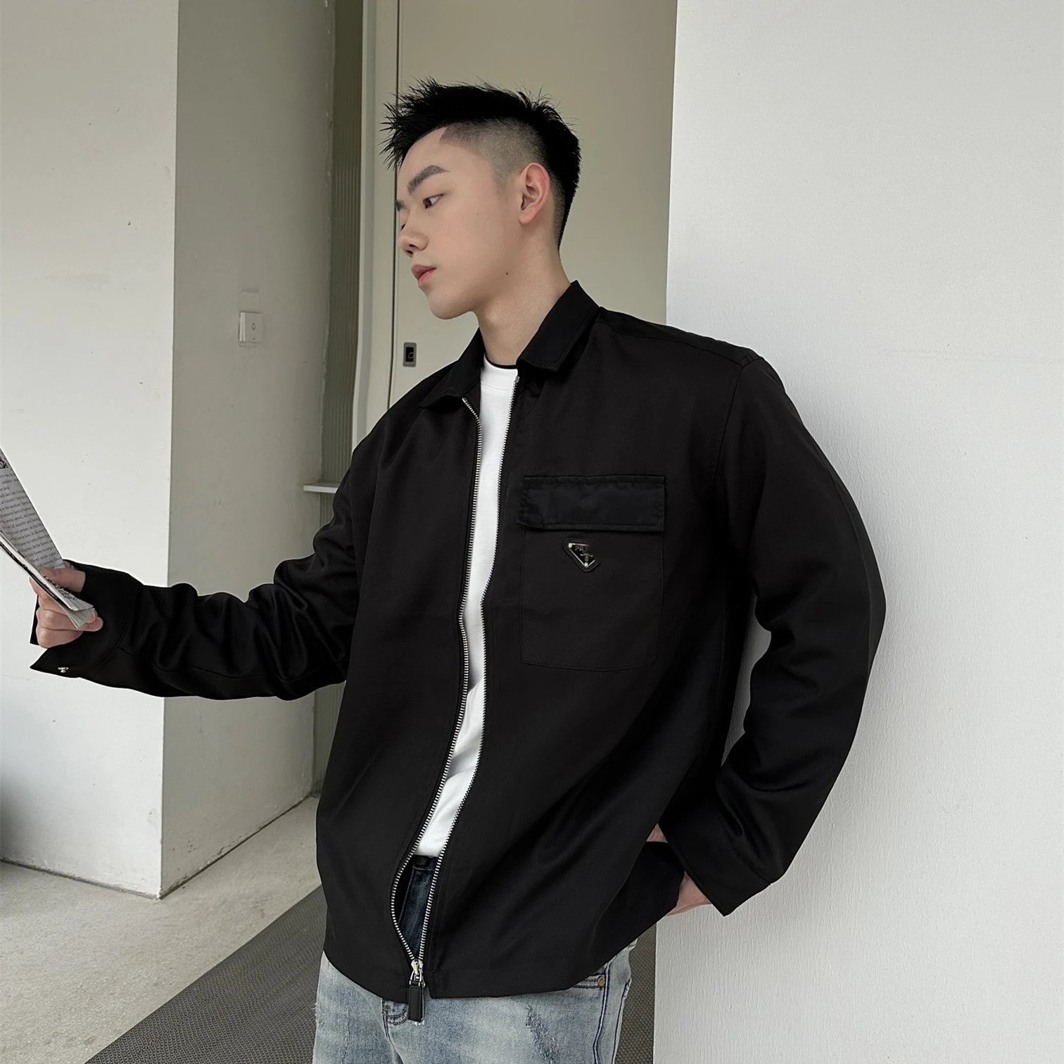 早春奢潮P家三角铁标LOGO口袋梭织拉链夹克外套