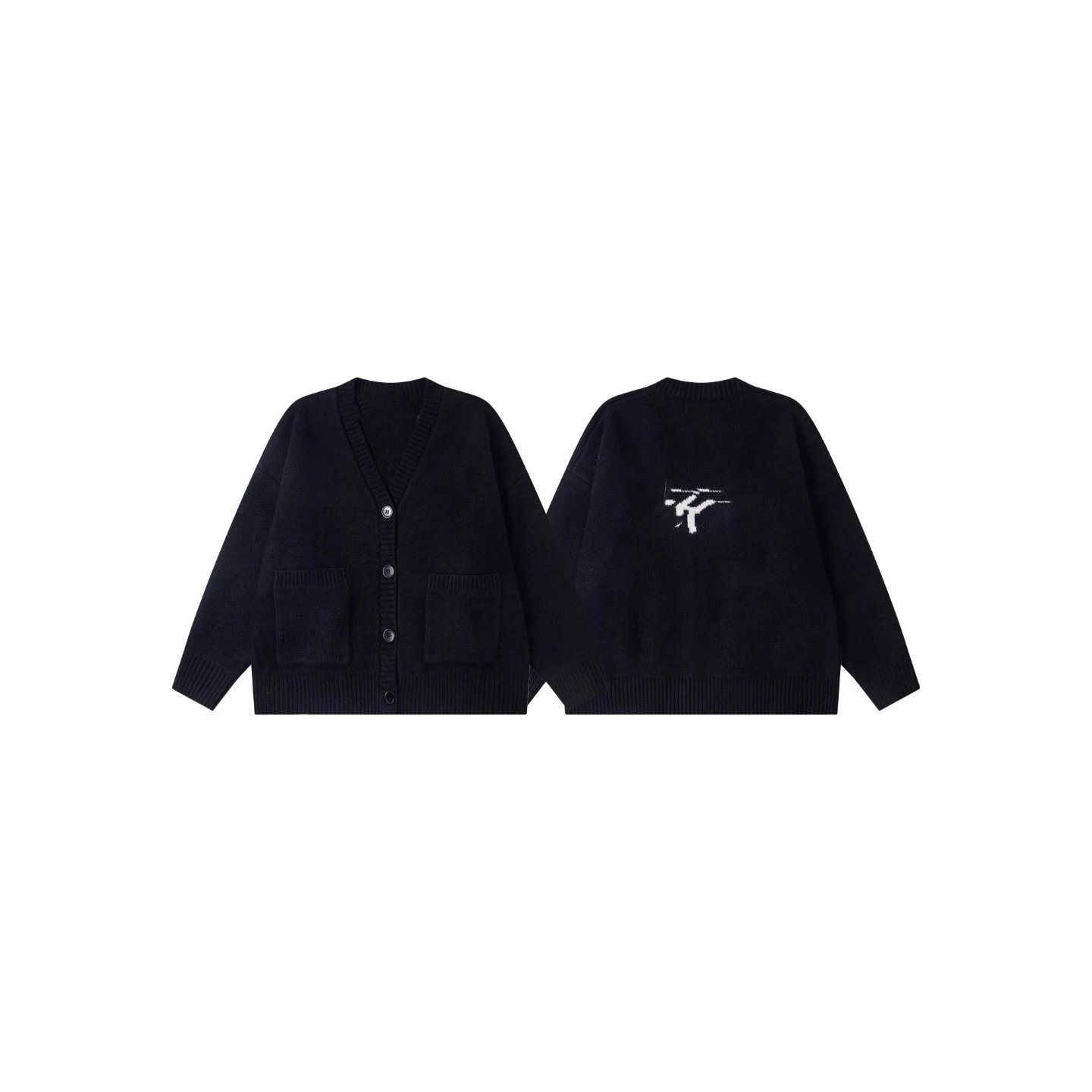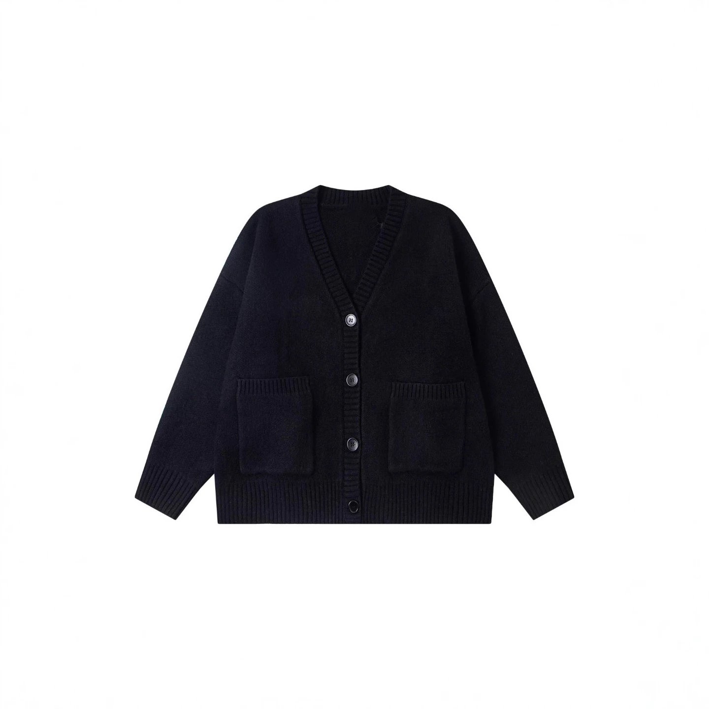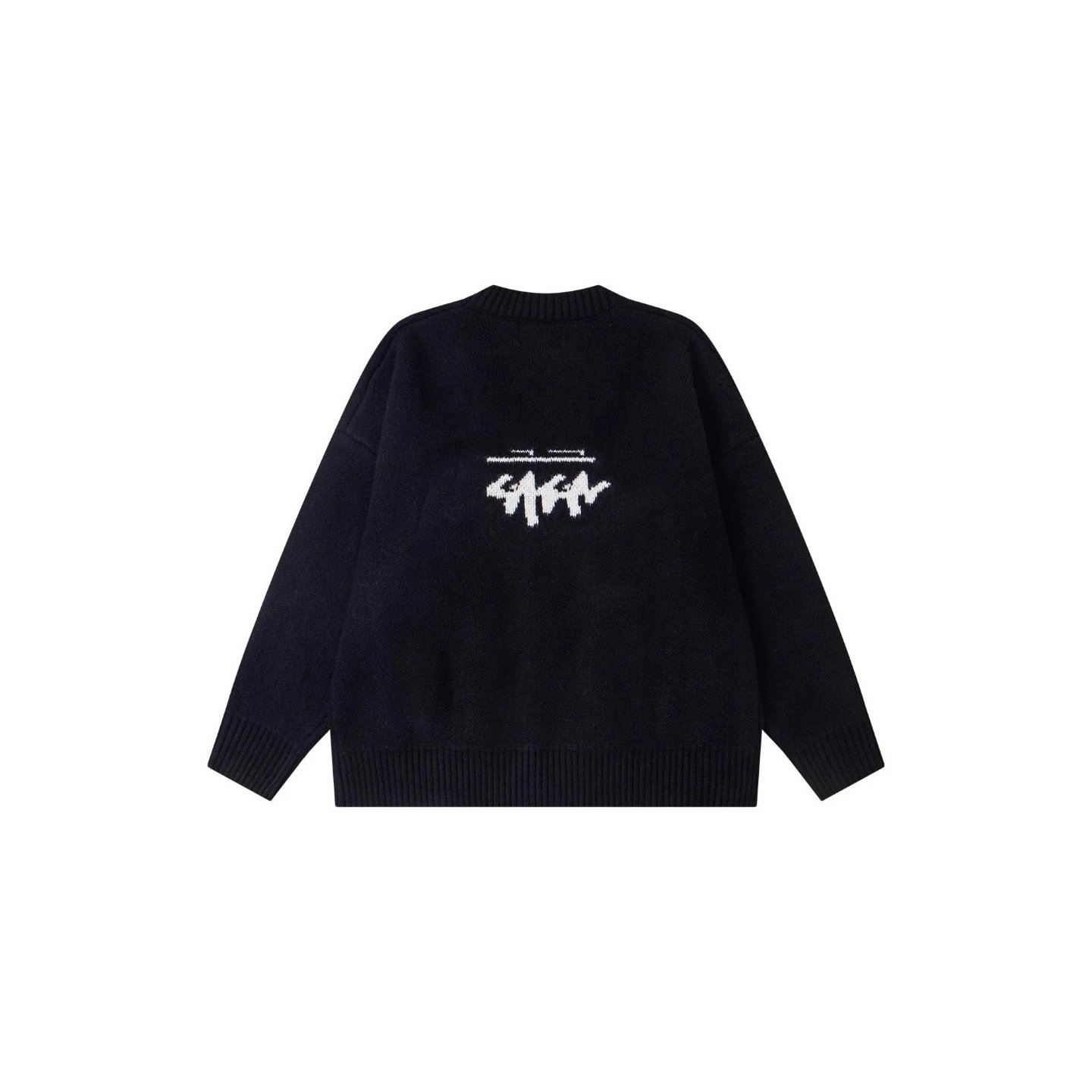 潮牌复古纯色V领单排扣后背印花长袖针织衫外套男女同款情侣