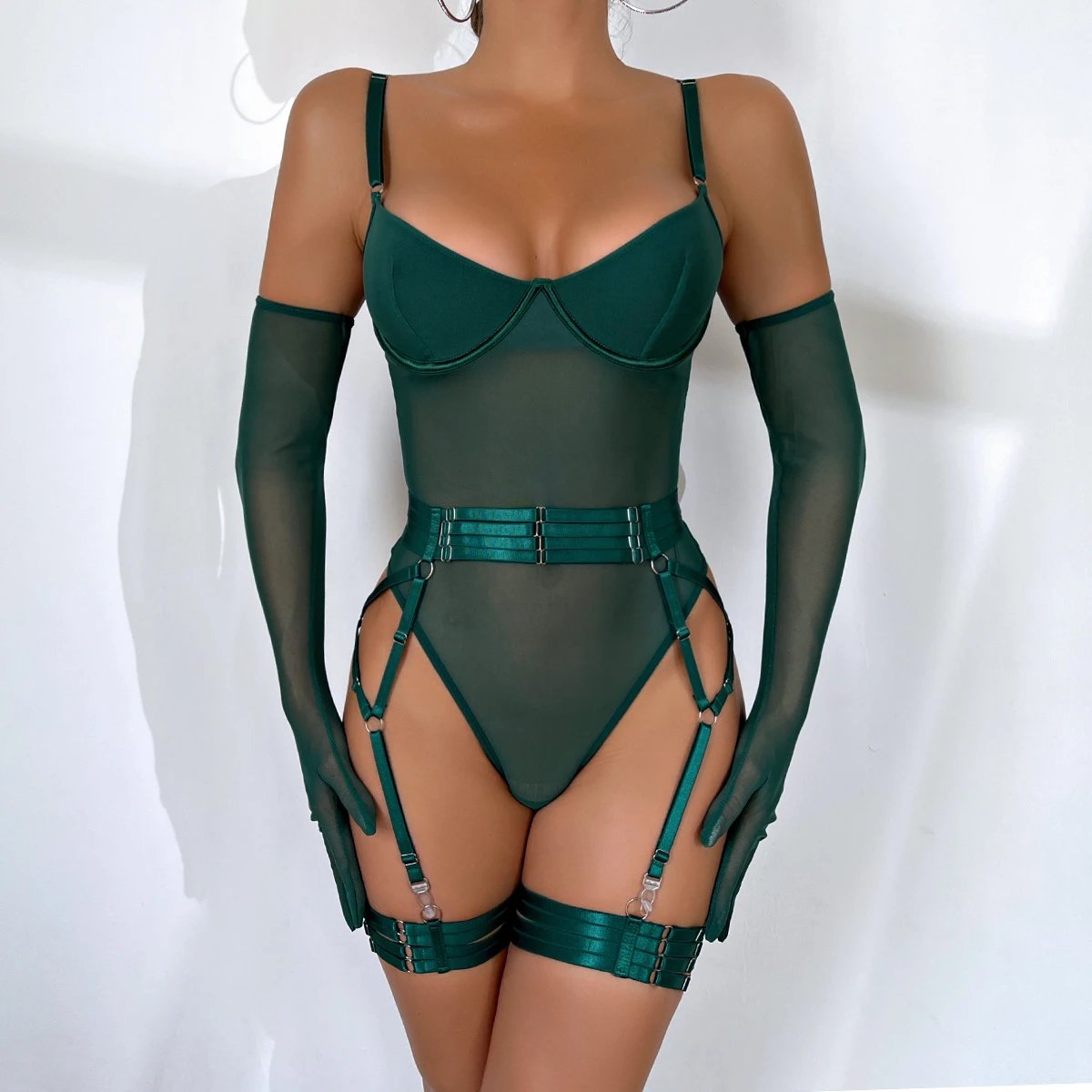 全托管热销性感内衣绑带拼接修身带手套三件套现货