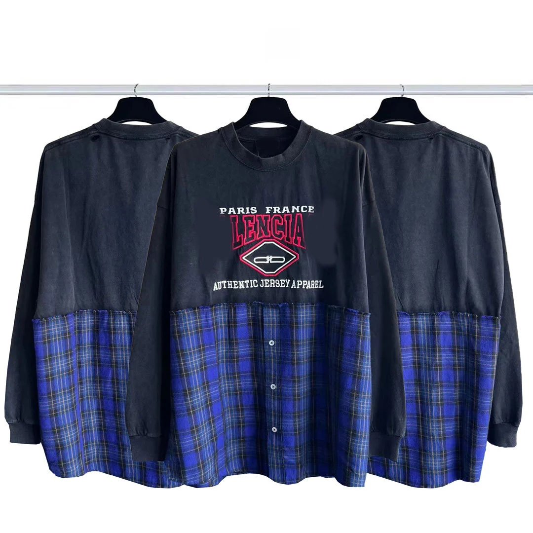 春秋新款潮流巴黎红色标语刺绣拼接衬衫套头卫衣长袖打底衫男