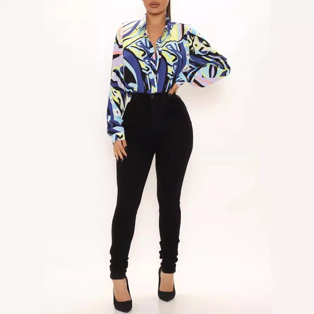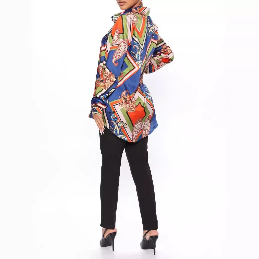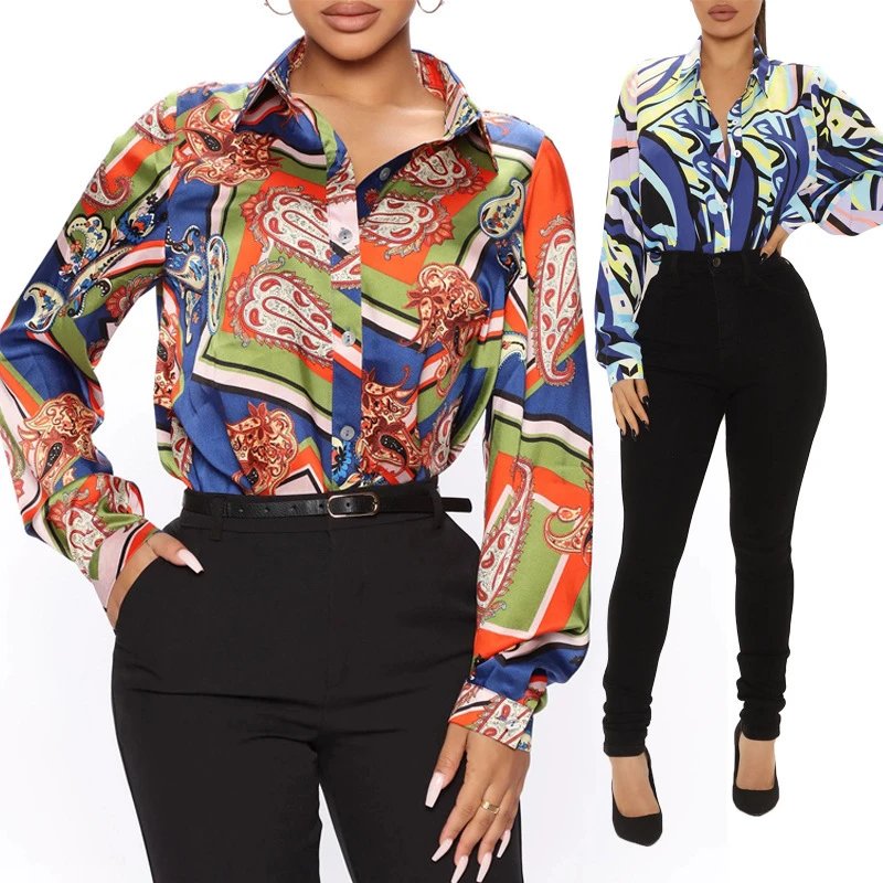 欧美亚马逊女装外贸爆款休闲气质翻领长袖衬衫女宽松印花上衣衬衣